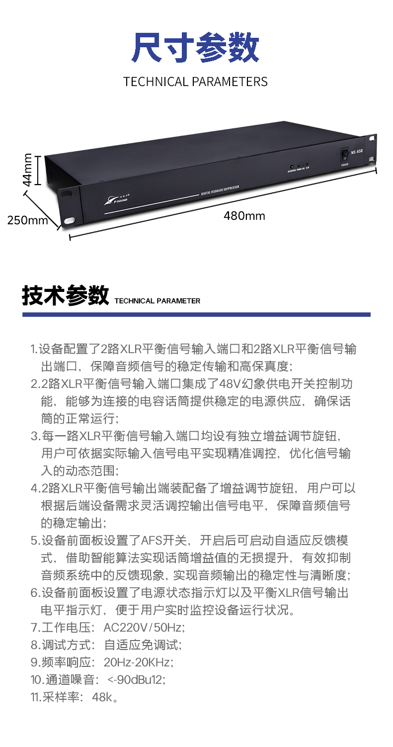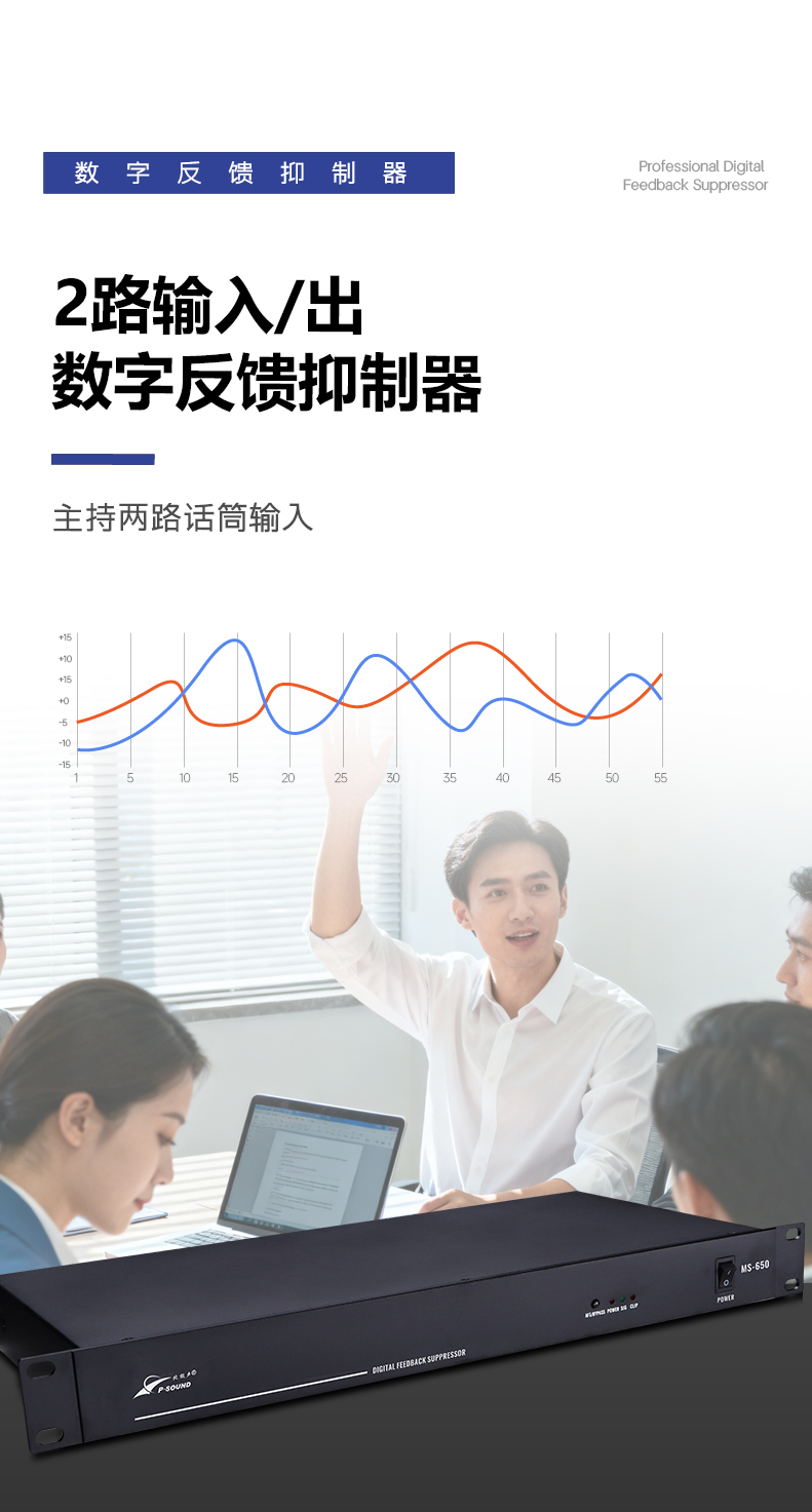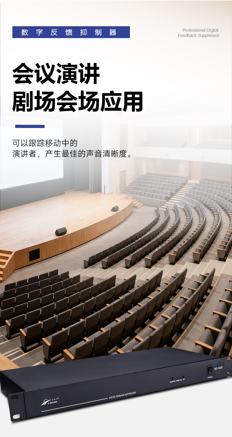 本设备融合了AFC自适应反馈抑制与AGC自动电平增益技术,可在不改变音质的前提下,轻松提高系统传声增益,特别适合各类会议使用。设备搭载全时自适应滤波器专利算法,用户只需一键操作即可进入工作模式,无需复杂调试。该算法能够自动适应其他音响设备和声学装饰环境,确保设备在不同声学环境下都能稳定运行。此外,设备具备强大的保护功能,能够极大限度地抑制回啸,能有效地防止烧坏音响设备和喇叭。