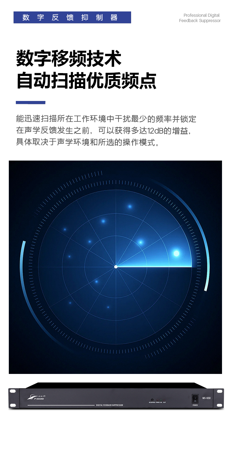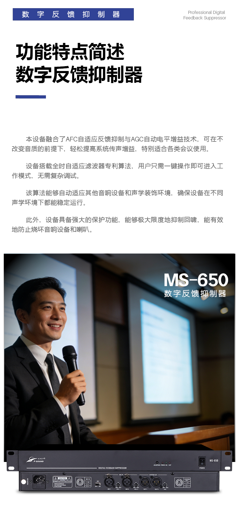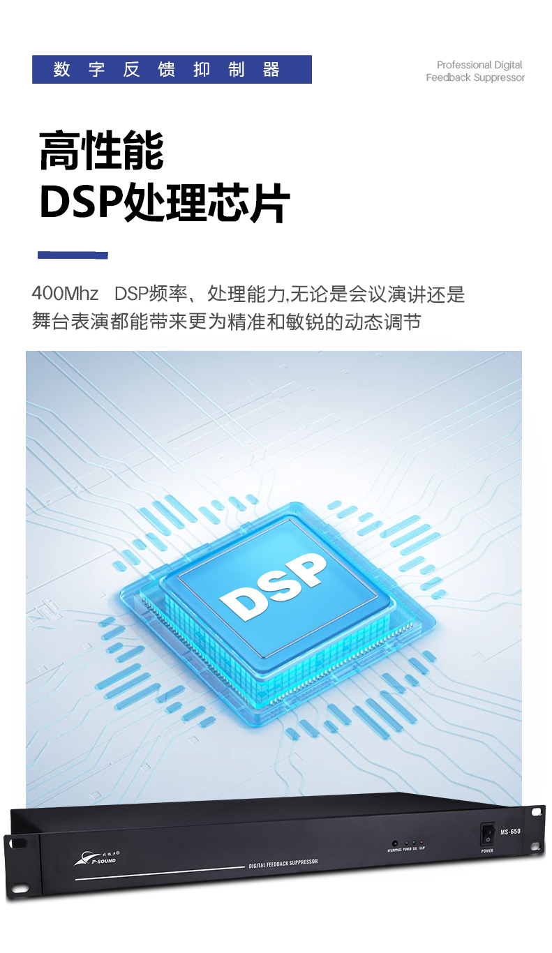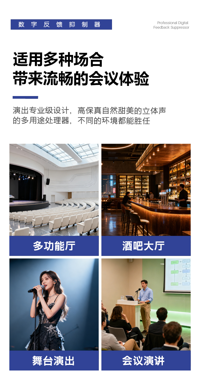 本设备融合了AFC自适应反馈抑制与AGC自动电平增益技术,可在不改变音质的前提下,轻松提高系统传声增益,特别适合各类会议使用。设备搭载全时自适应滤波器专利算法,用户只需一键操作即可进入工作模式,无需复杂调试。该算法能够自动适应其他音响设备和声学装饰环境,确保设备在不同声学环境下都能稳定运行。此外,设备具备强大的保护功能,能够极大限度地抑制回啸,能有效地防止烧坏音响设备和喇叭。