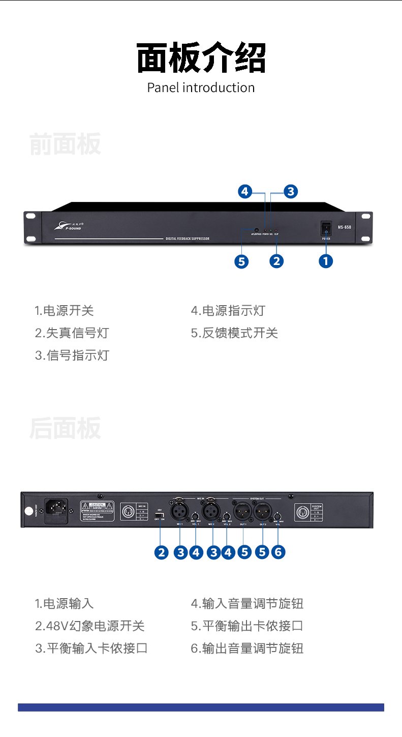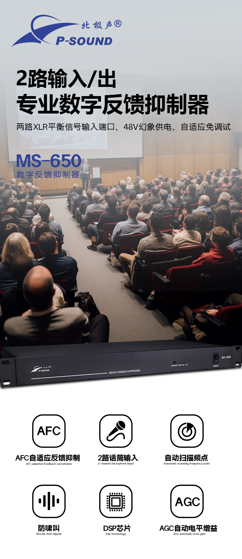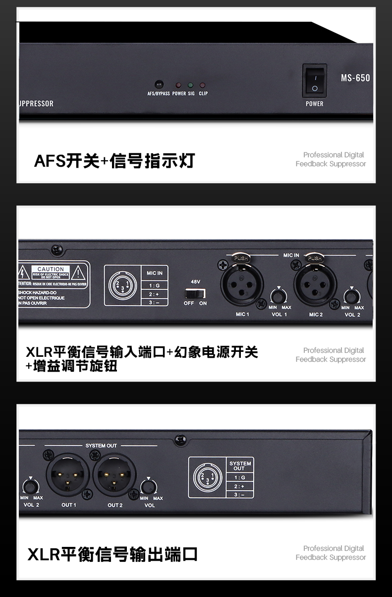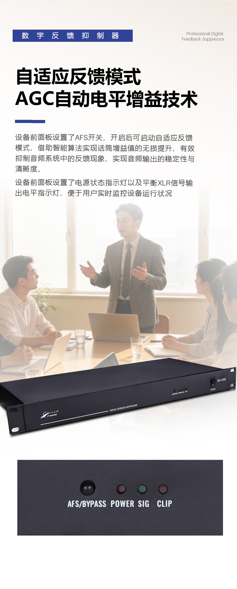 5.设备前面板设置了AFS开关,开启后可启动自适应反馈模式,借助智能算法实现话筒增益值的无损提升,有效抑制音频系统中的反馈现象,实现音频输出的稳定性与清晰度;