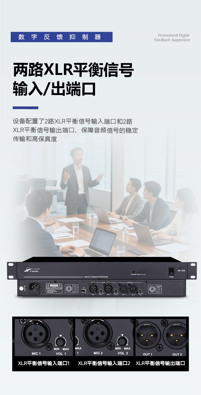 1.设备配置了2路XLR平衡信号输入端口和2路XLR平衡信号输出端口,保障音频信号的稳定传输和高保真度;