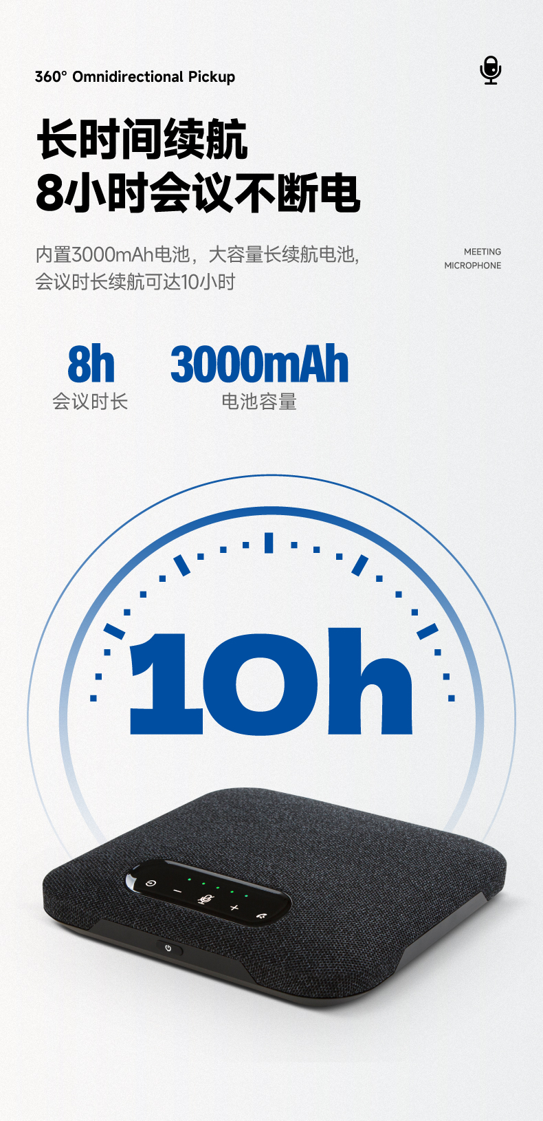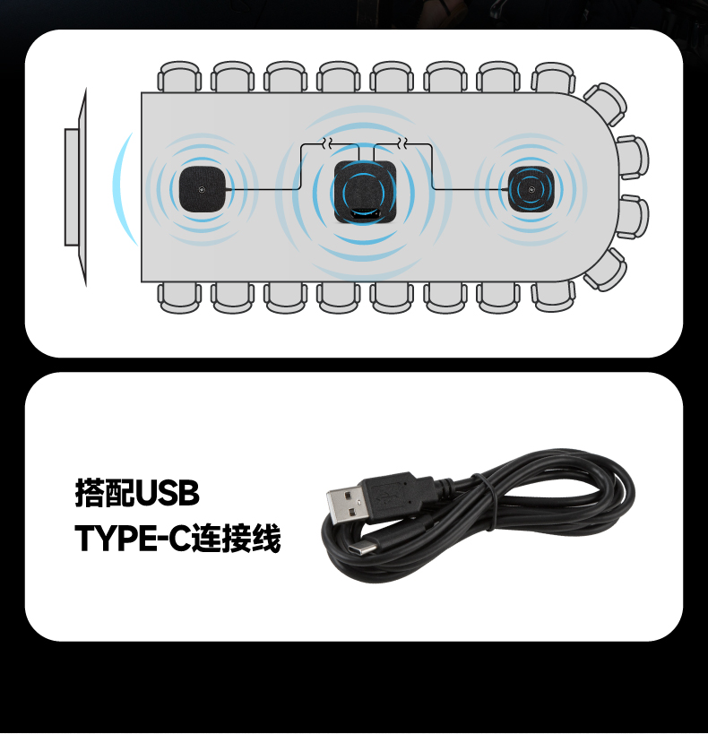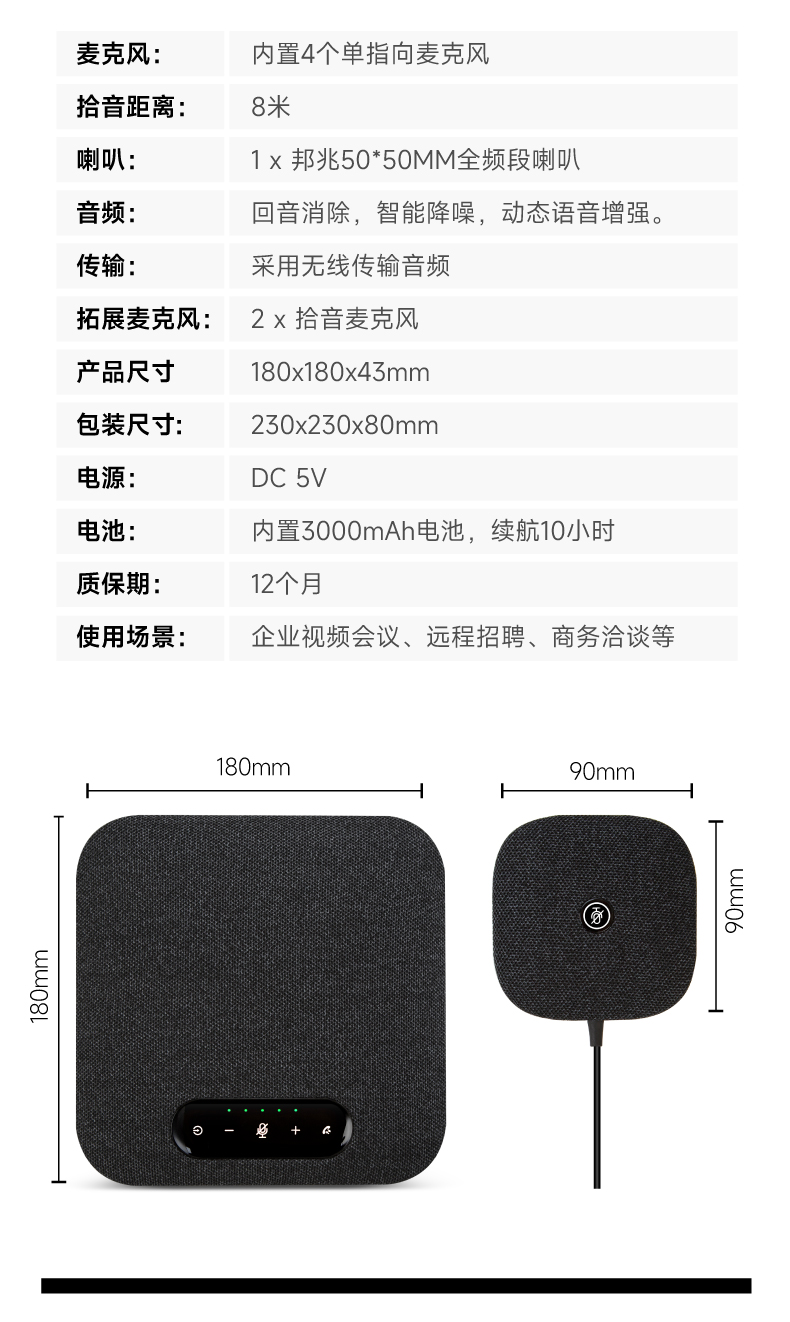 360°拾音:内置4个单指向麦克风,360°拾音,搭配拓展麦克风,拾音距离8米;