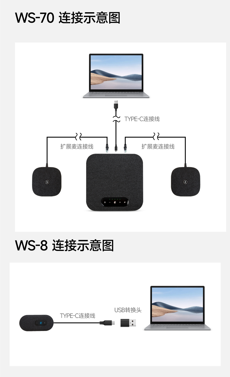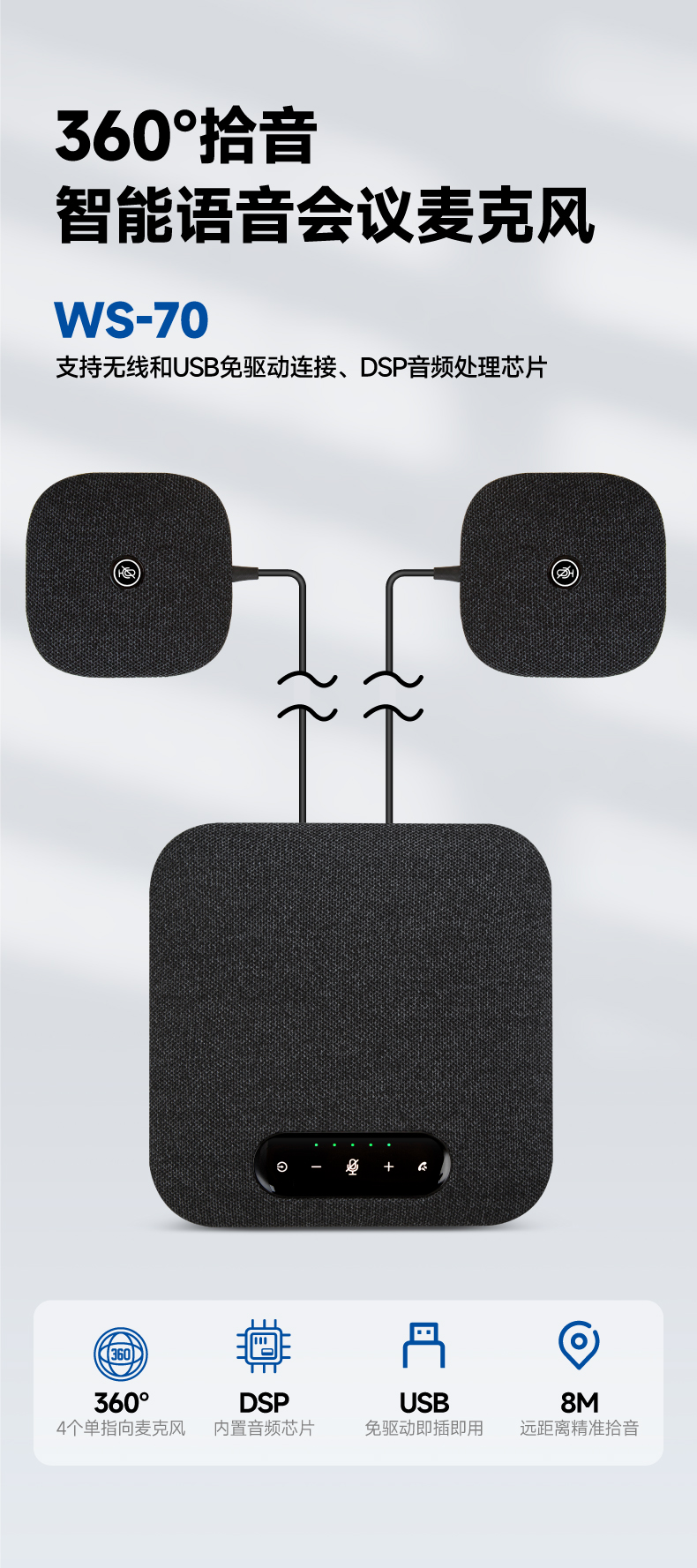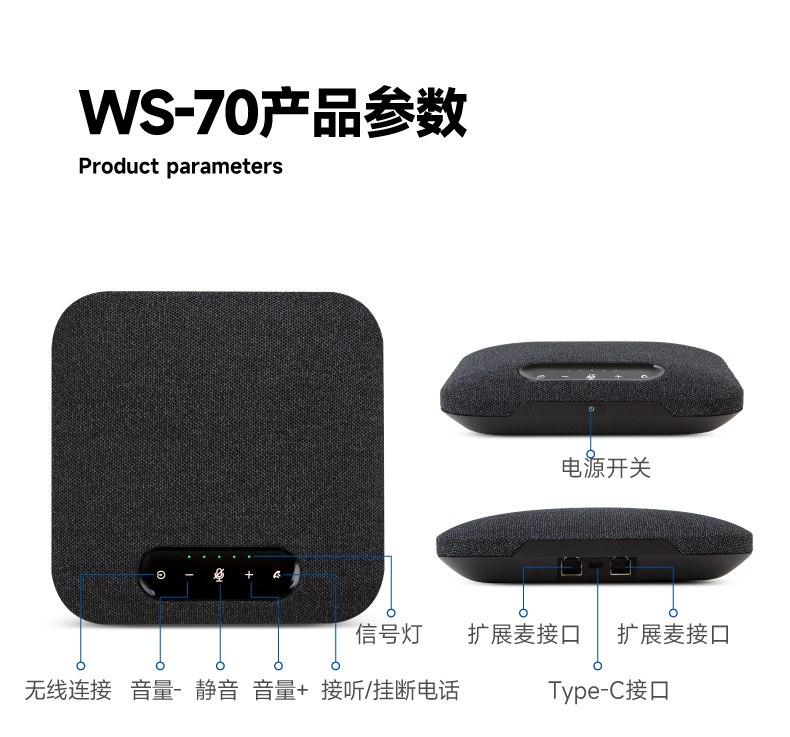 WS-70是一款蓝牙会议麦克风,该产品内置4个单指向麦克风、1个扬声器;搭配2个拓展麦克风用于中型会议室。WS-70能实现360°全方位拾音,拾音8米。支持无线和USB连接,快速实现团队沟通与协同作业,同时兼容大多数视频会议应用程序,大部分视频会议应用配合使用。