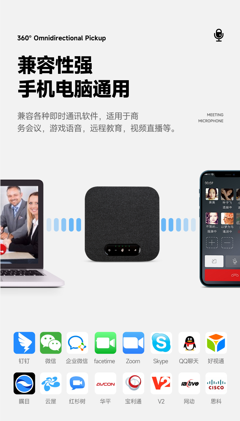 兼容系统:兼容Windows7/8/10、安卓、苹果多种不同操作系统,支持ZOOM、SKYPE、QQ、微信、钉钉等视频聊天软件,好视通、V2、瞩目、云屋、红杉树、网动、思科、华平、宝利通等专业会议软件。