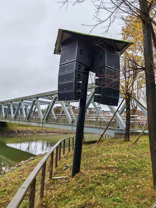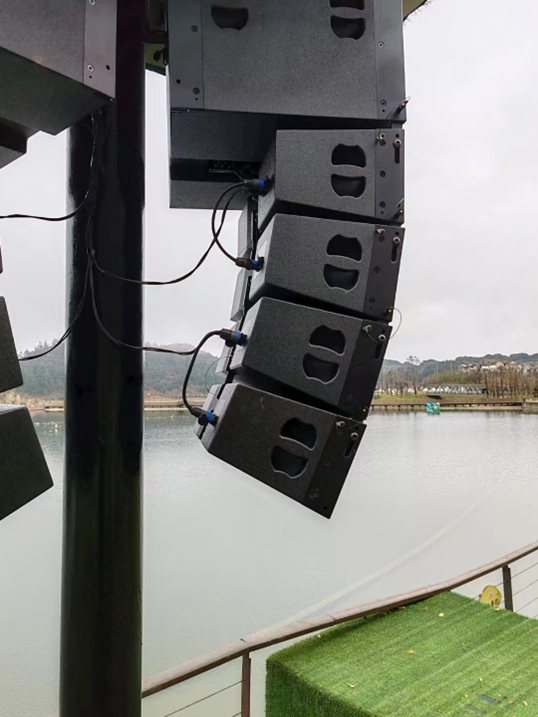 原有设备采用12寸专业音箱,音箱容易分散分布不均匀,声音转播距离不远,导致景区很多地方无法正常听到声音效果,后来经过我们技术人员现场勘查后,采用北极声双十寸MS-208线阵16+4组合 ,进驻重庆某景区户外演出 ,防水设计 ,在户外活动也有不一样效果。
