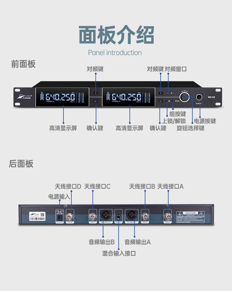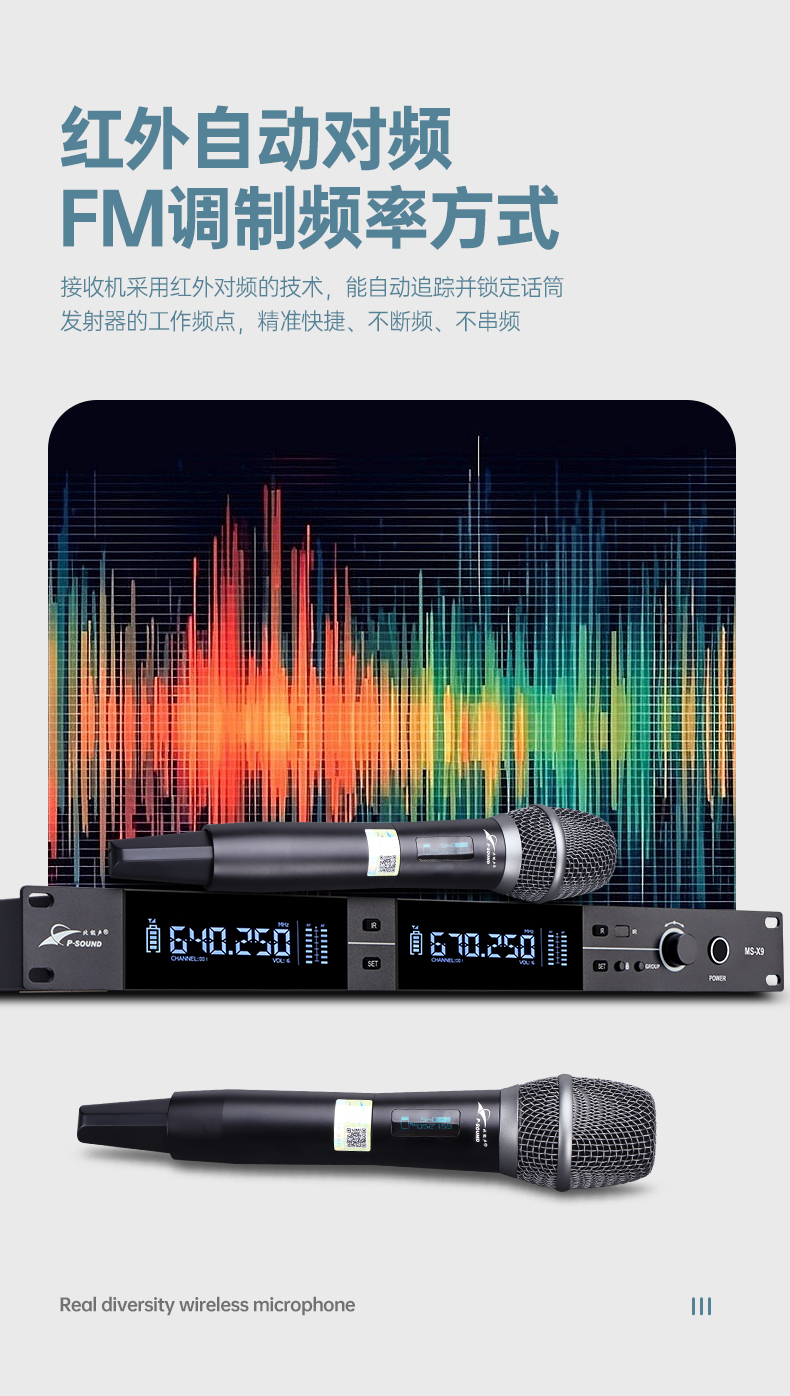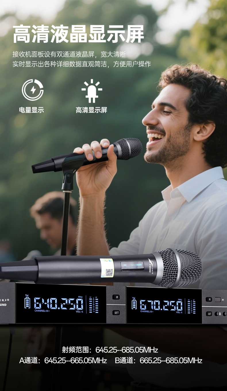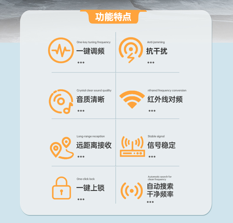 1.一键搜频,高效稳定:主机具备一键搜频功能,只需轻轻一按,便能快速搜索出干净的频率,极大程度地避免了信号干扰,有力保障了信号传输的稳定性;