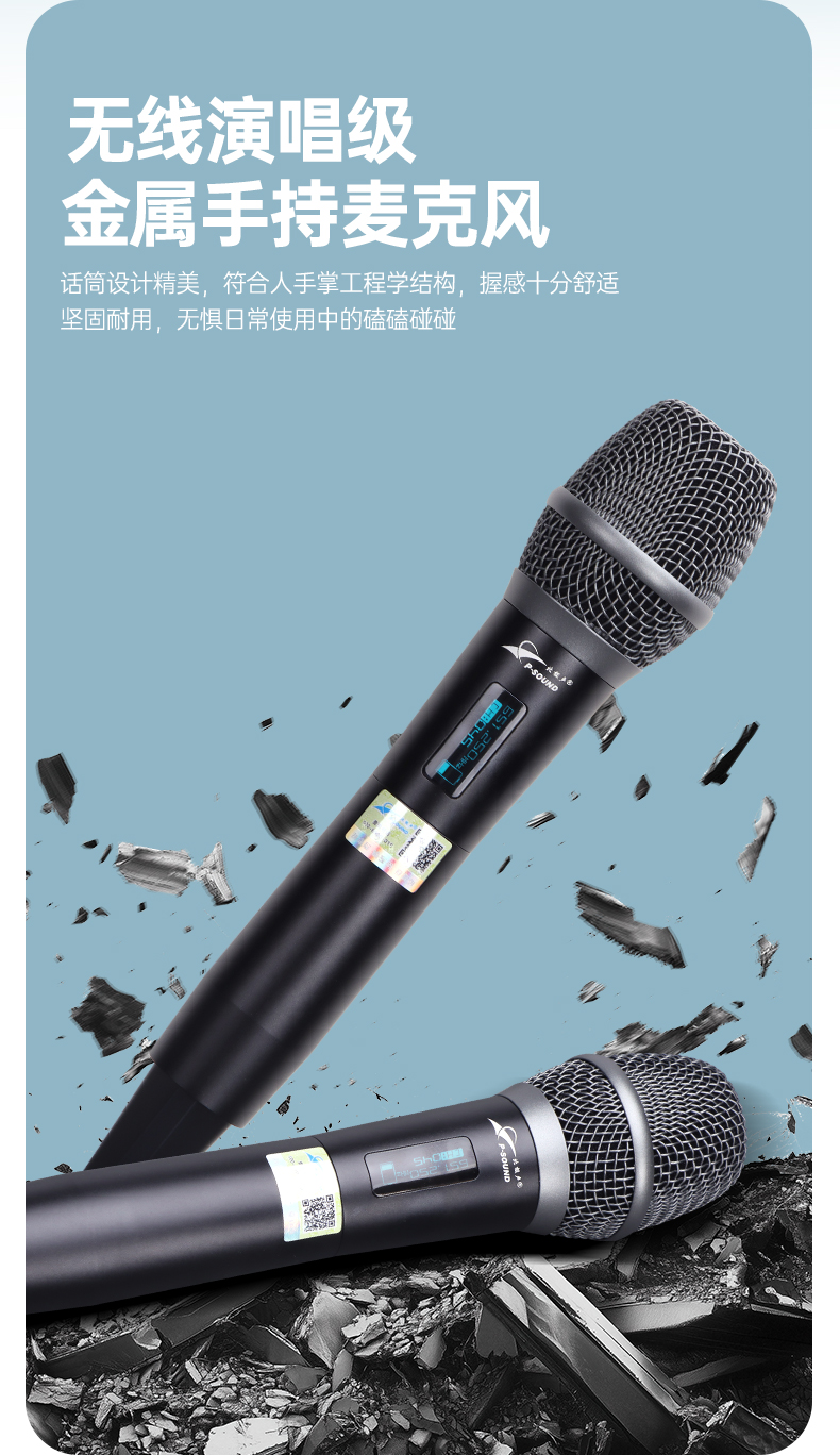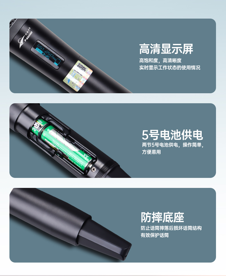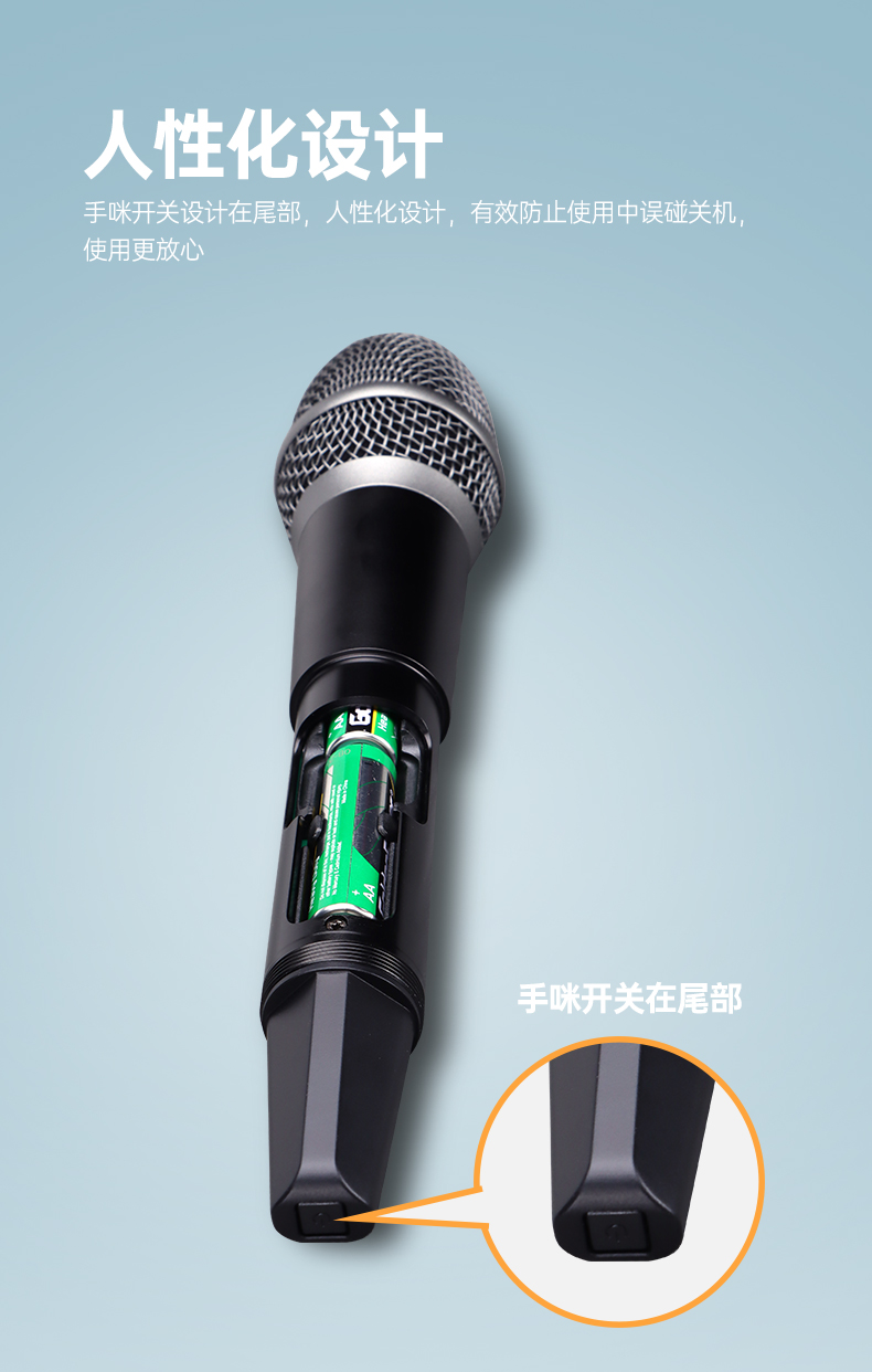 3.手持麦克风采用金属管体,坚固耐用,无惧日常使用中的磕磕碰碰。并且,其独特的外观设计已获得专利认证,开关设计在尾部,巧妙地避免了使用时因误触开关导致关麦的情况;