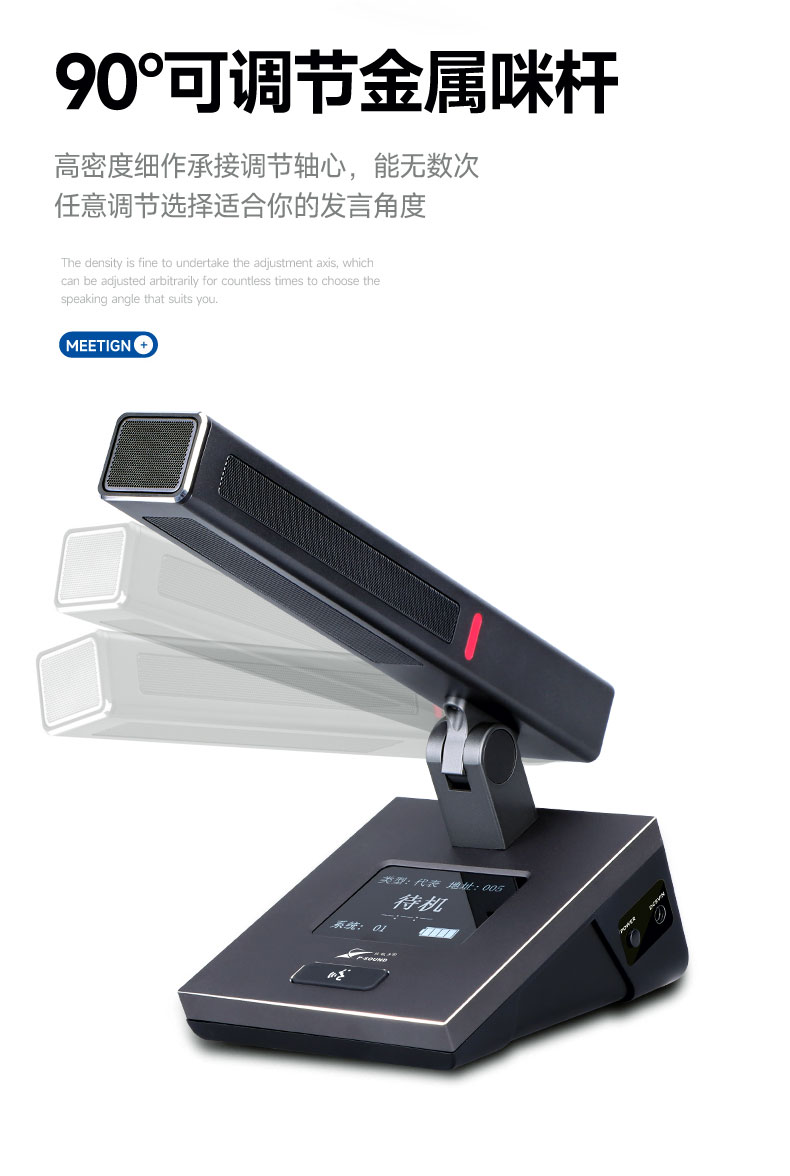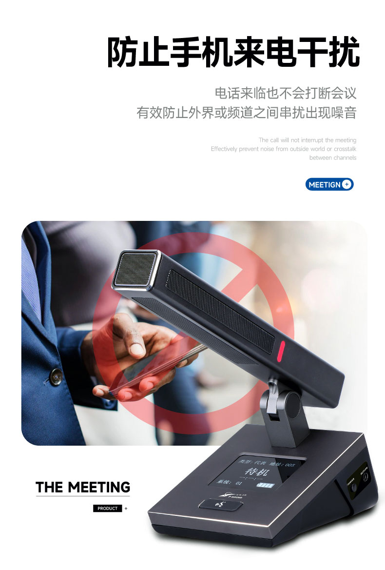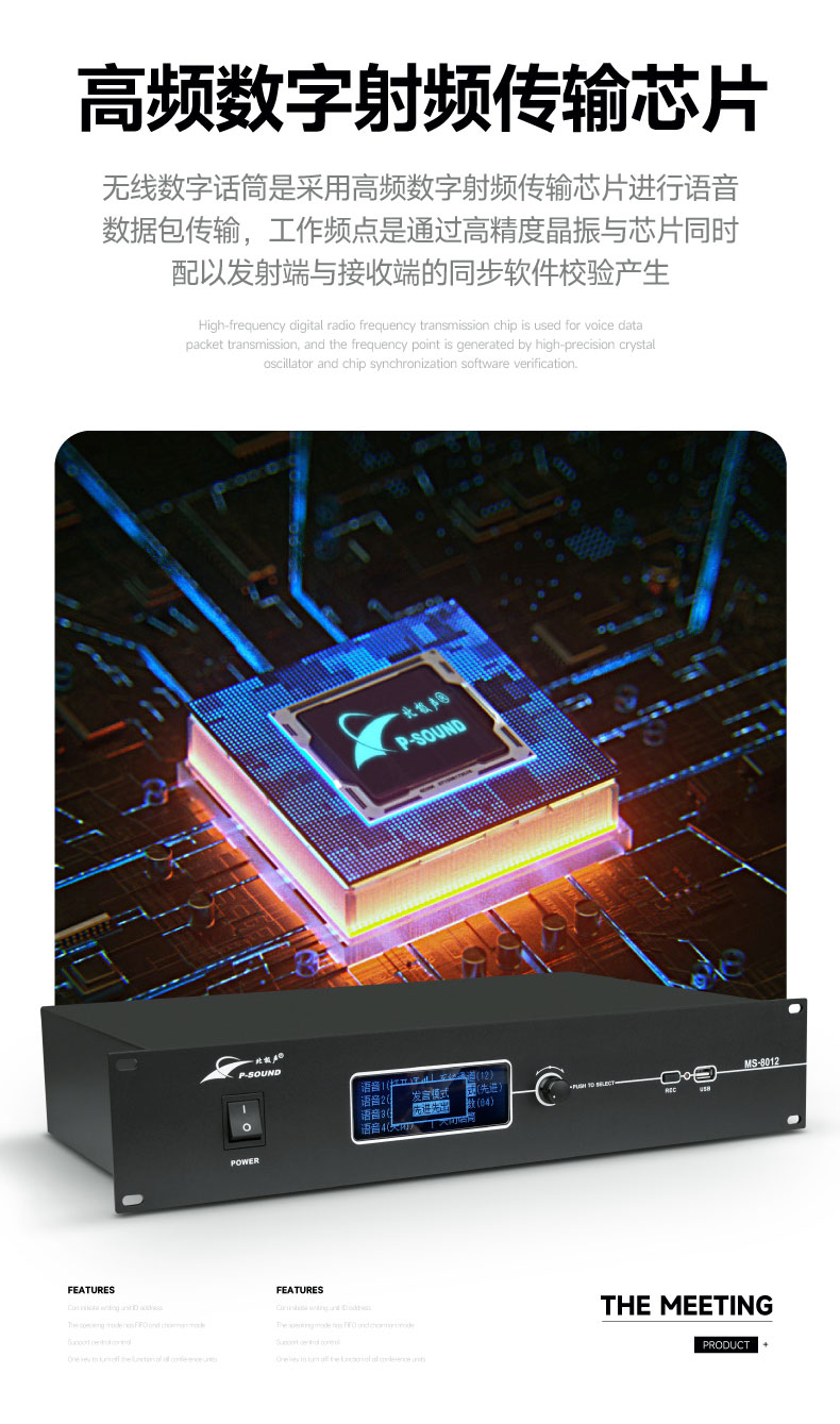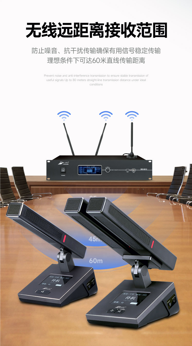 无线会议系统利用强大的MCU管理功能,使用4支发言话筒占用一个频点来工作,在接收器的数据包时钟周期内依次解调出一个发射单元的音频,彻底地避免了模拟无线一拖八会议的多发射频点占用、以及多频点工作产生的二次、三次互调干扰频点造成的串频干扰;