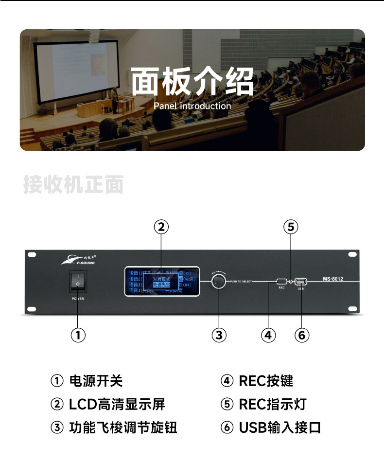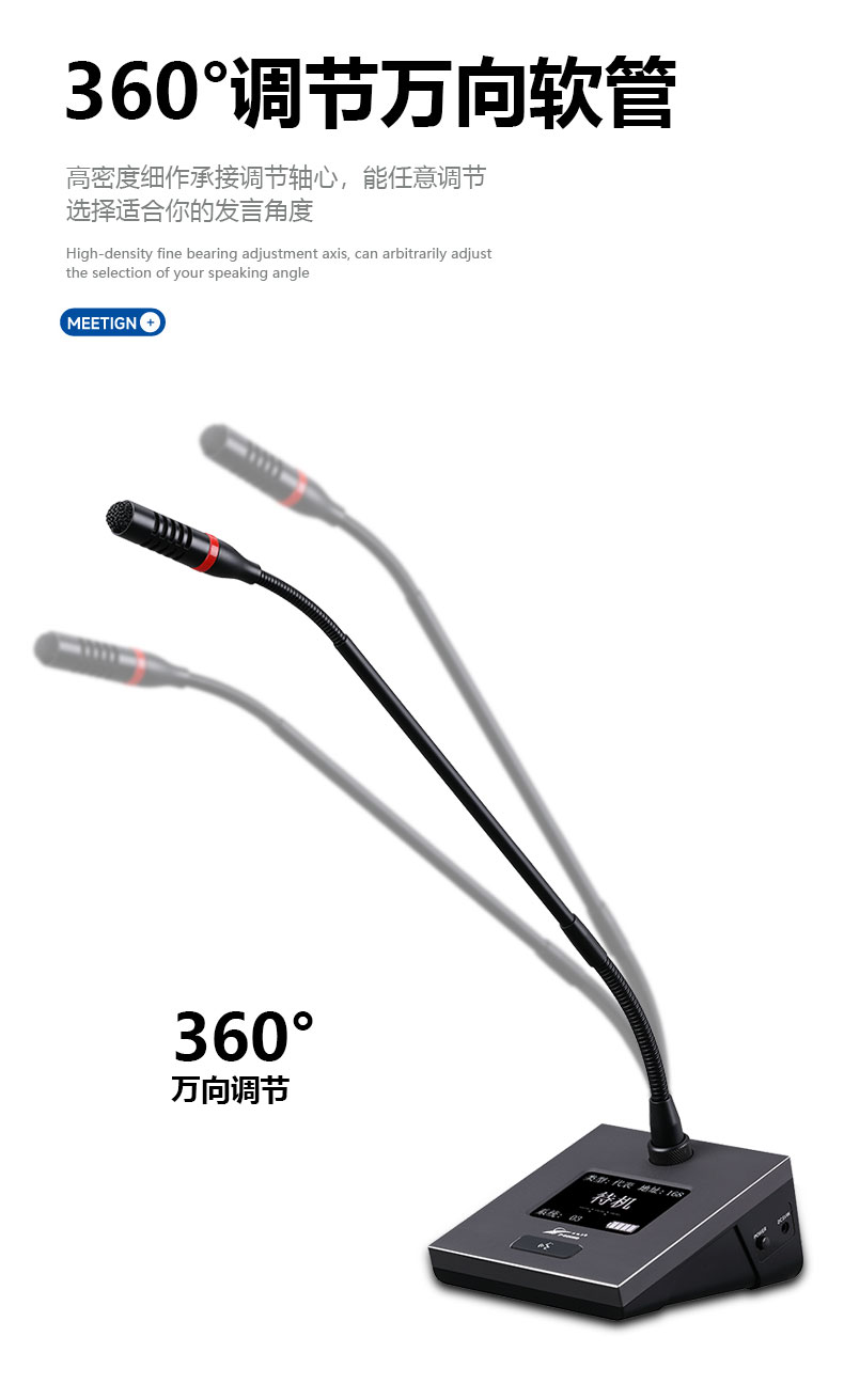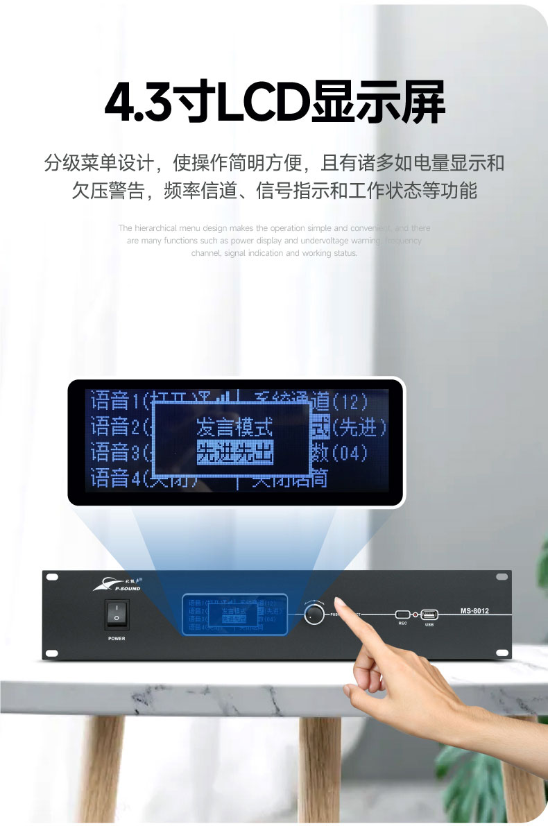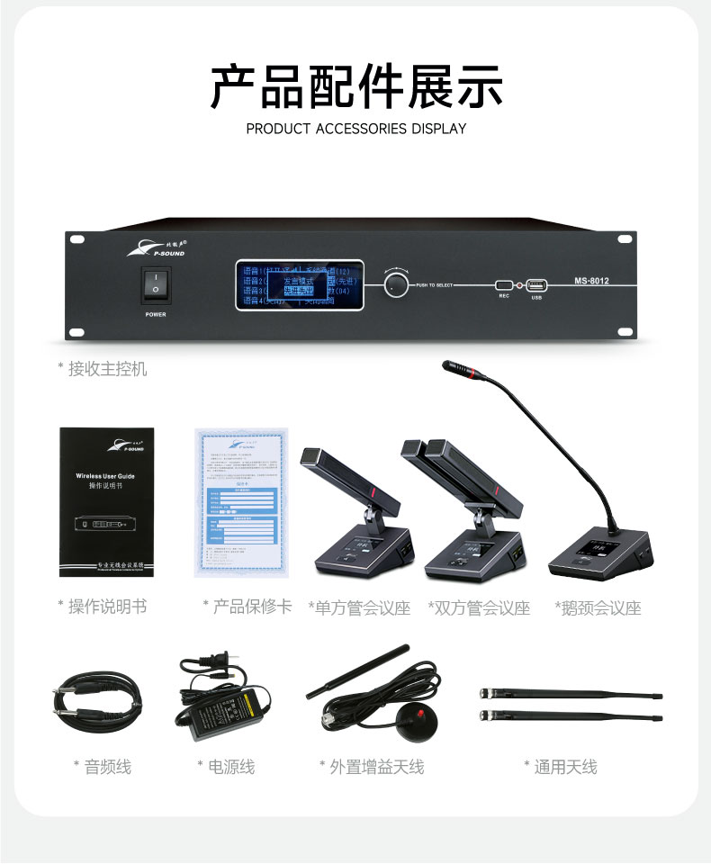 无线会议系统利用强大的MCU管理功能,使用4支发言话筒占用一个频点来工作,在接收器的数据包时钟周期内依次解调出一个发射单元的音频,彻底地避免了模拟无线一拖八会议的多发射频点占用、以及多频点工作产生的二次、三次互调干扰频点造成的串频干扰;