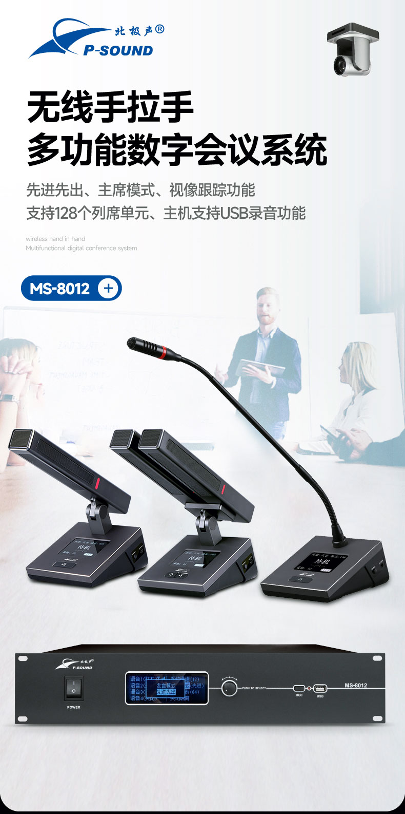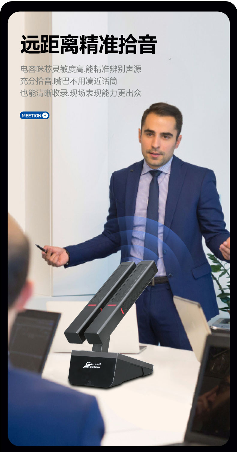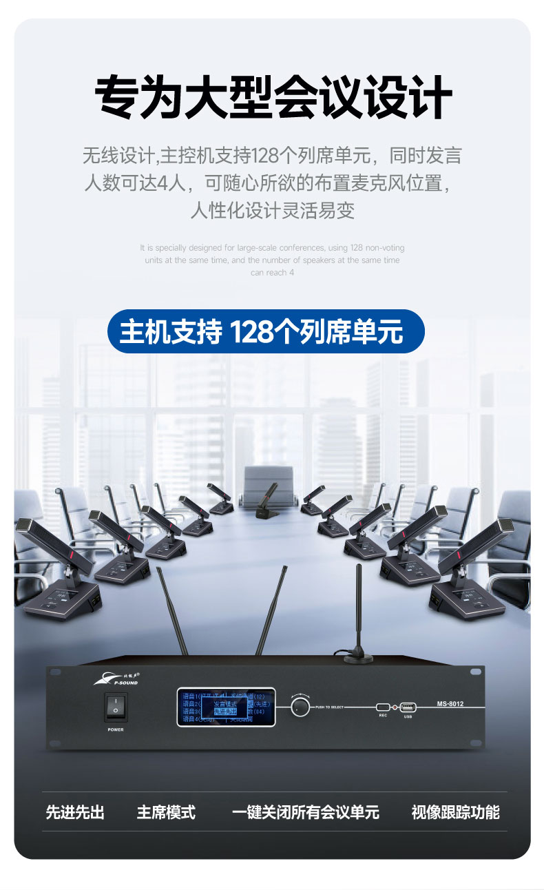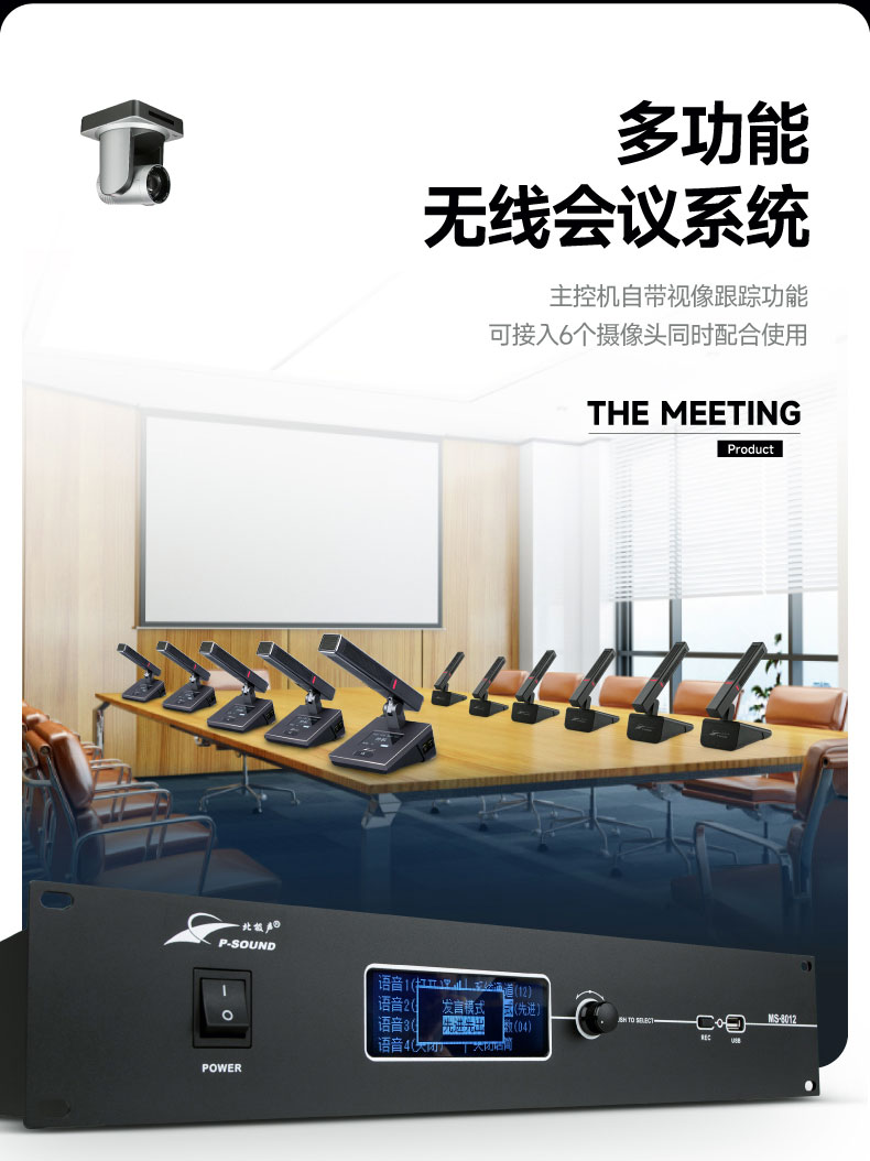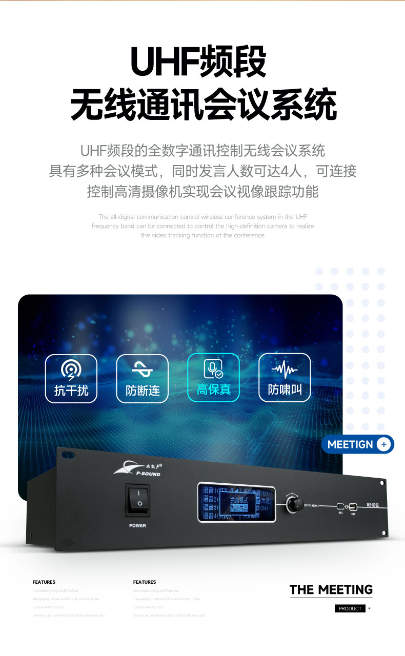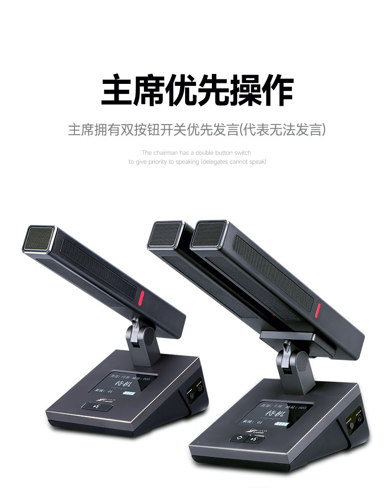 本系列是一套基于UHF频段的全数字通讯控制无线会议系统,具有多种会议模式,同时发言人数可达4人,可连接控制高清摄像机实现会议视像跟踪功能;列席单元供电使用5号电池,既方便又环保;本系统操作简便、直观而易用,无需一切的现场调控,只需要打开电源就足够,如此商务、轻巧、强劲的无线会议系统便由此诞生。