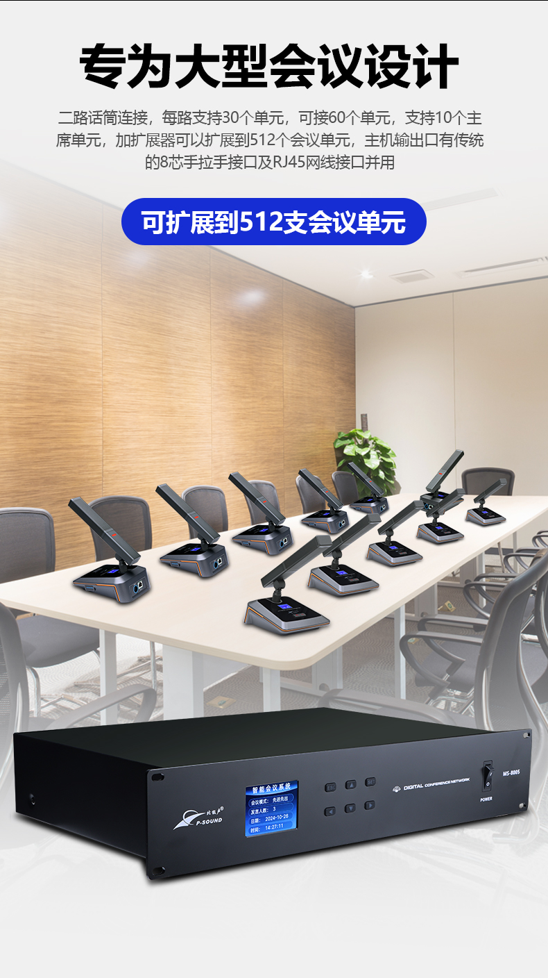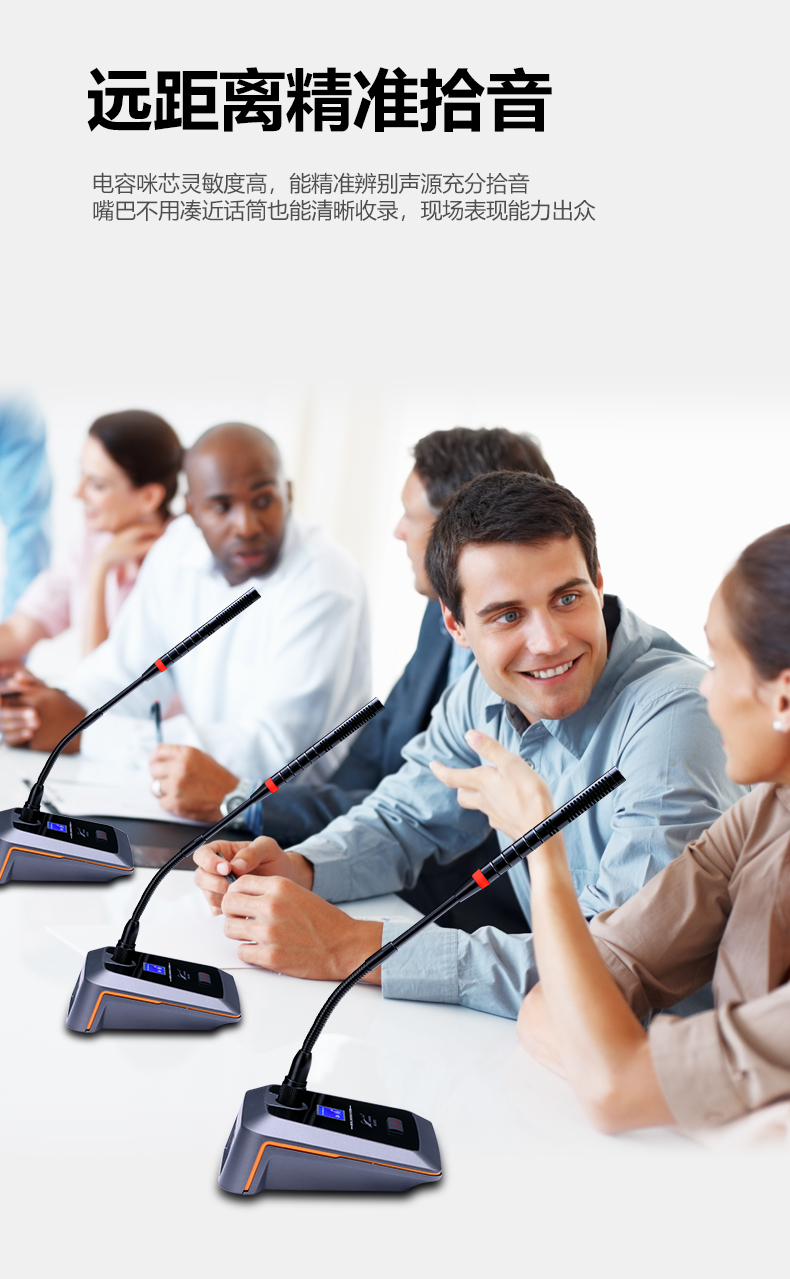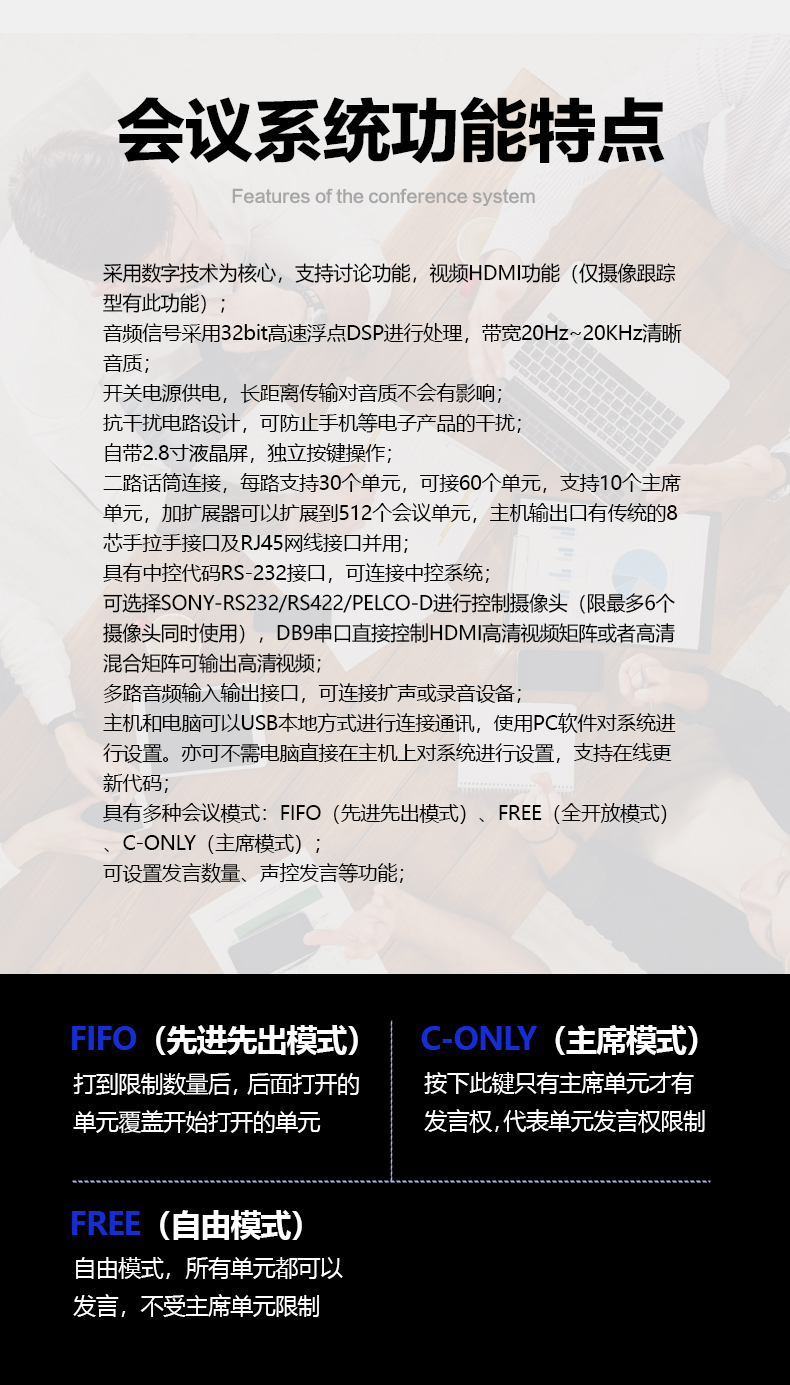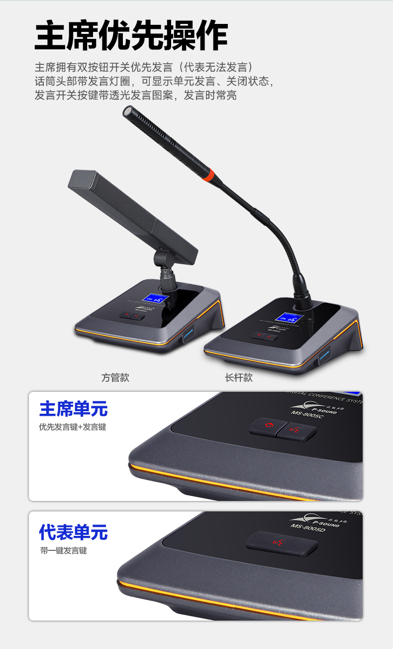 支持多个主席单元,连接时不受位置限制可任意安装,具有全权控制会议秩序的优先功能,可控制会议气氛;
