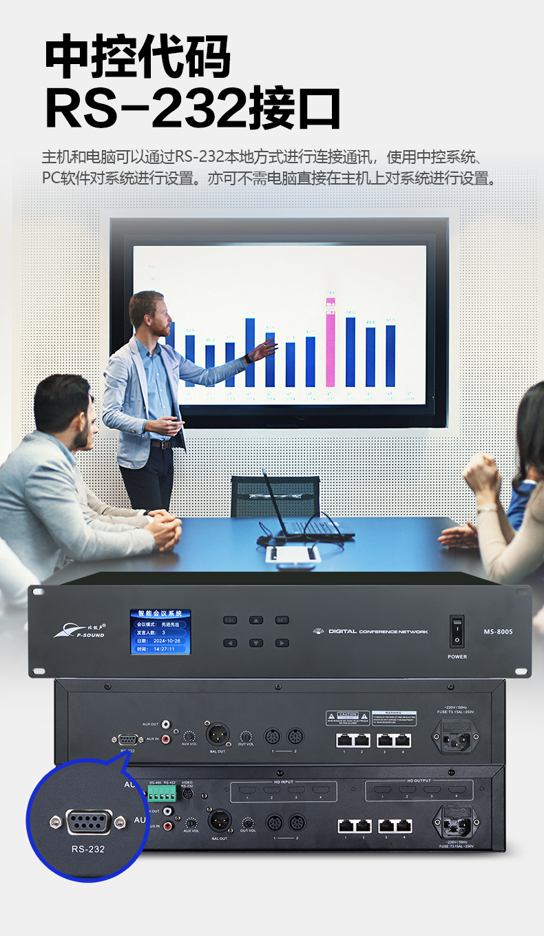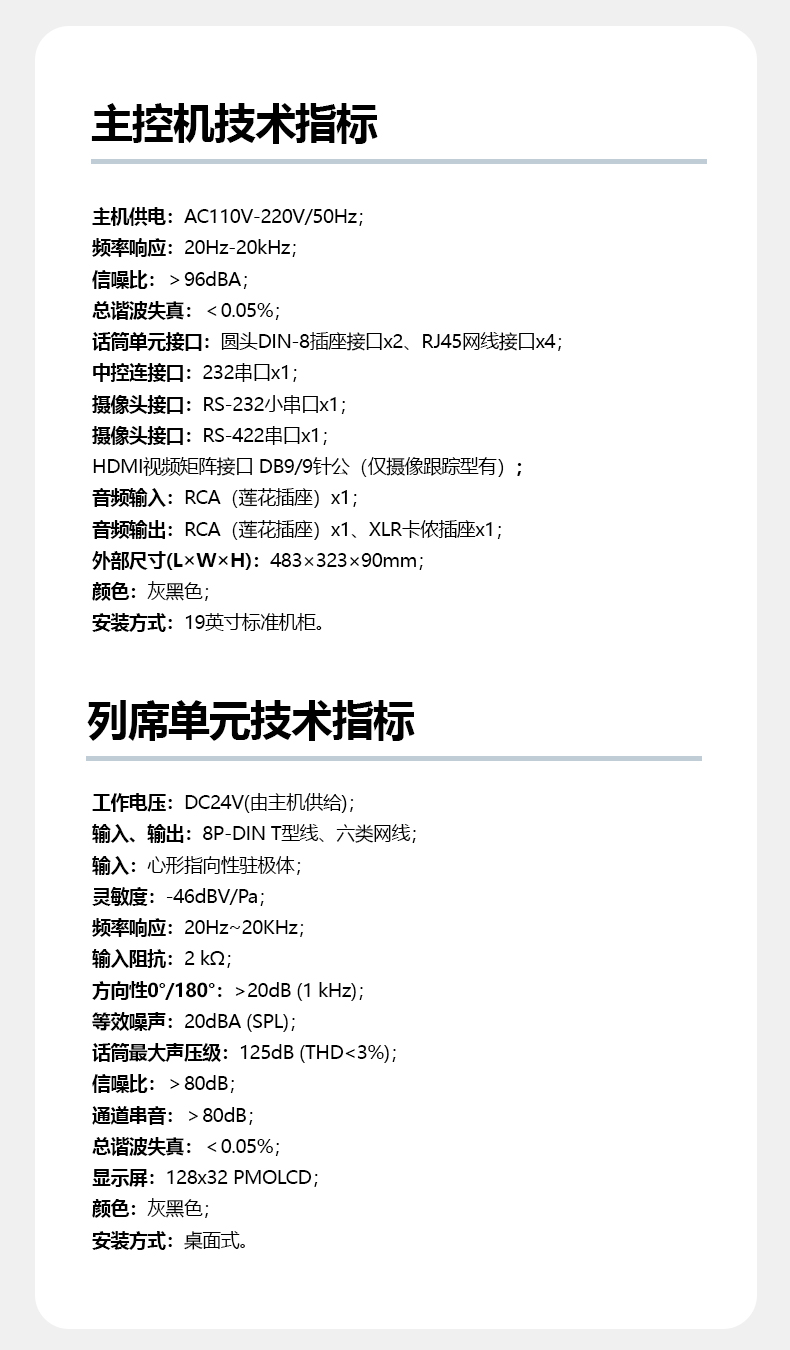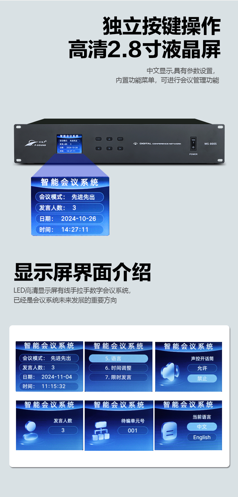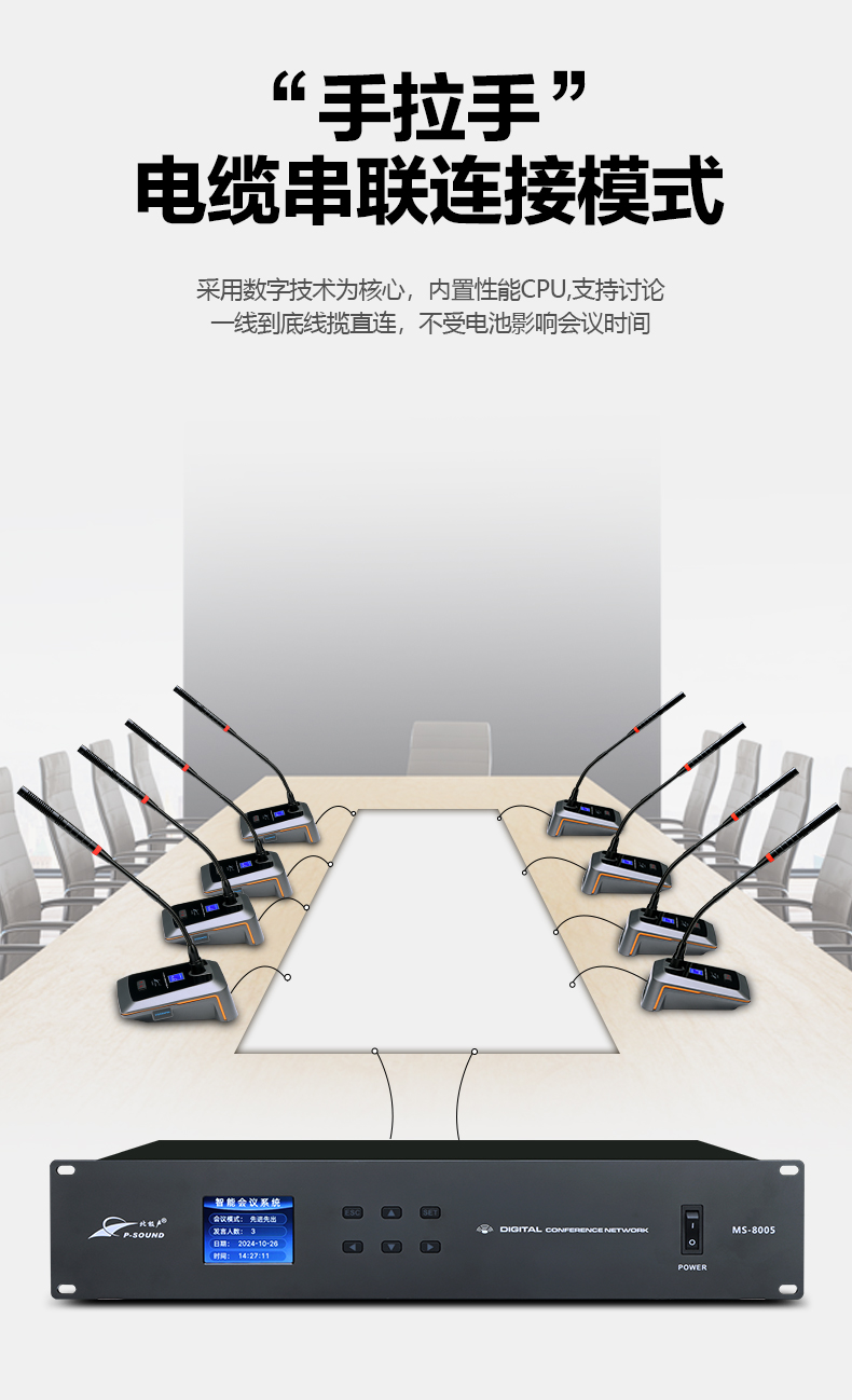 支持多个主席单元,连接时不受位置限制可任意安装,具有全权控制会议秩序的优先功能,可控制会议气氛;