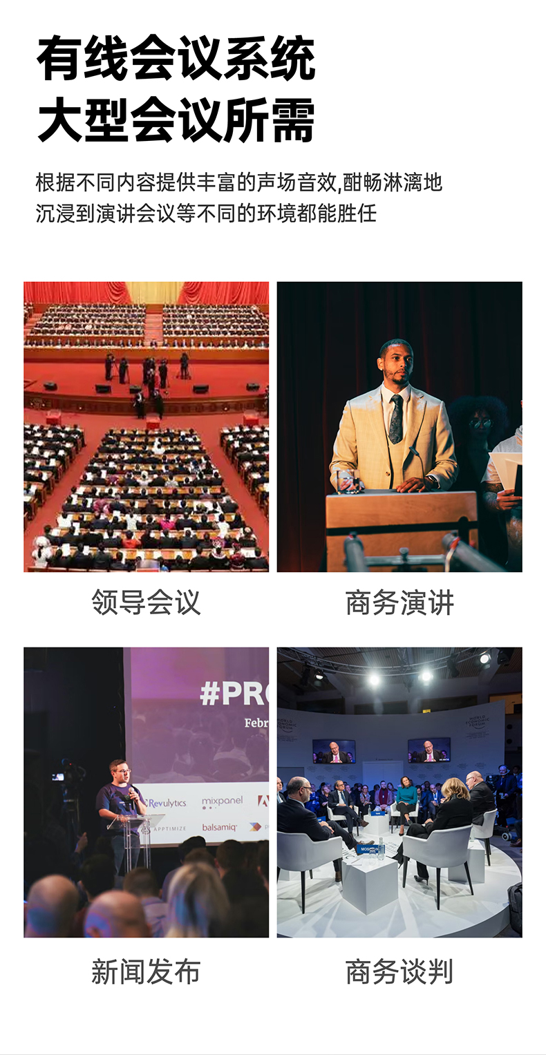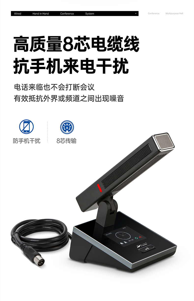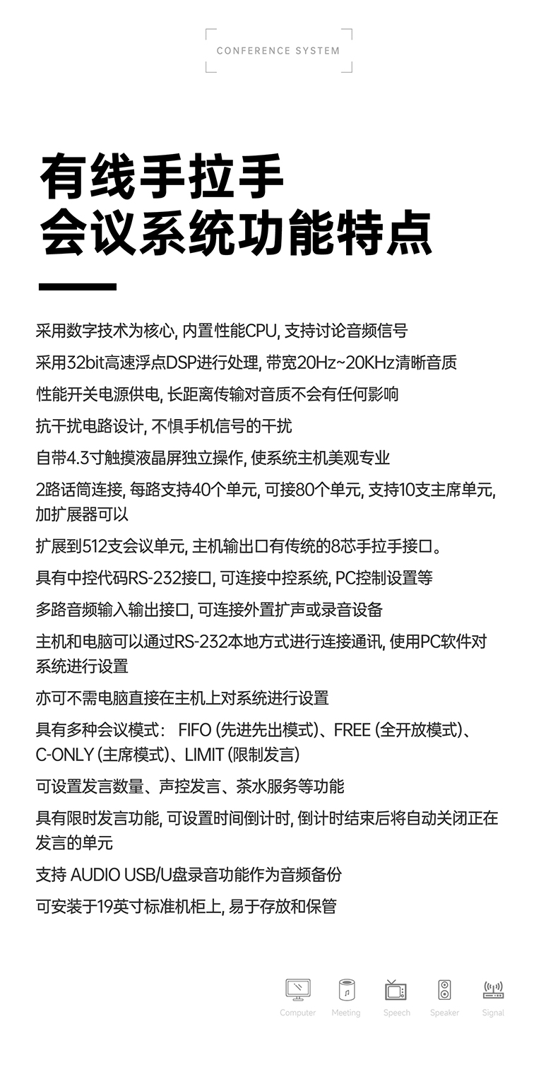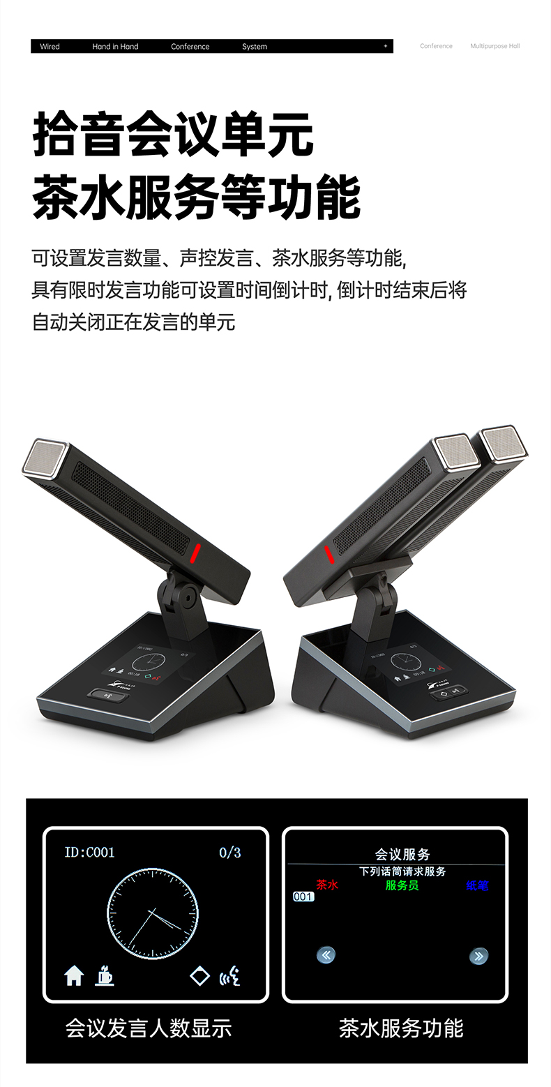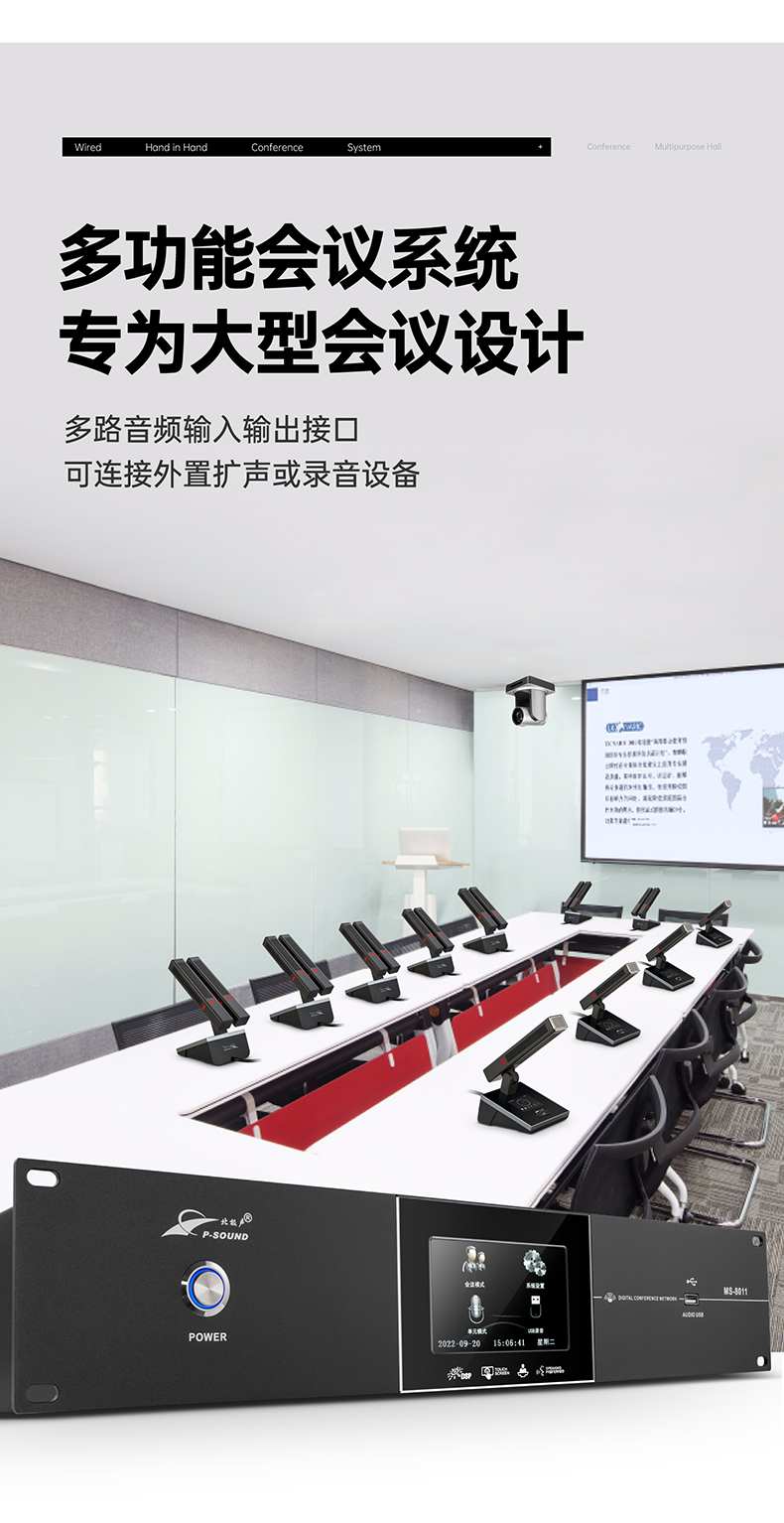 支持多个主席单元,连接时不受位置限制可任意安装,具有全权控制会议秩序的优先功能,可控制会议气氛;
