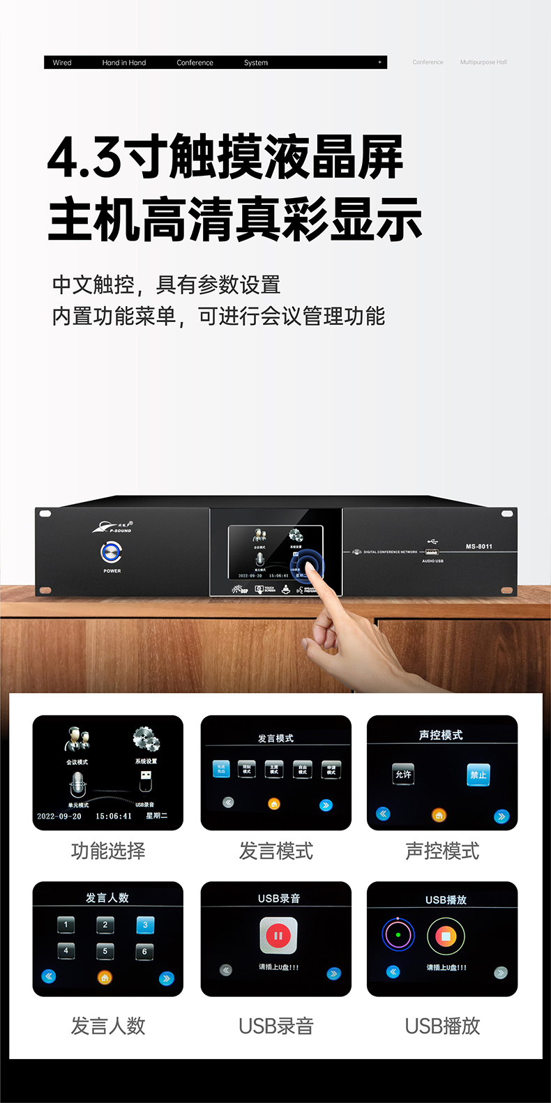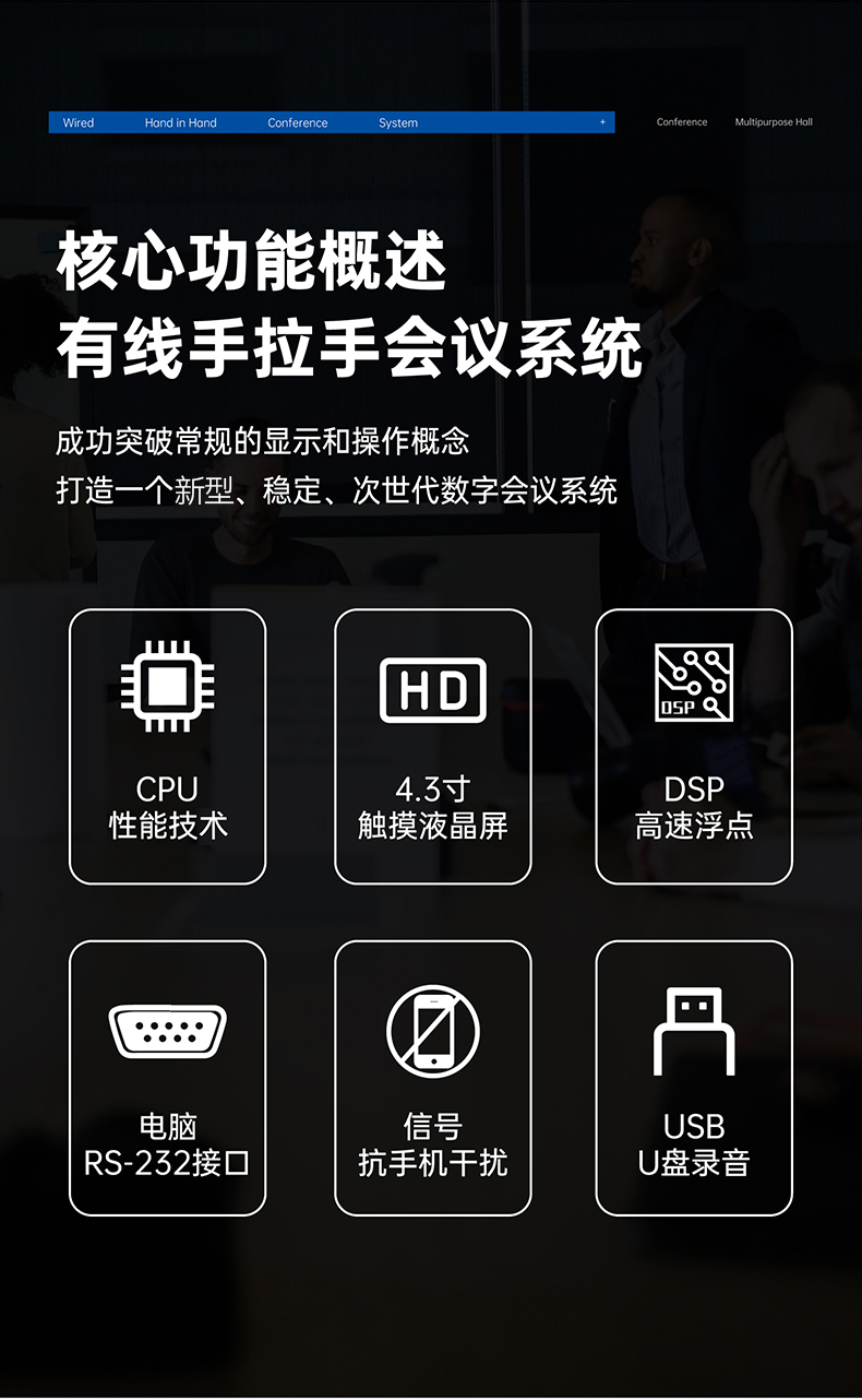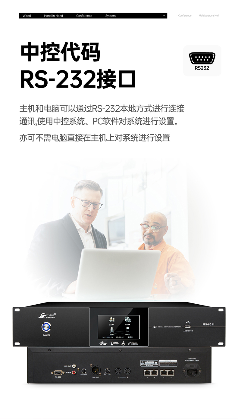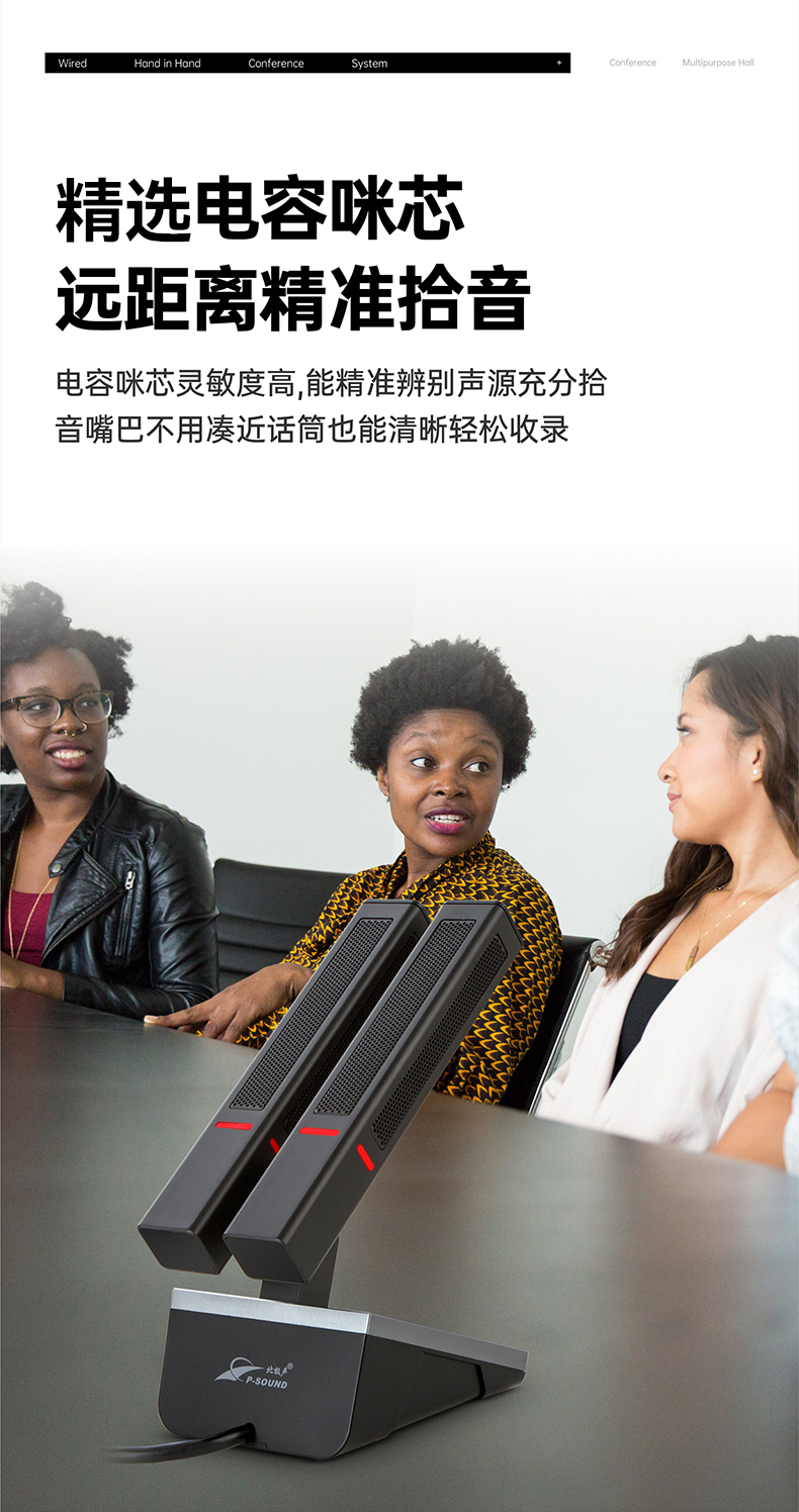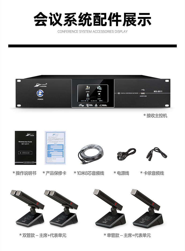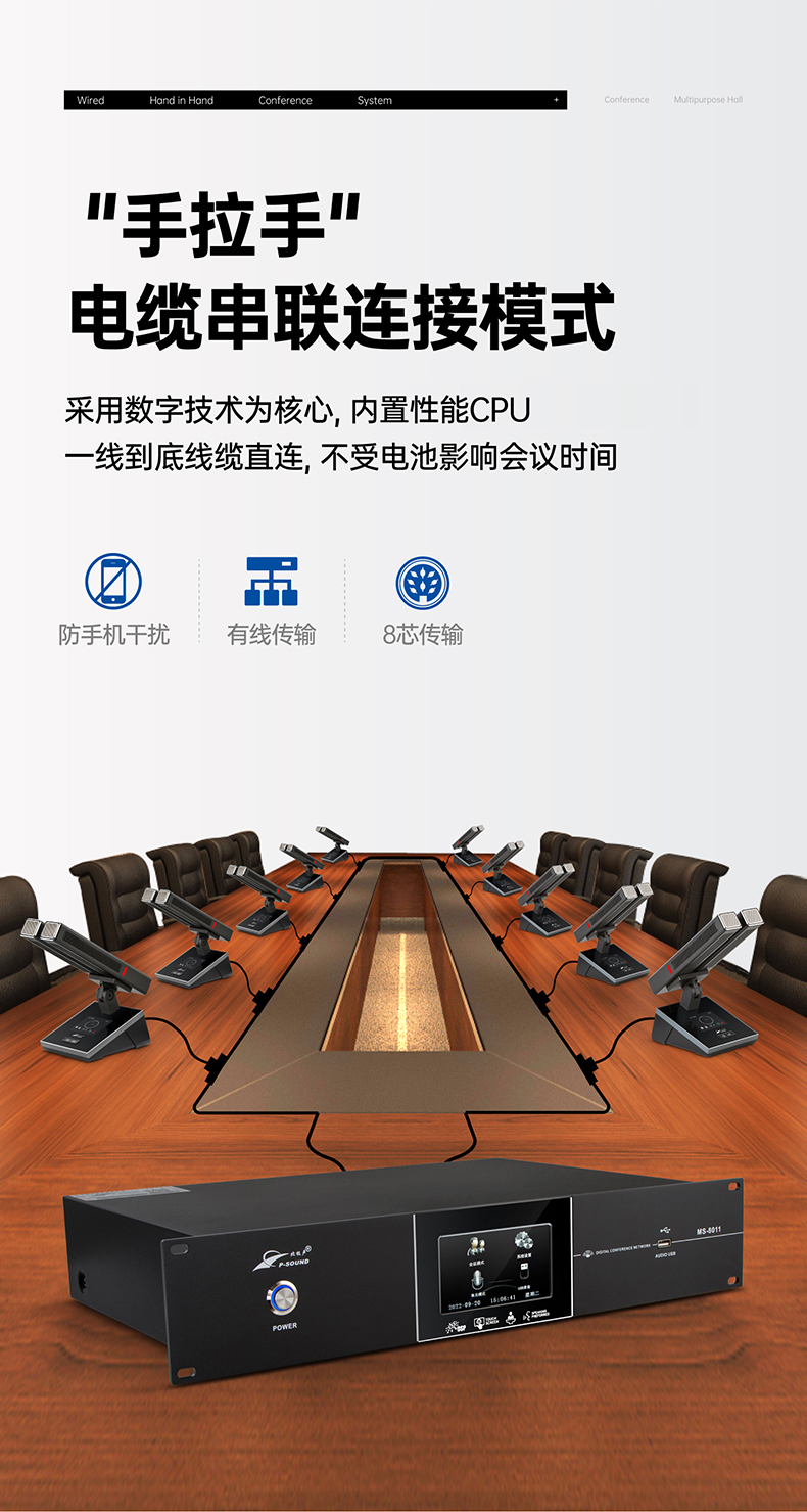 支持多个主席单元,连接时不受位置限制可任意安装,具有全权控制会议秩序的优先功能,可控制会议气氛;