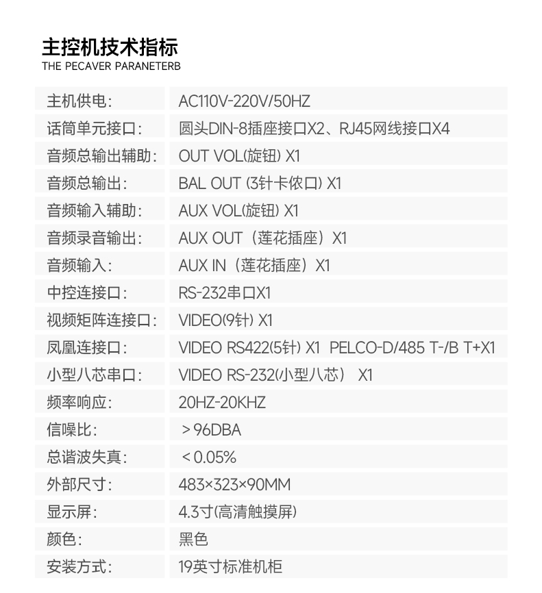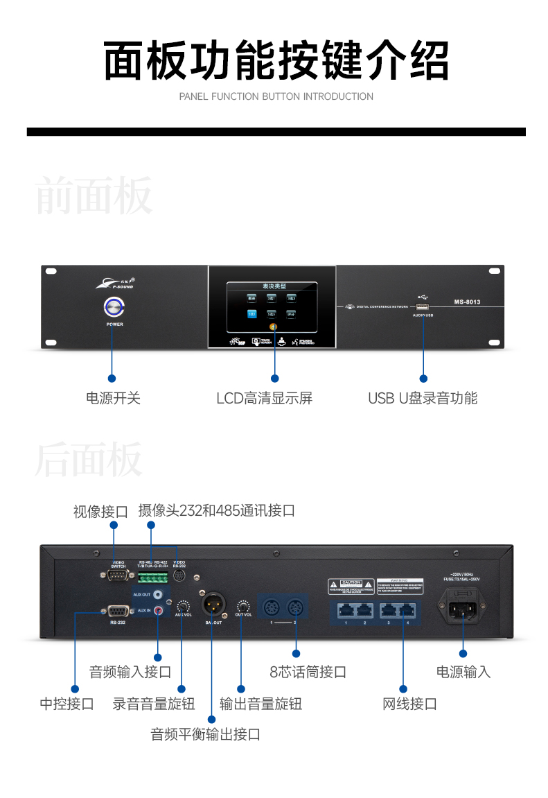 话筒单元接口:圆头DIN-8插座接口x2、RJ45网线接口x4;
