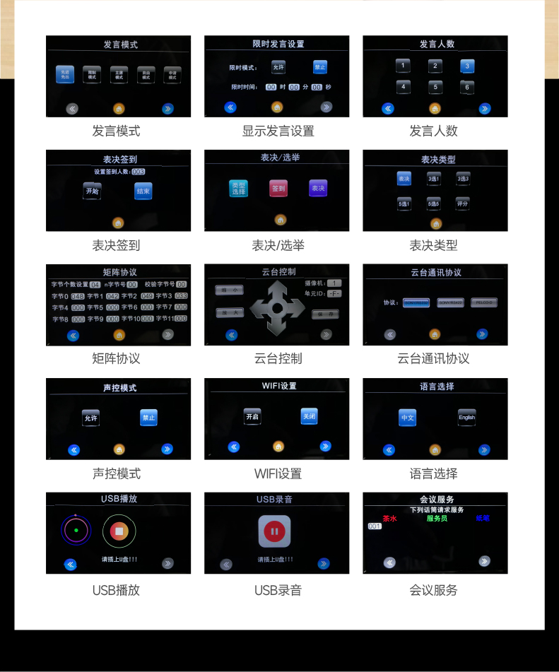 10.主机功能有:会议模式、系统设置、视像模式、单元ID编辑模式、选举/表决、USB录音;