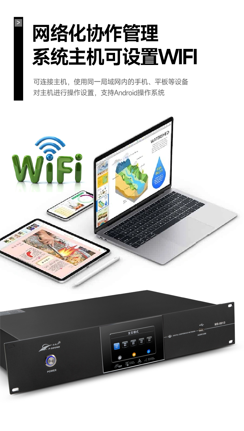 15.网络化协作管理,系统主机可设置WIFI,可连接主机,使用同一局域网内的手机、平板等设备对主机进行操作设置,支持Android操作系统;