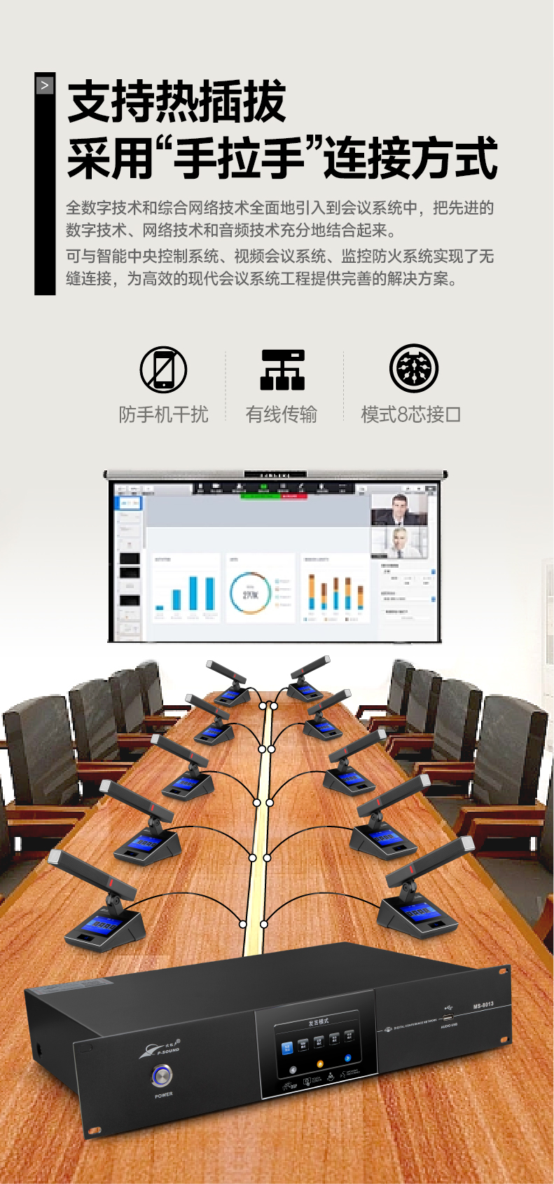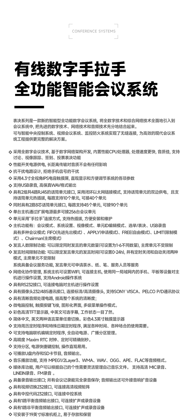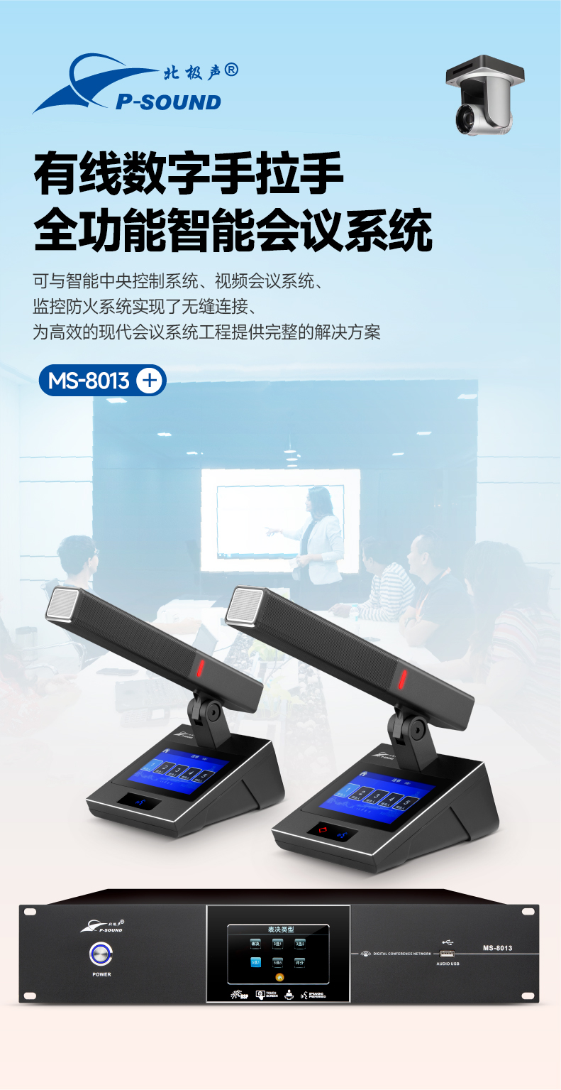 1.采用全数字会议技术,基于数字网络架构开发,内置专业CPU处理器,处理速度更快,音质更佳,支持讨论、视像跟踪、签到、投票表决功能;