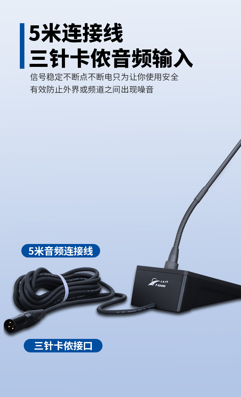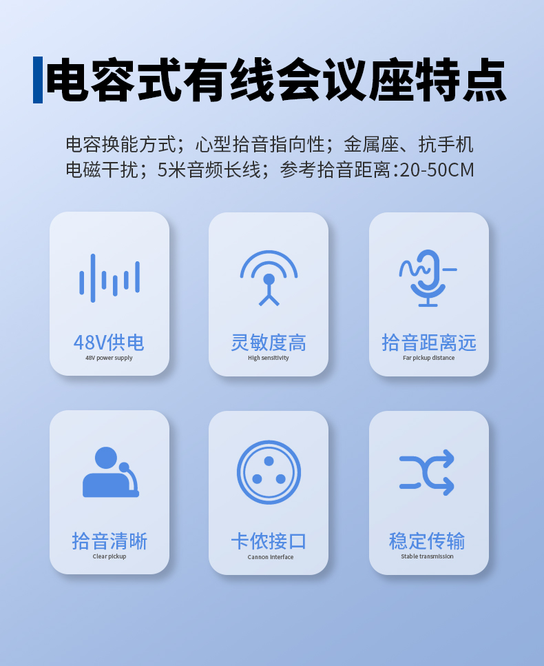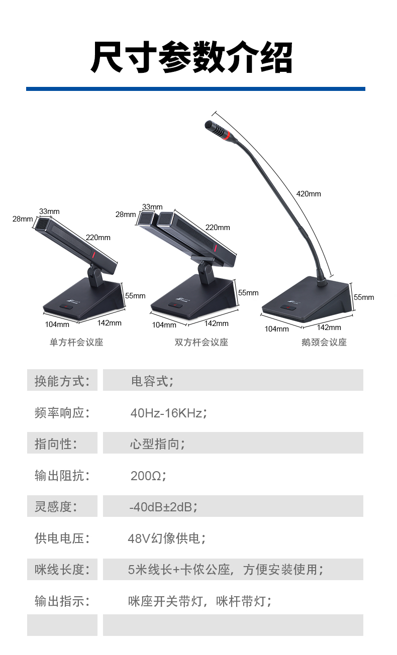 技术参数: 换能方式:电容式; 频率响应:40Hz-16KHz; 指向性:心型指向; 输出阻抗:200Ω; 灵敏度:-40dB±2dB; 供电电压:48V幻像供电; 咪线长度:5米线长+卡侬公座,方便安装使用; 输出指示:咪座开关带灯,咪杆带灯; 开关:产品使用高端无声带灯开关,减少噪声出现。