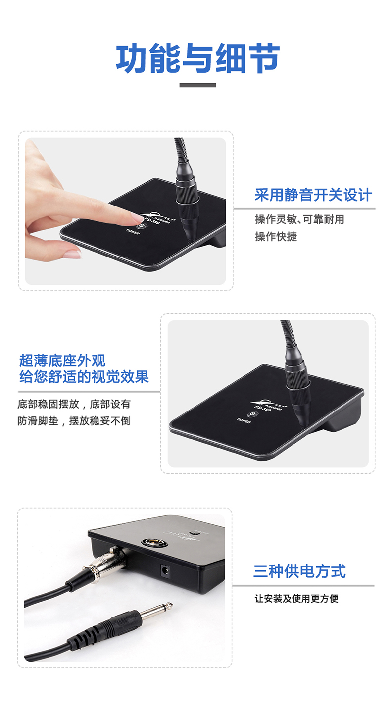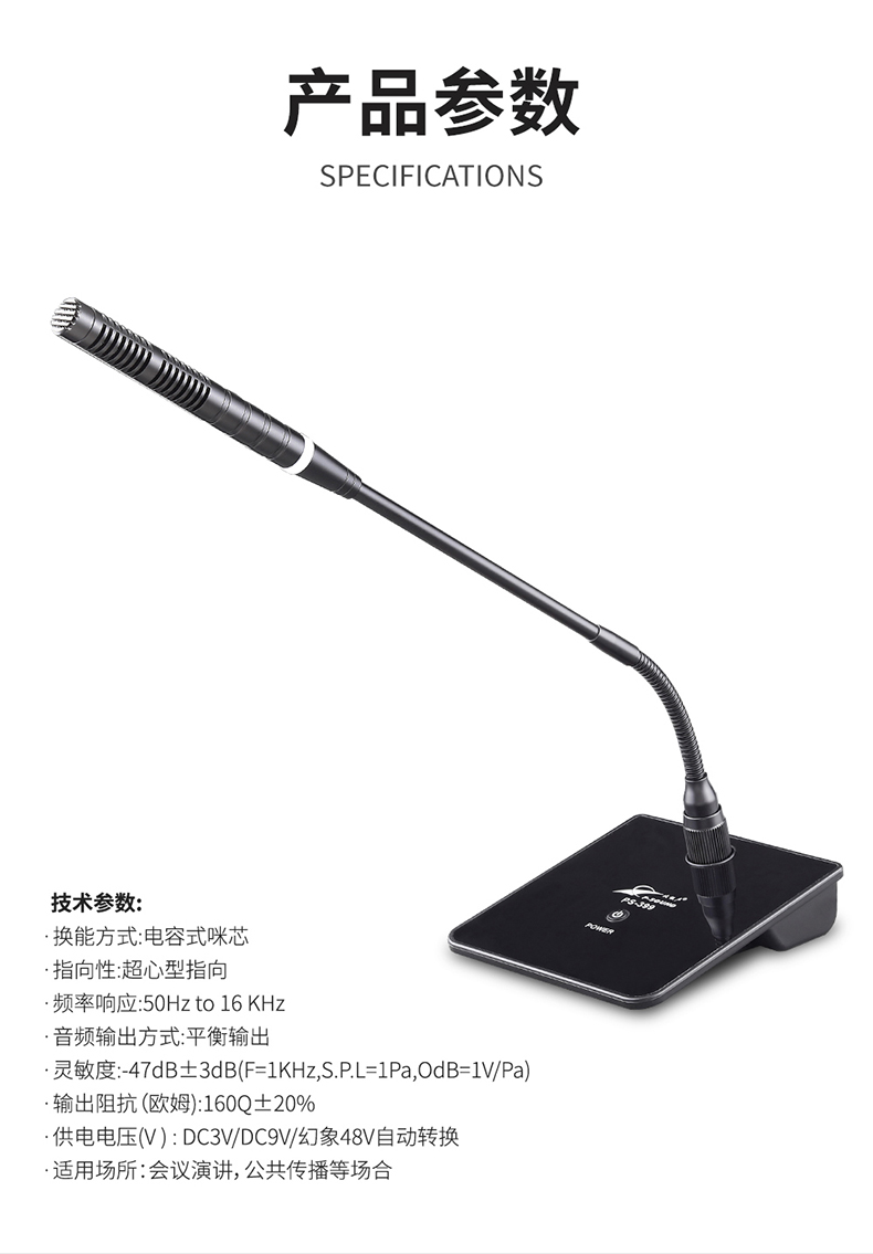 技术参数: 换能方式:电容式咪芯 指向性:超心型指向 频率响应:50Hz-16KHz 音频输出方式:平衡输出 灵敏度:-47dB±3dB(F=1KHz,S.P.L=1Pa,0dB=1V/Pa) 输出阻抗(欧姆):160Ω±20% 话筒杆长度:420mm 供电电压(V):DC3V/DC9V/幻象48V自动转换
