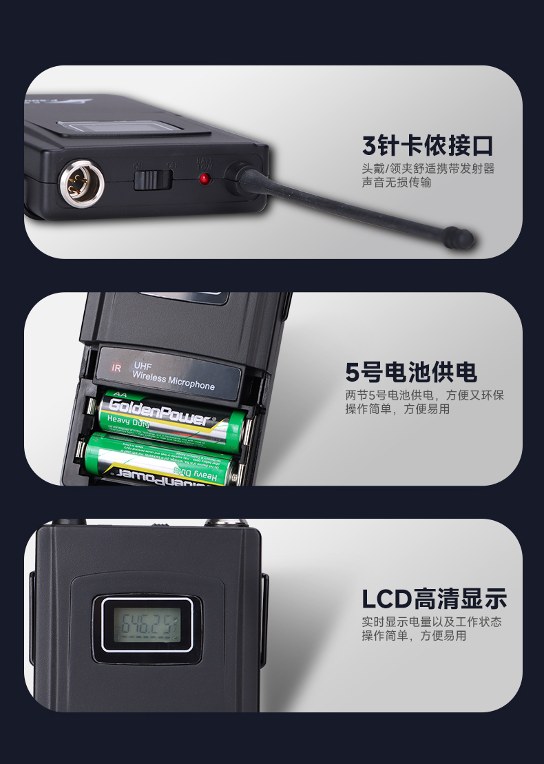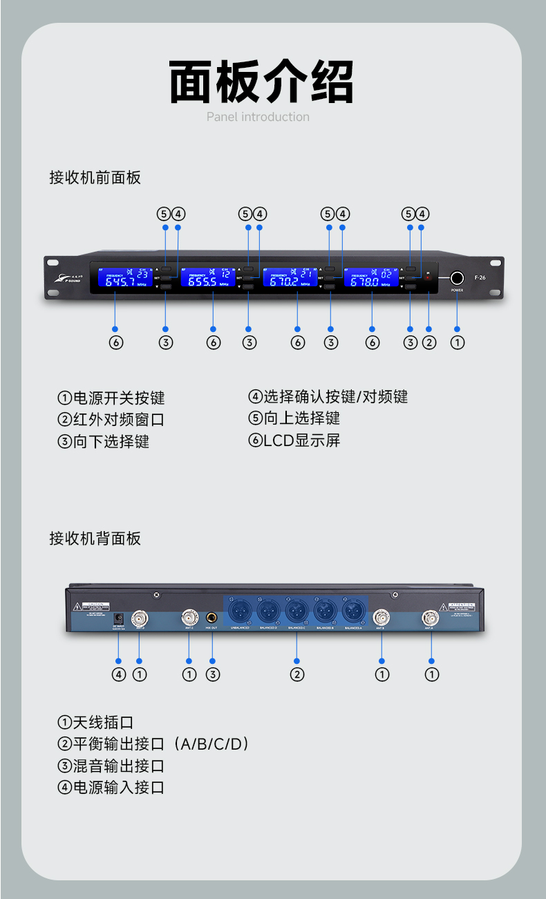 射频范围:640.25-690.00MHz(A通道:640.25MHz-652.50MHz,B通道:652.75MHz-665.00MHz,C通道:665.25MHz-677.50MHz,D通道:677.75MHz-690.00MHz)