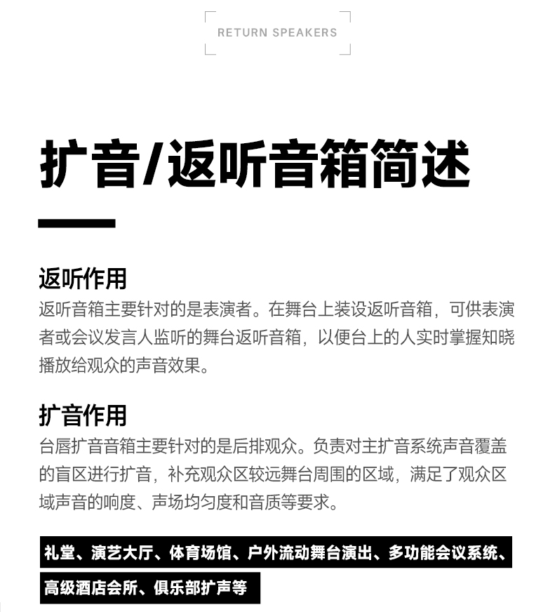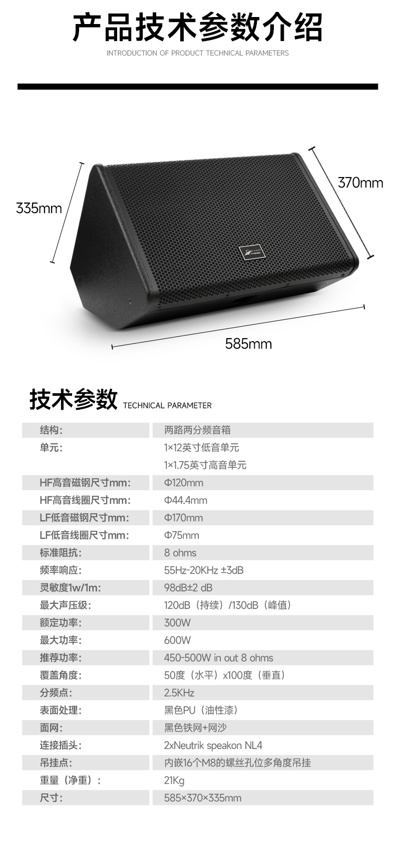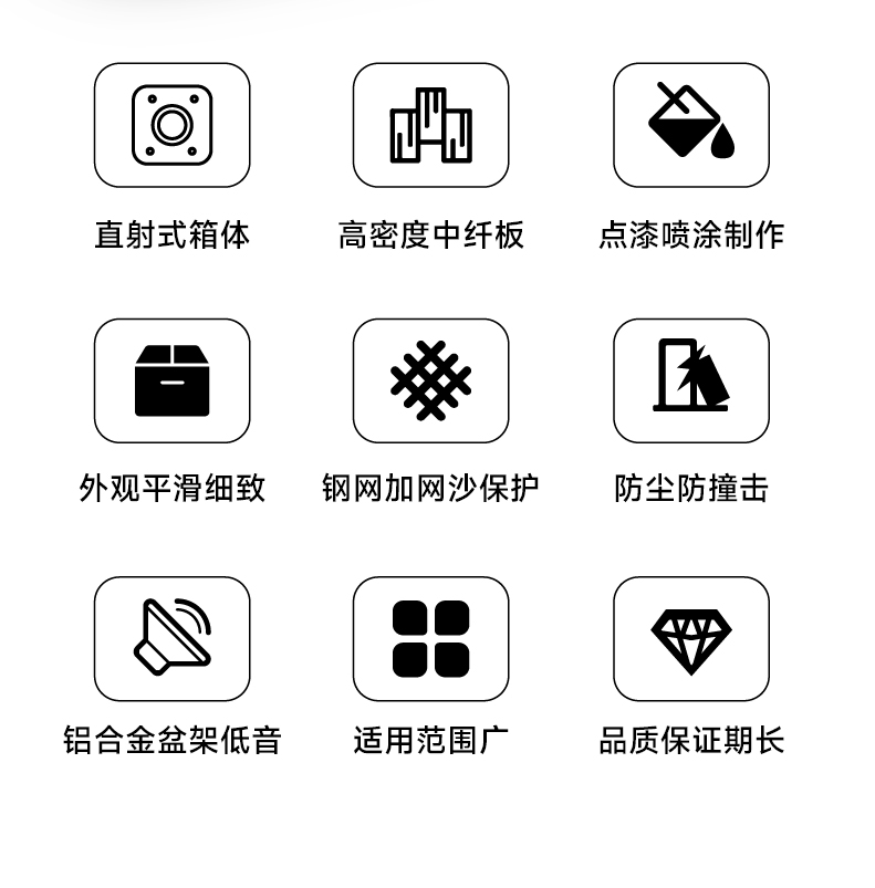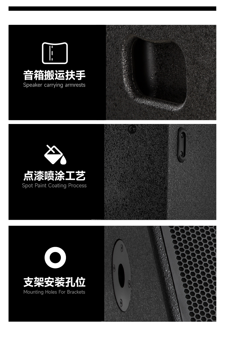 高质量单元配置,高密度中纤板箱体,标准吊挂装置,音箱底部有支架支撑底坐孔,体积小安装简便。超长品质保证期,品质与信心的保证。