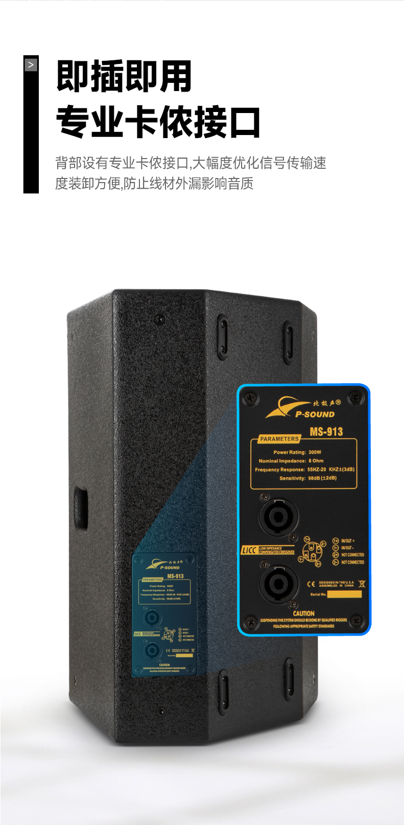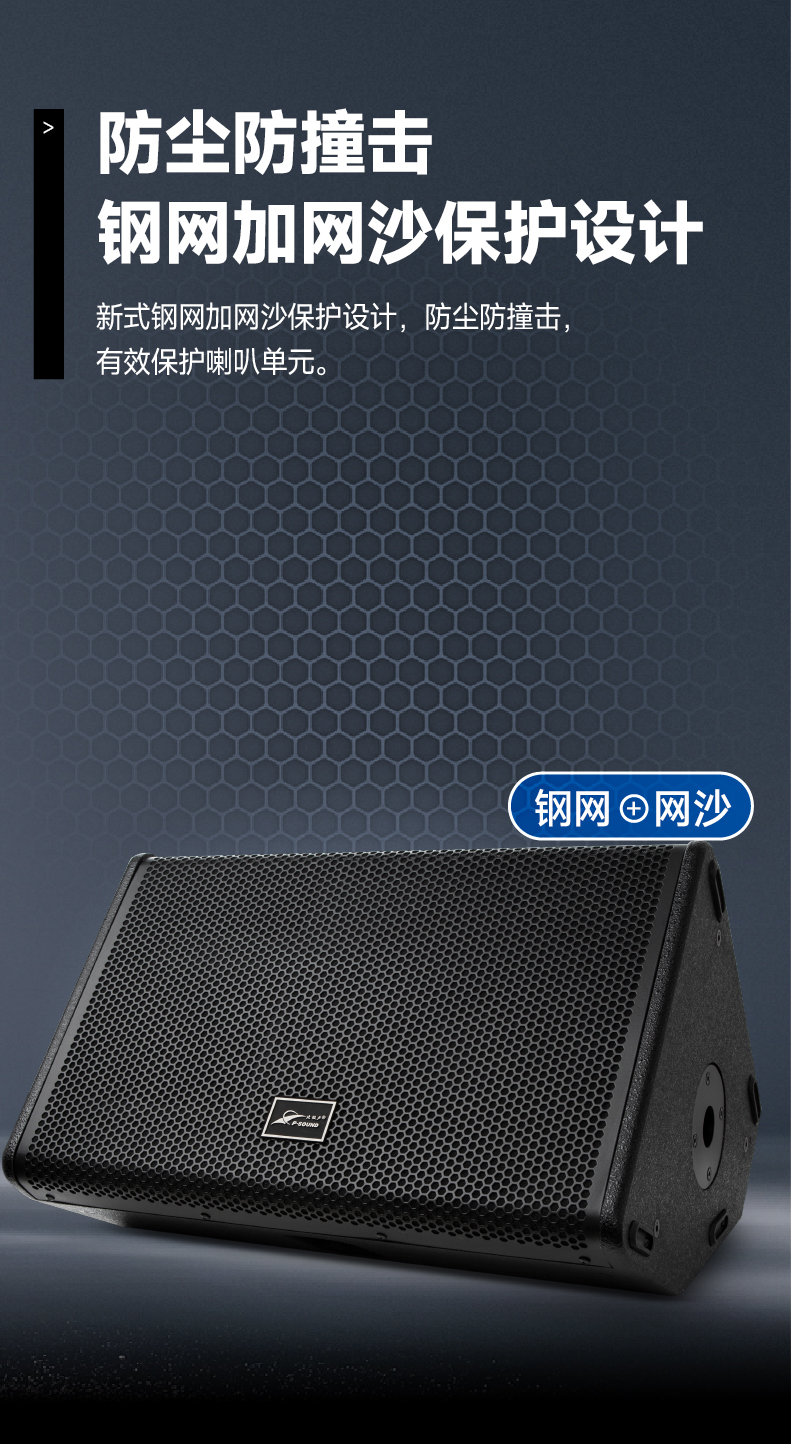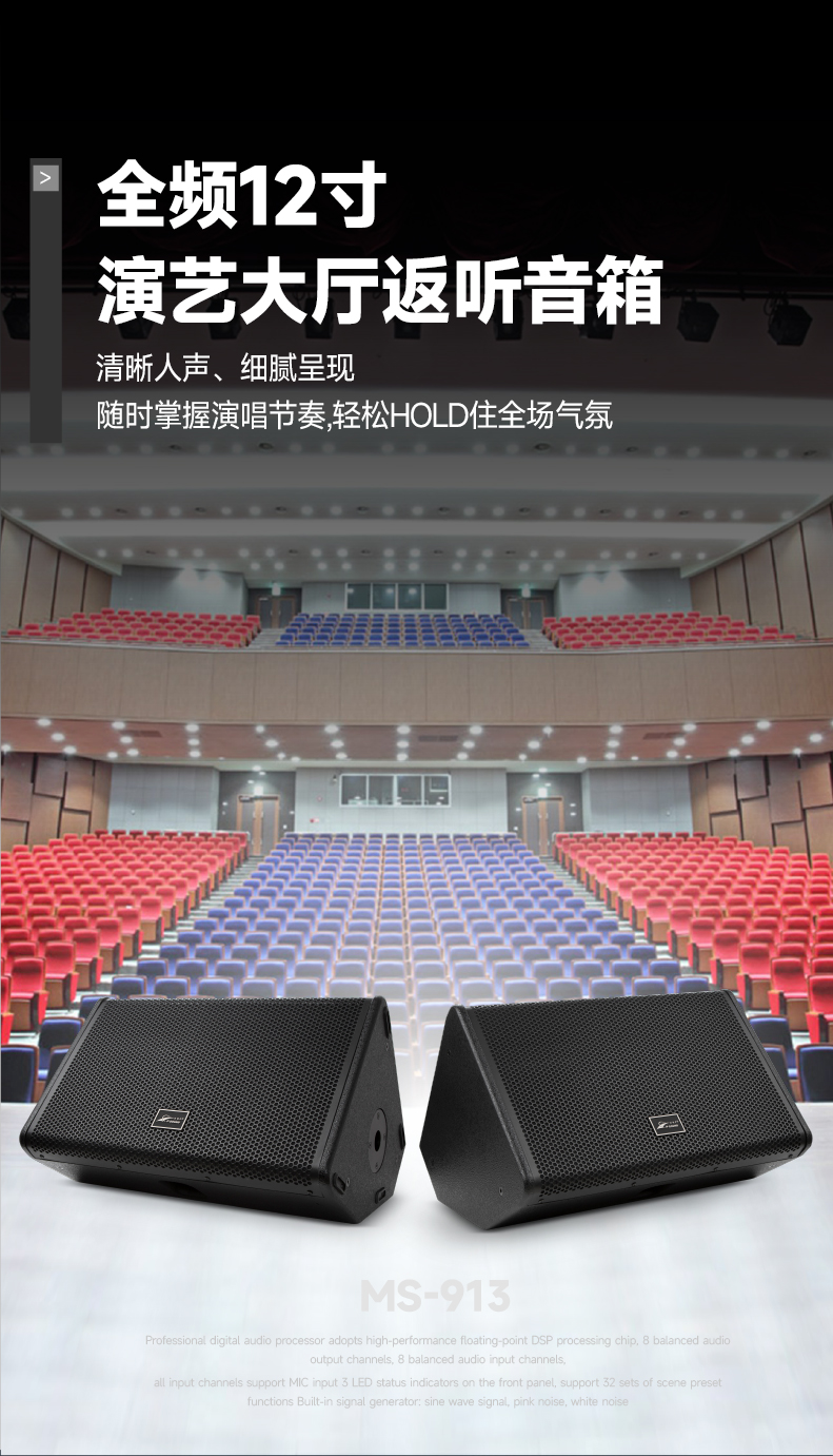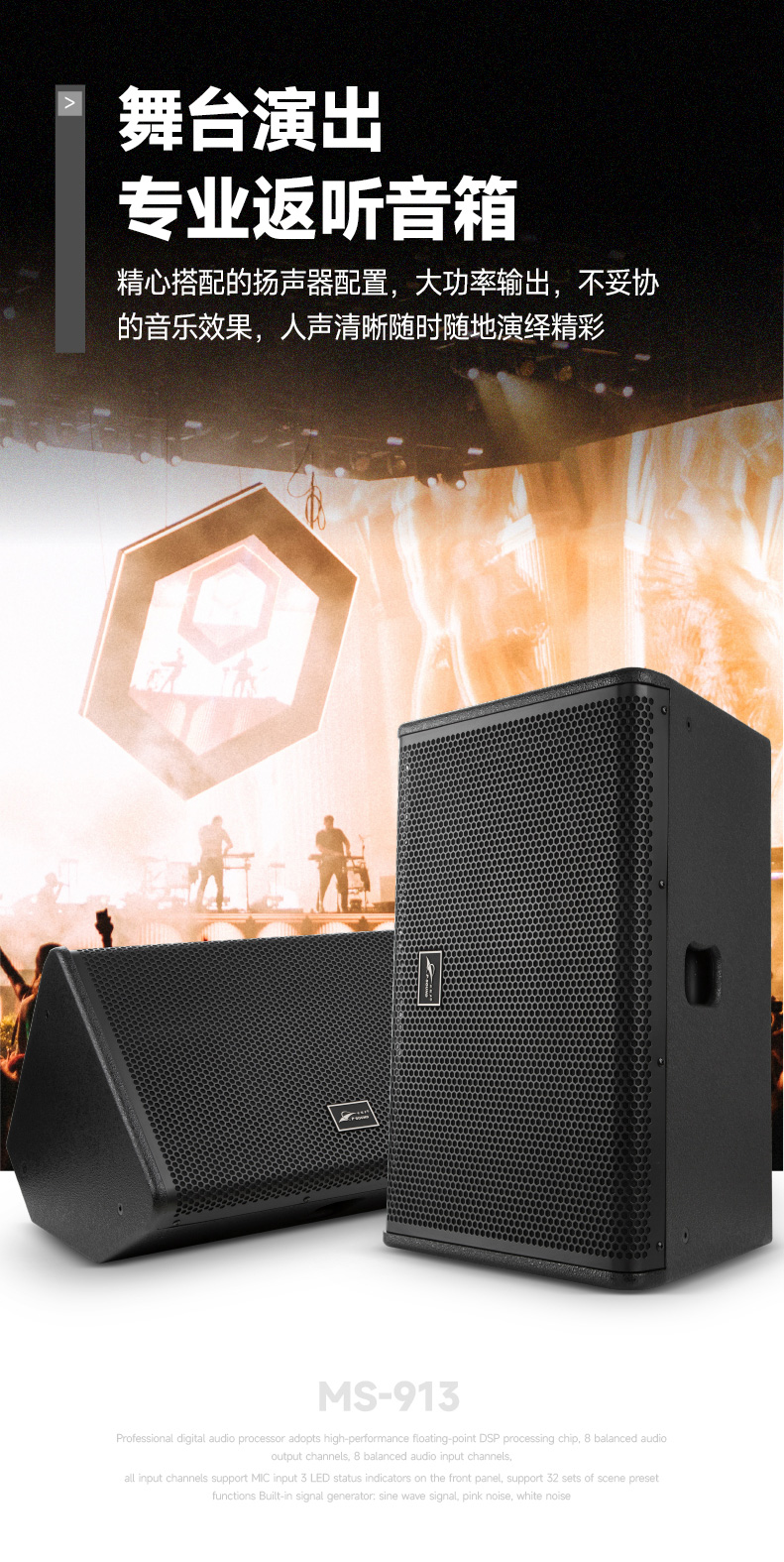 MS-913是一款12寸两单元两路两分频返送音箱,采用一只12寸高效率布边低音单元,一只1寸喉口44芯铝合金高音驱动器配置专门设计的号角,箱体采用MDF高密度中纤板,特殊点漆喷涂制作,外观平滑细致,新式钢网加网沙保护设计,防尘防撞击,有效保护喇叭单元。