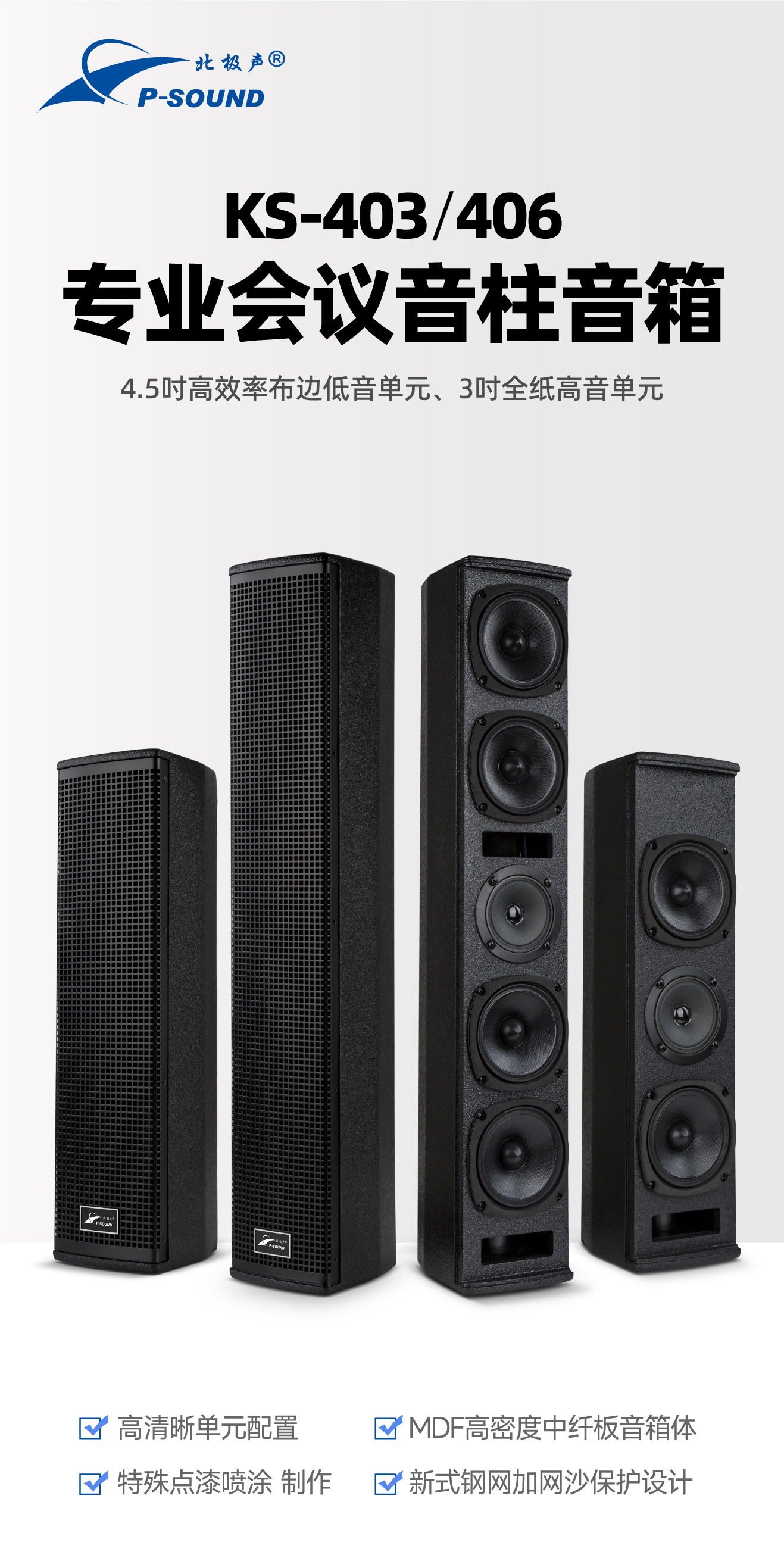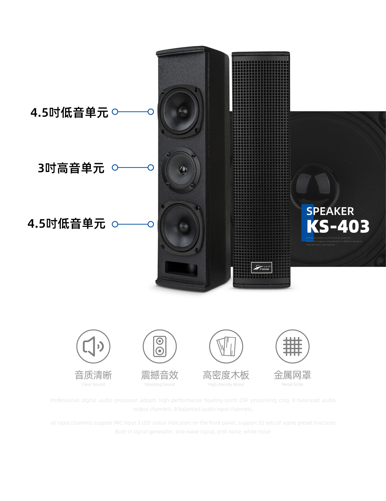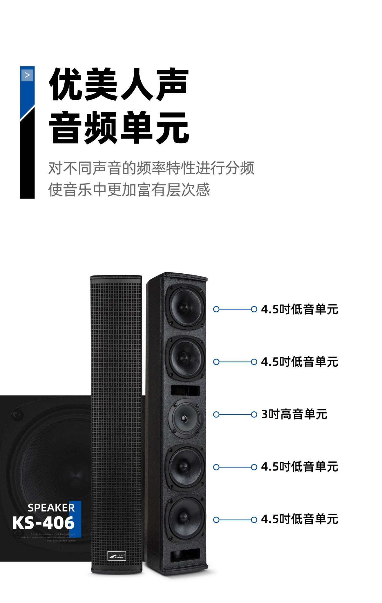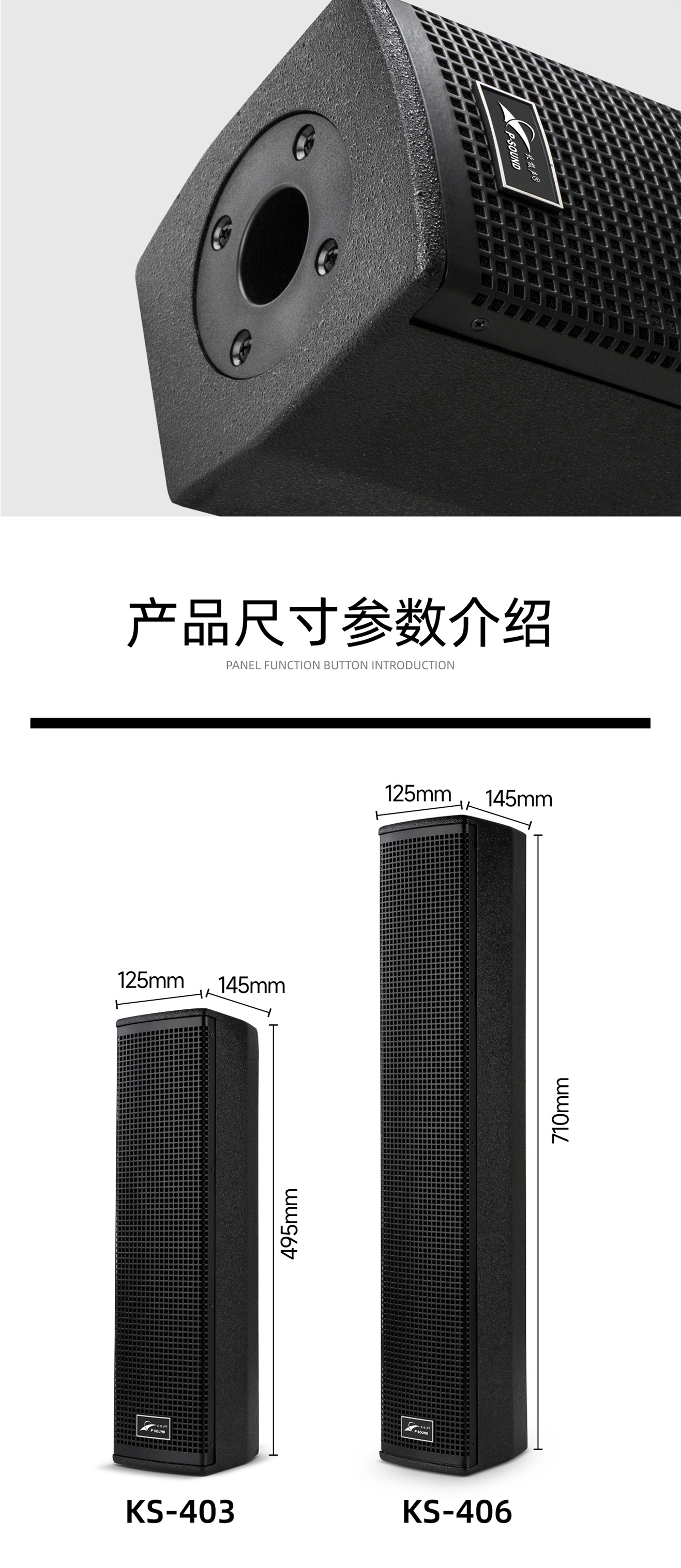 KS-406是一款4.5寸两路两分频五单元音柱音箱,采用四只4.5寸高效率布边低音单元,一只3英寸全纸高音单元驱动器,箱体采用MDF高密度中纤板,内嵌9个M8的螺丝孔位多角度吊挂,加强箱体牢固性,特殊点漆喷涂制作,外观平滑细致,新式钢网加网沙保护设计,防尘防撞击,有效保护喇叭单元。