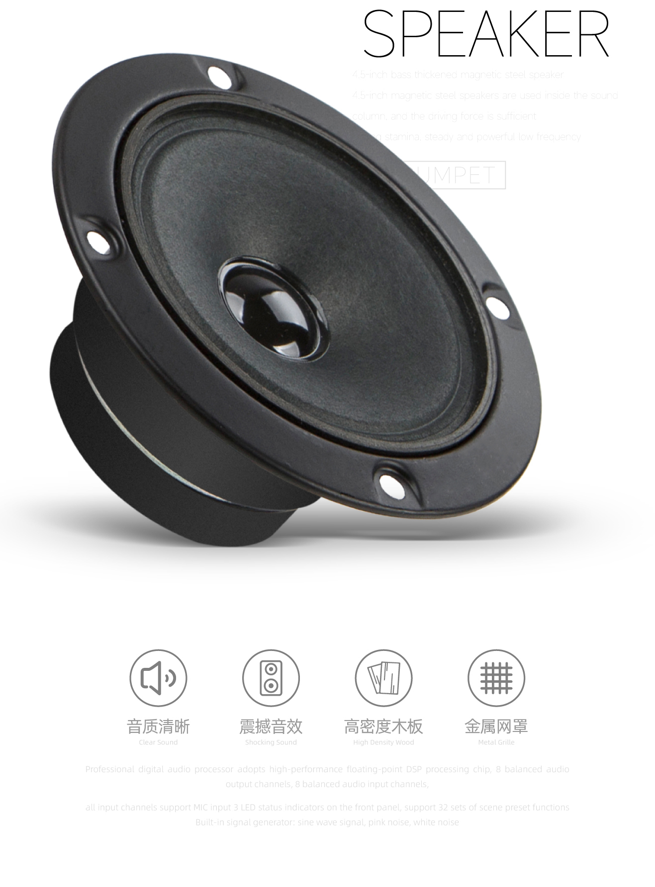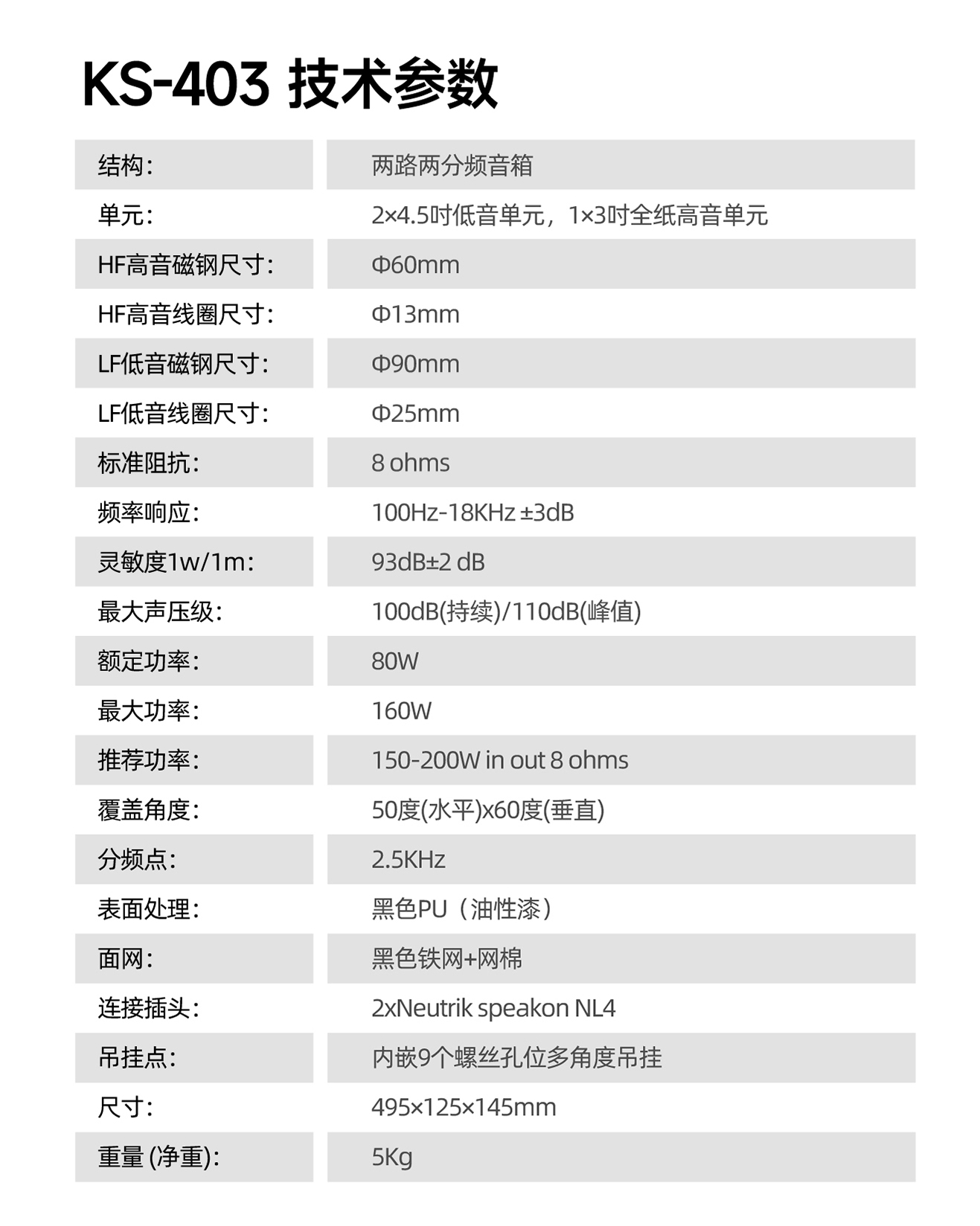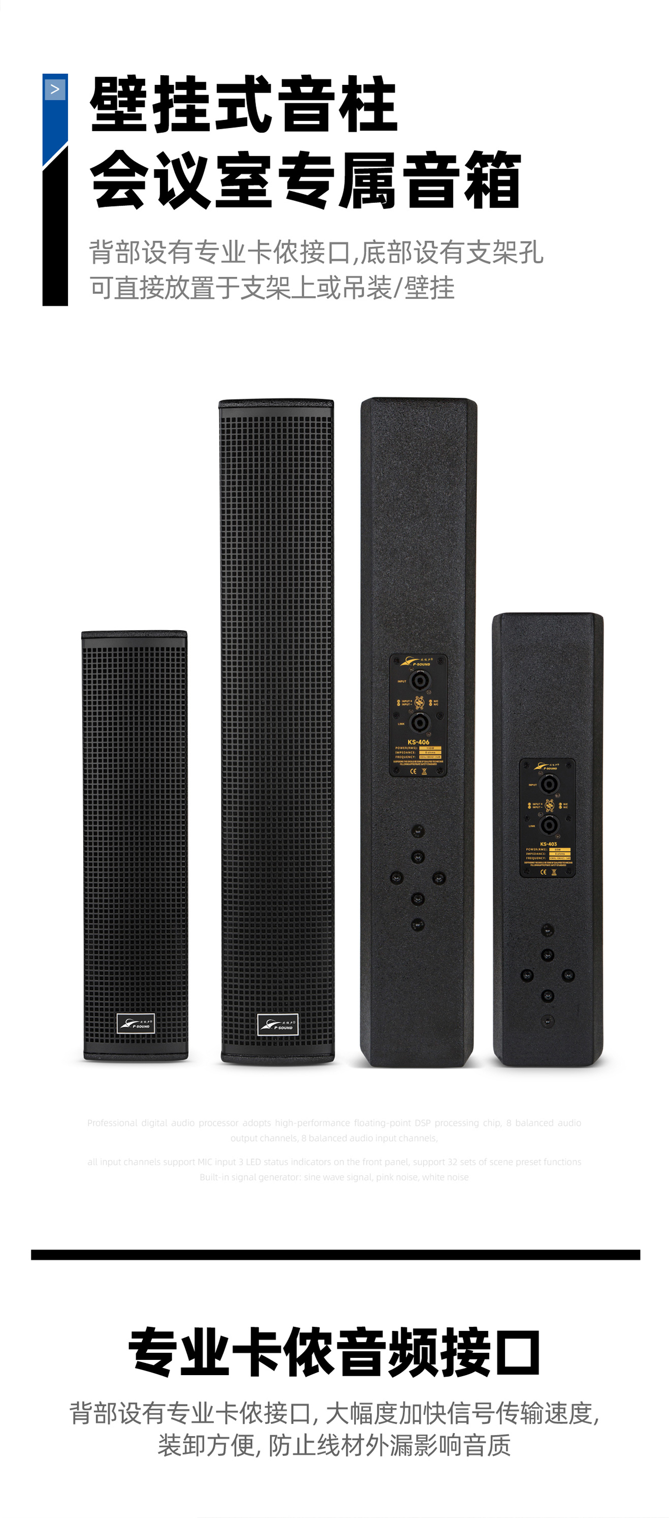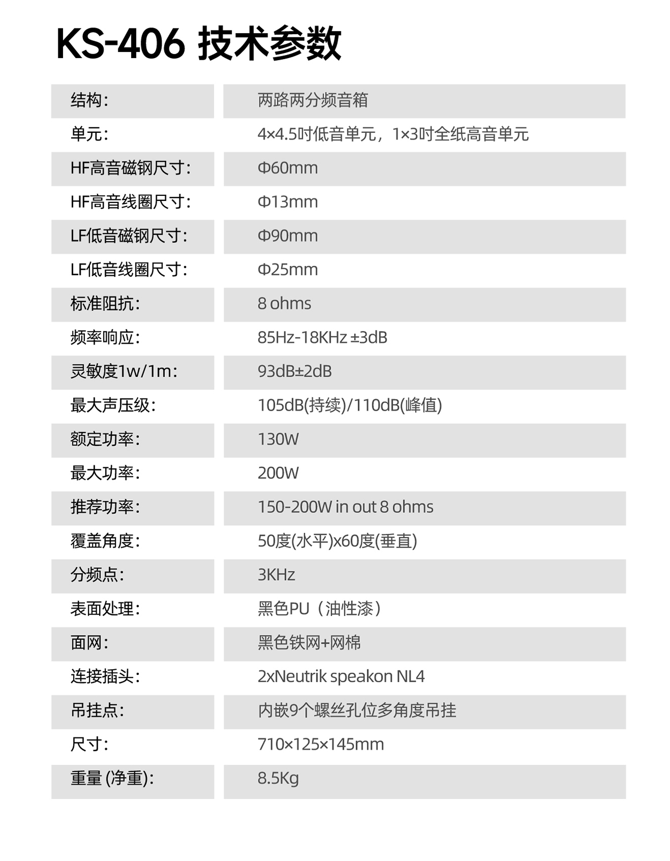 KS-406是一款4.5寸两路两分频五单元音柱音箱,采用四只4.5寸高效率布边低音单元,一只3英寸全纸高音单元驱动器,箱体采用MDF高密度中纤板,内嵌9个M8的螺丝孔位多角度吊挂,加强箱体牢固性,特殊点漆喷涂制作,外观平滑细致,新式钢网加网沙保护设计,防尘防撞击,有效保护喇叭单元。