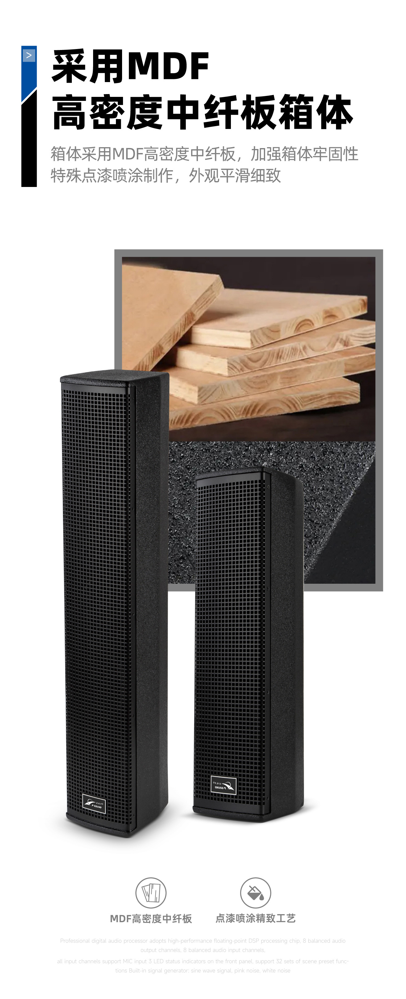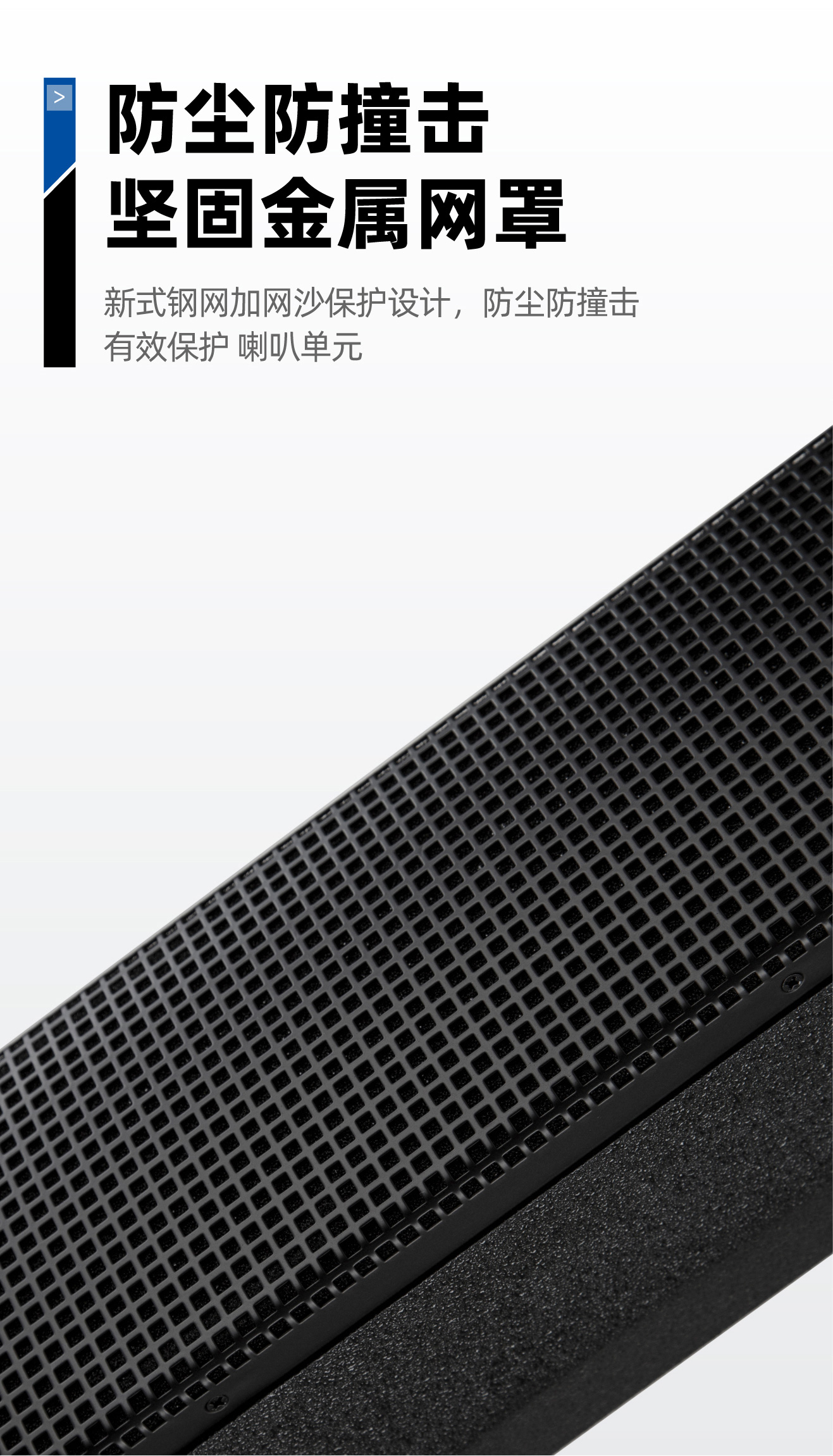 高质量单元配置,MDF高密度中纤板箱体,音箱底部有支架支撑底坐孔,标准吊挂装置,体积小安装简便。超长品质保证期,品质与信心的保证。