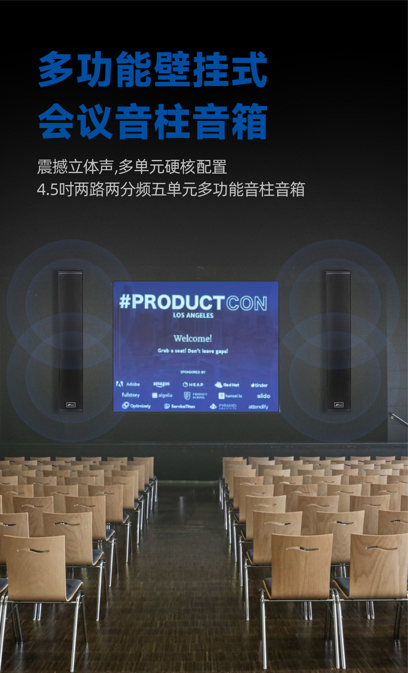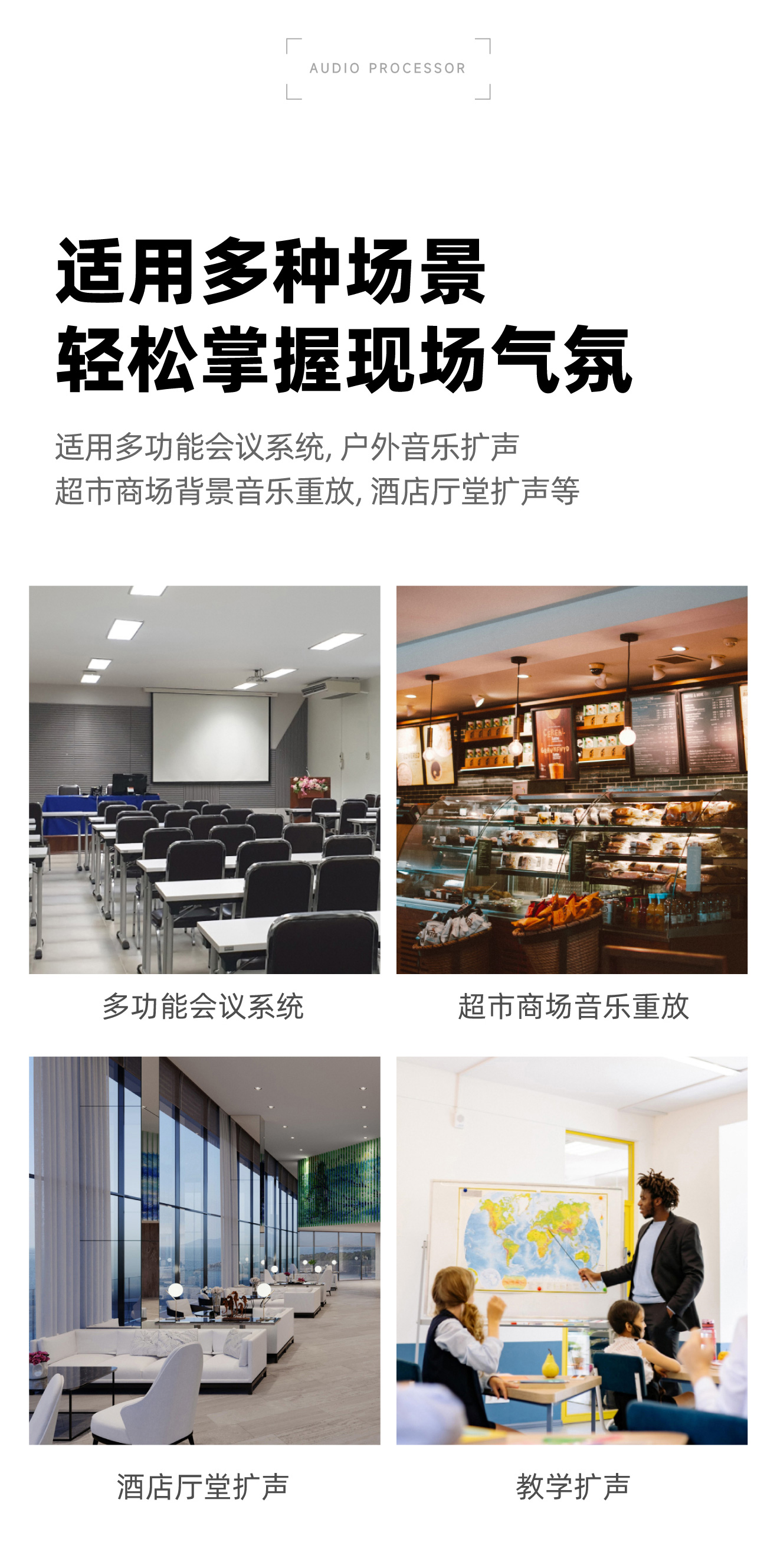 多功能会议系统,酒店厅堂背景音乐播放,会议教学扩声等等。