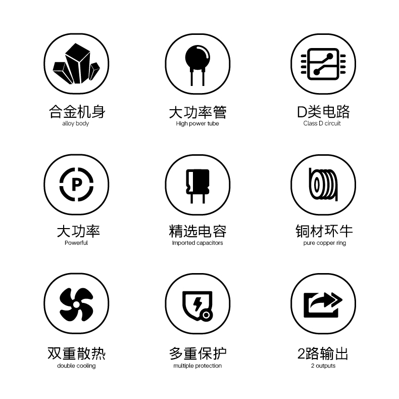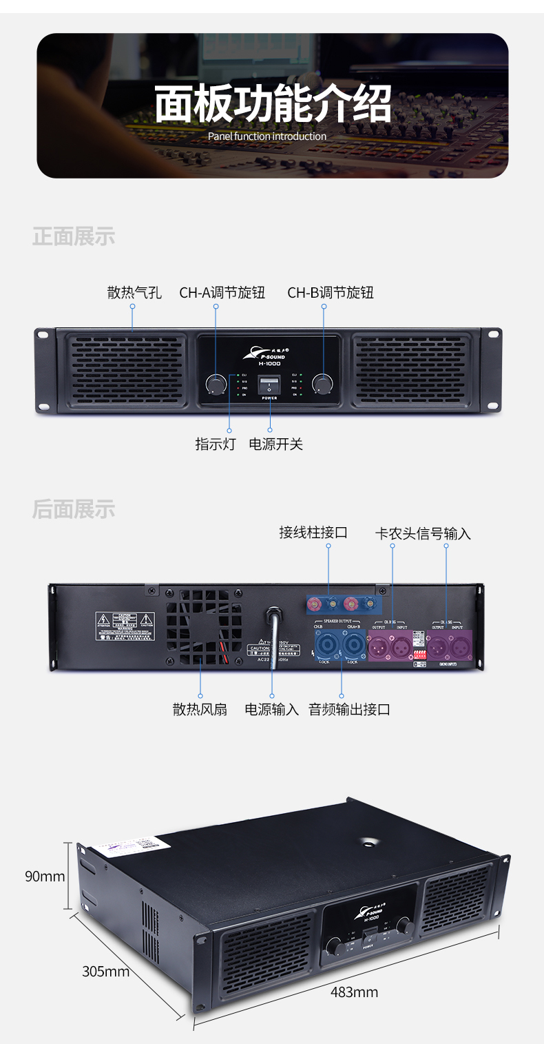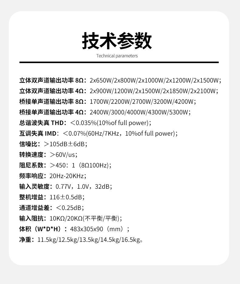 3.本设备为数字+模拟D类电路,环形变压器供电,特大高能量线形电源供给器,适用于立体声或桥接模式,可驱动4Ω负载。