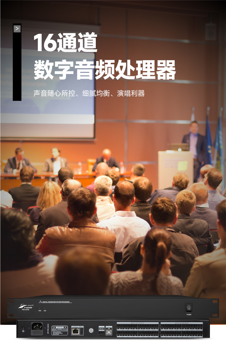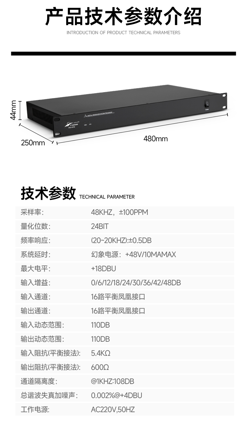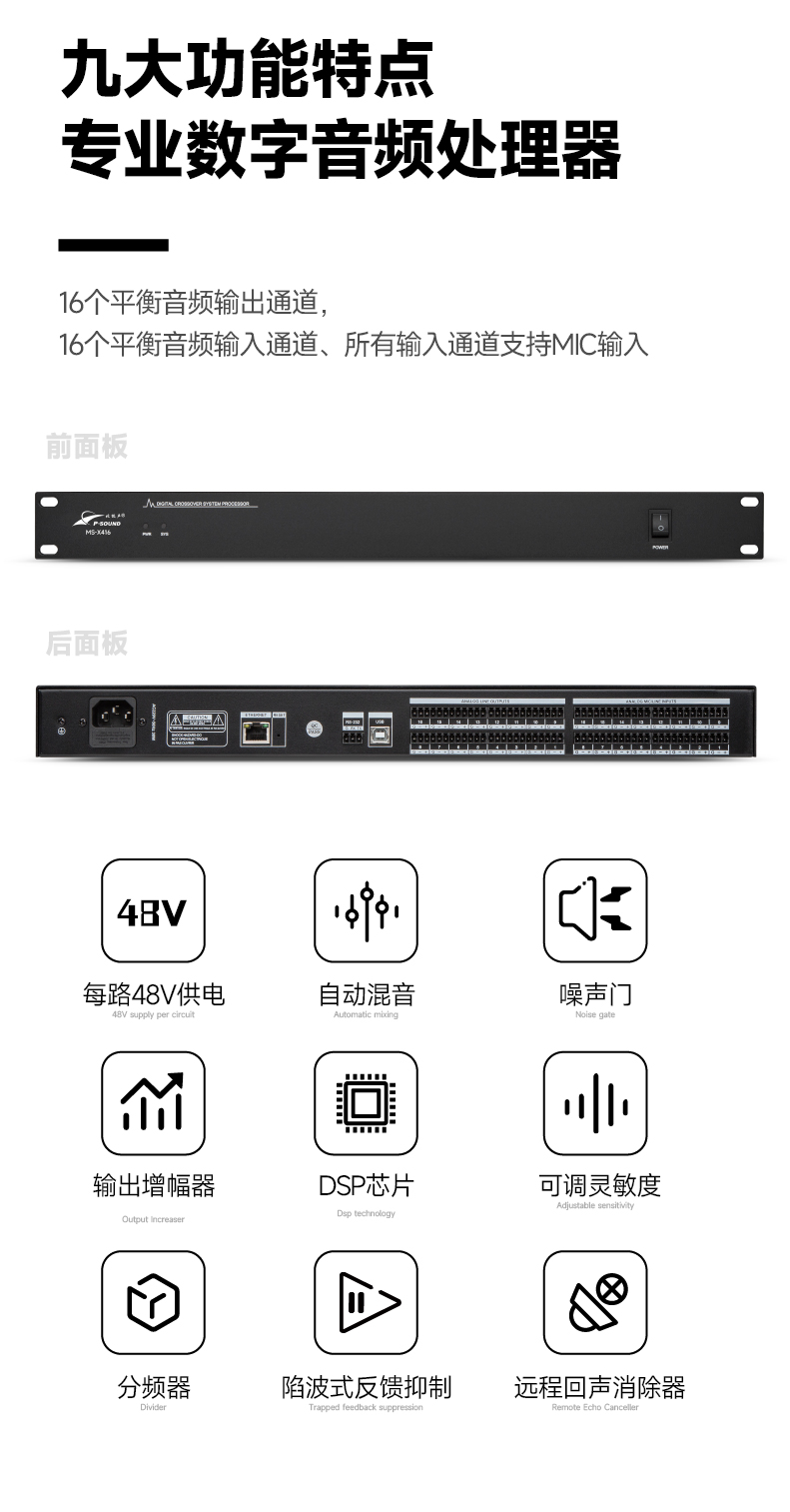 1.本设备是一款16进16出智能混音媒体矩阵,配备16路模拟信号输入和16路模拟信号输出。