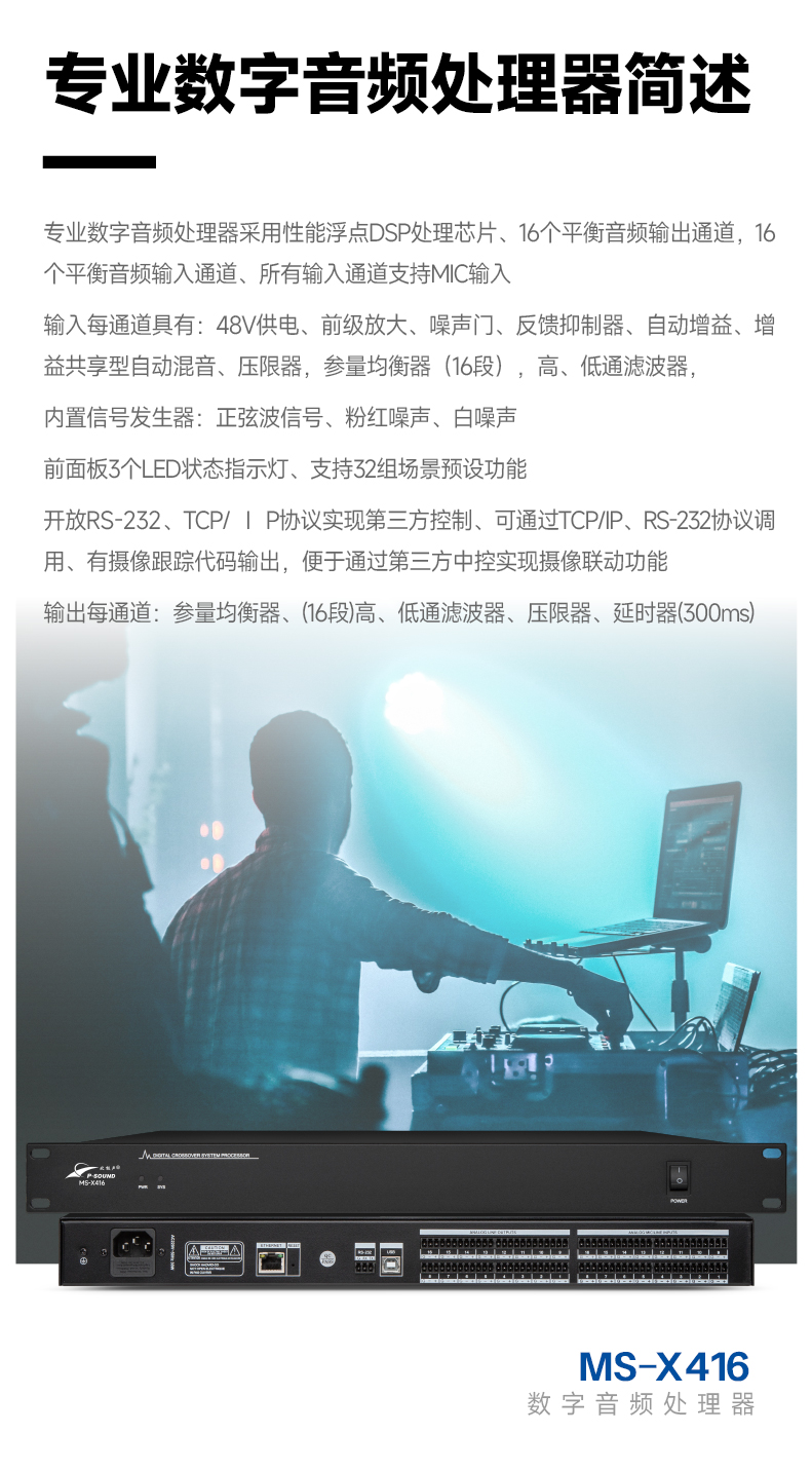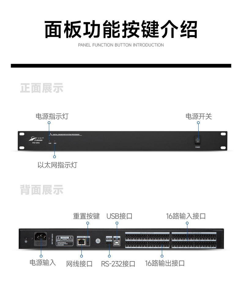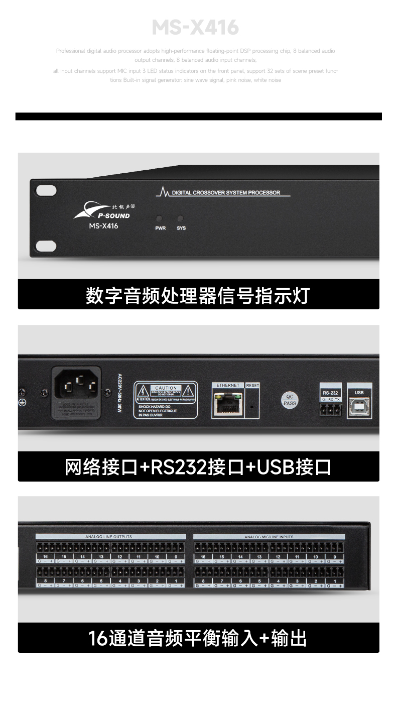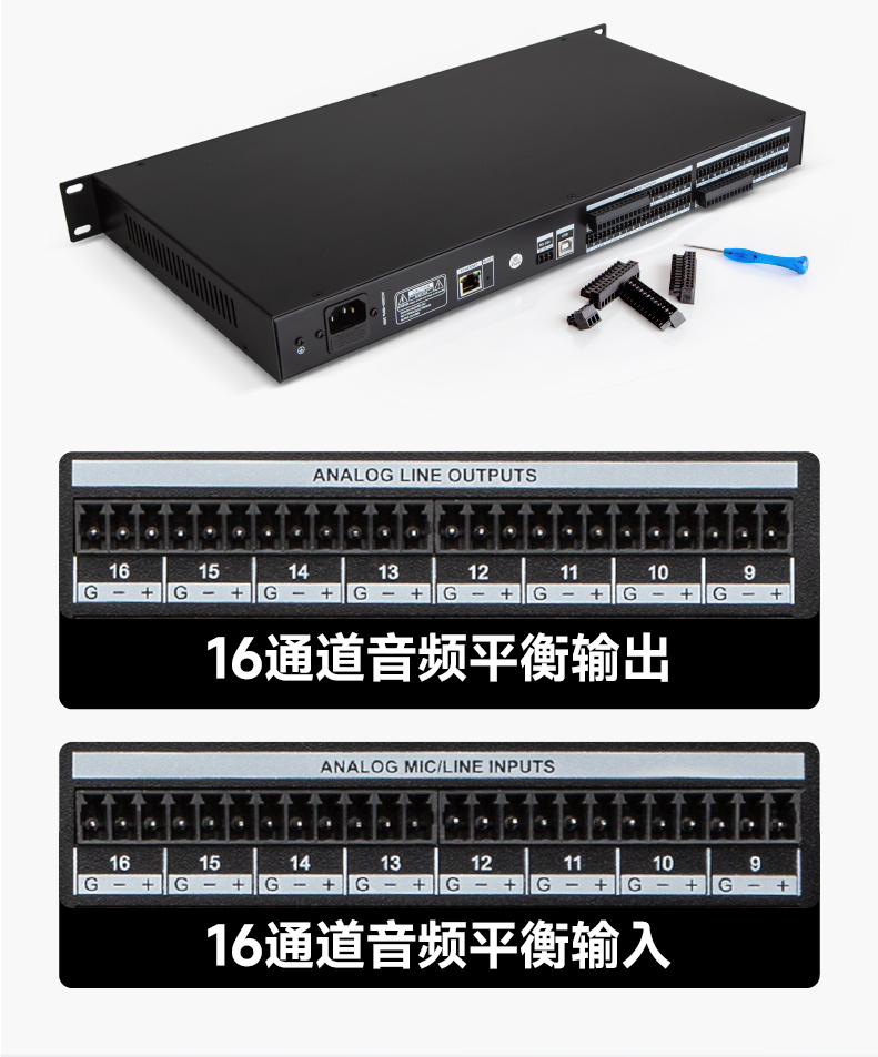 1.本设备是一款16进16出智能混音媒体矩阵,配备16路模拟信号输入和16路模拟信号输出。