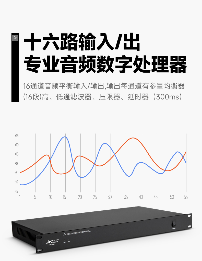 10.每一路输出通道分别支持输出限幅器,最大1200毫秒延时,8段参量均衡,正反相,静音,高低通滤波器等等功能。