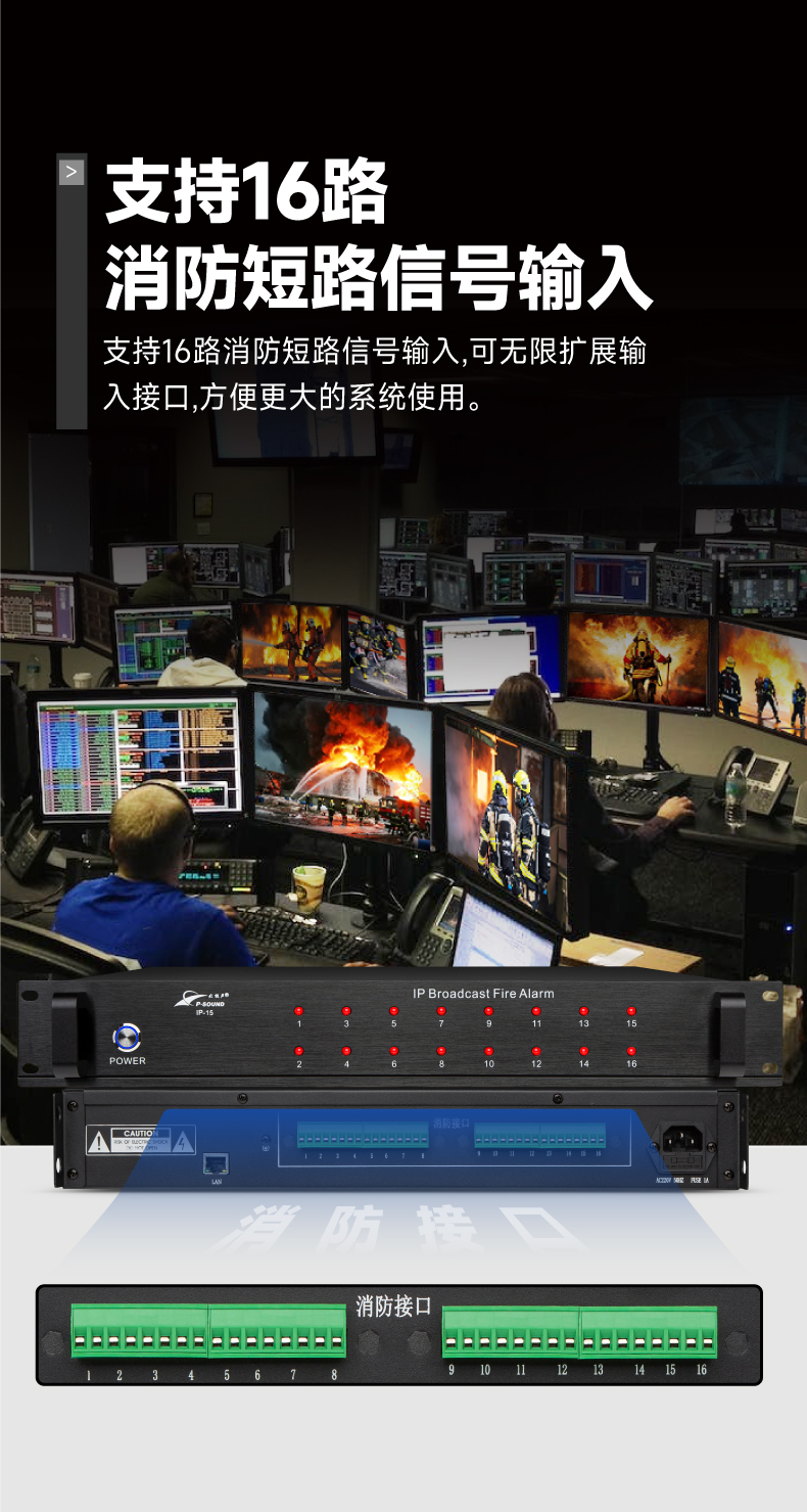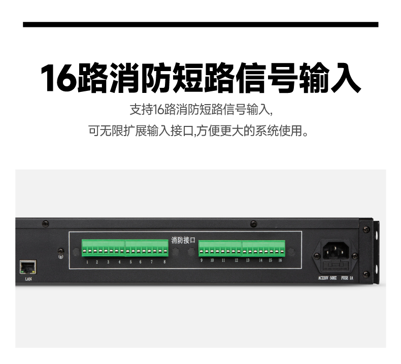 3.支持16路消防短路信号输入,可无限扩展输入接口,方便更大的系统使用;