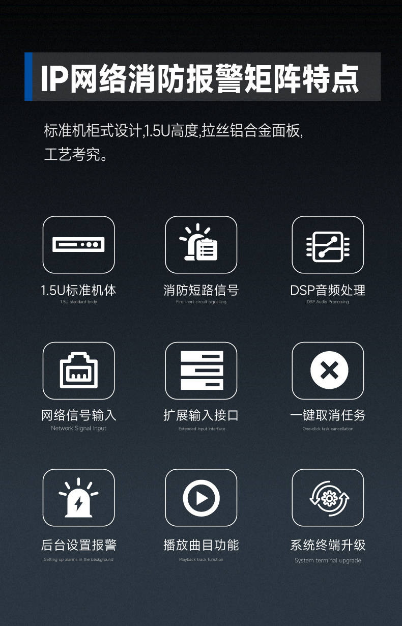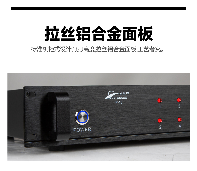 1.标准机柜式设计,1.5U高度,高档拉丝铝合金面板,工艺考究,尽显高档气质;