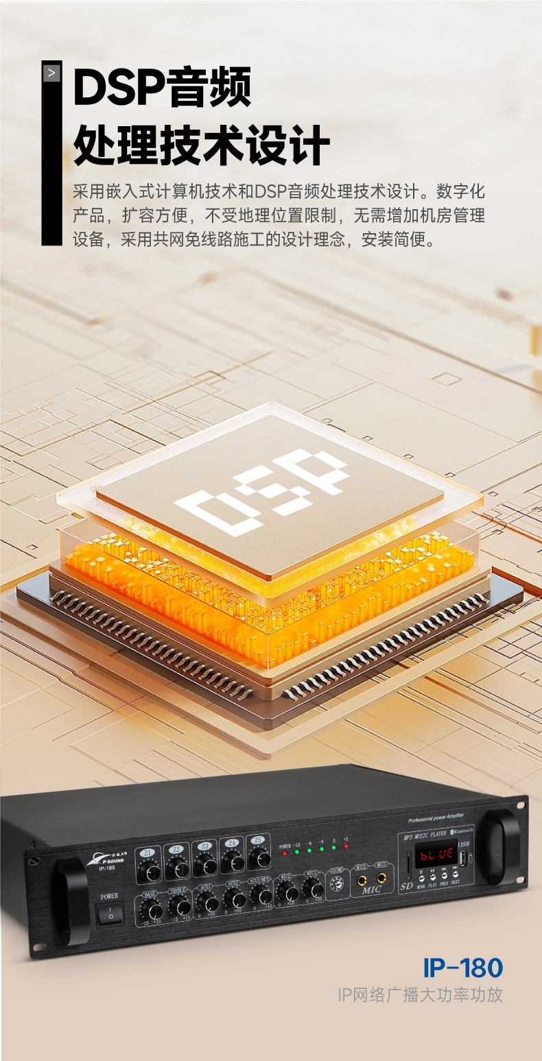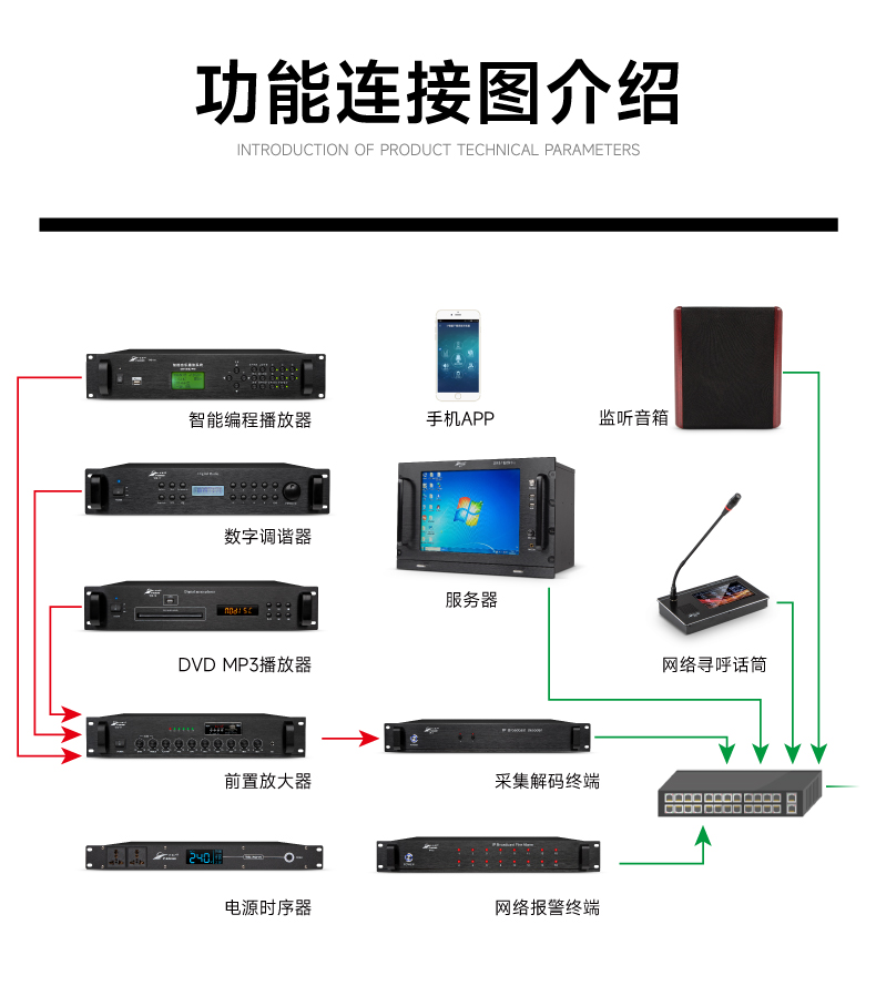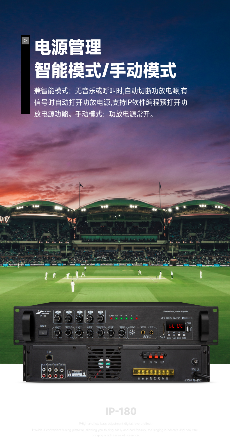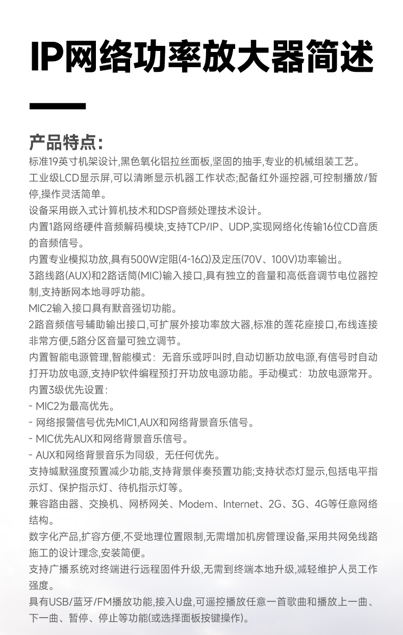 10.内置智能电源管理,智能模式:无音乐或呼叫时,自动切断功放电源,有信号时自动打开功放电源,支持IP软件编程预打开功放电源功能;手动模式:功放电源常开;