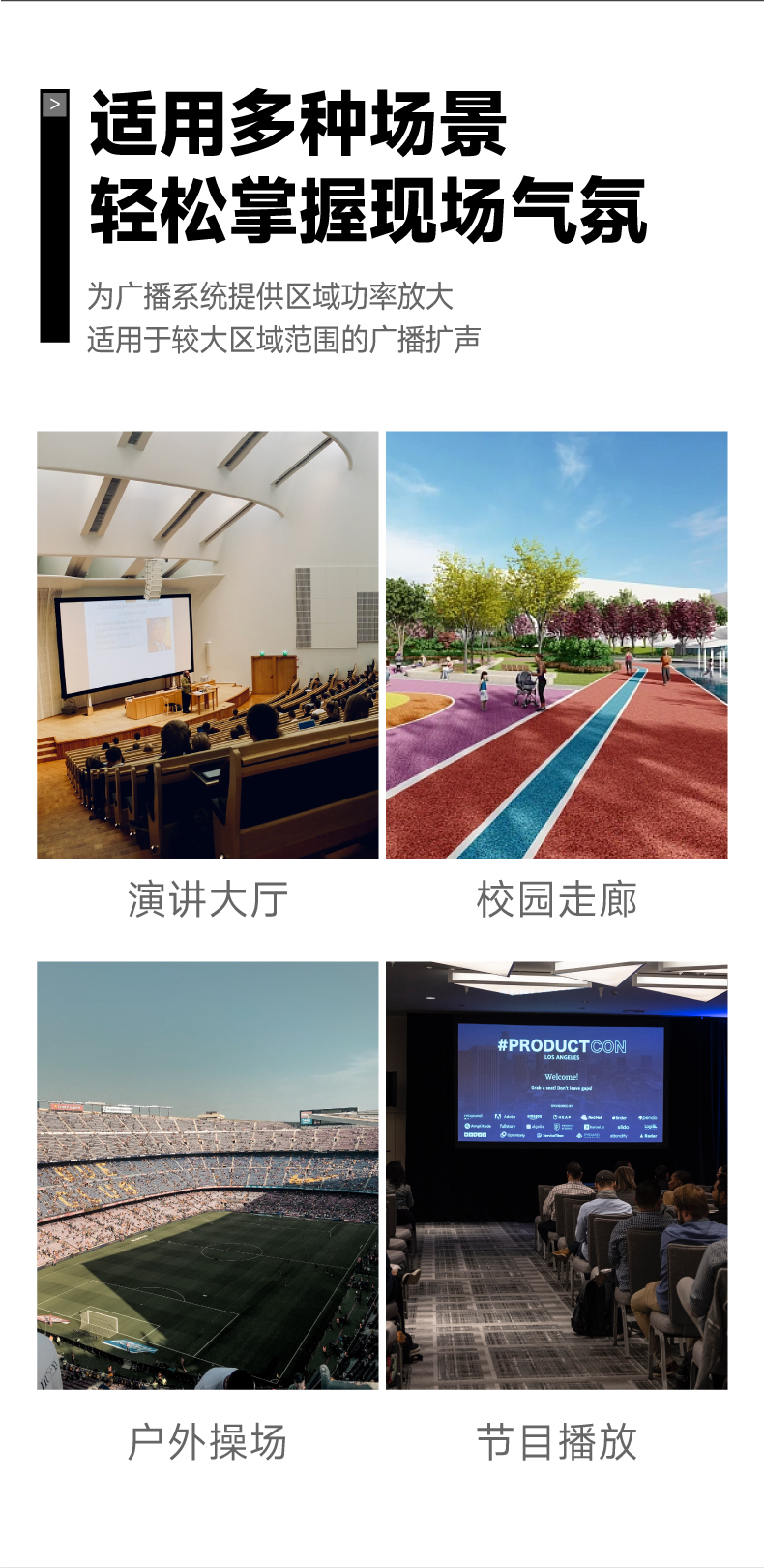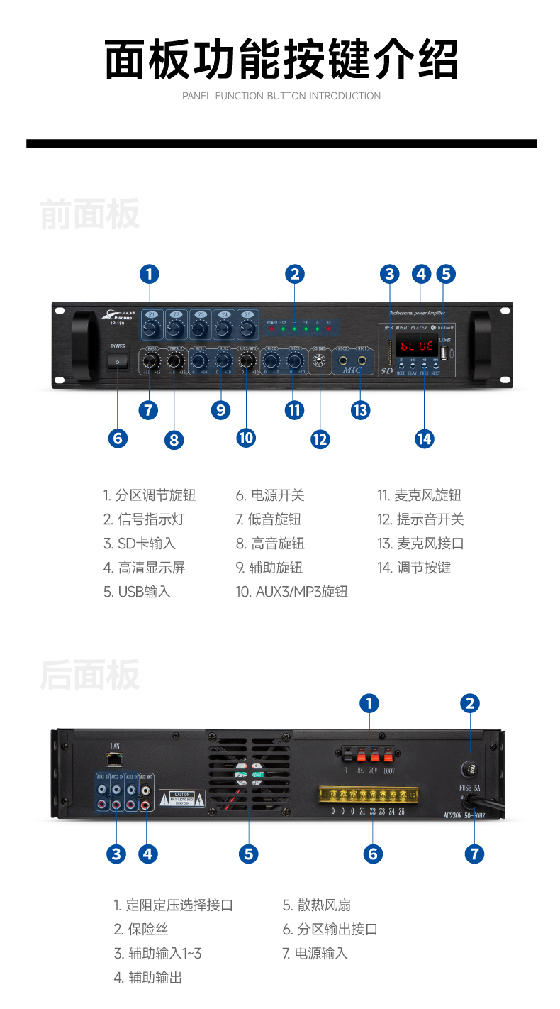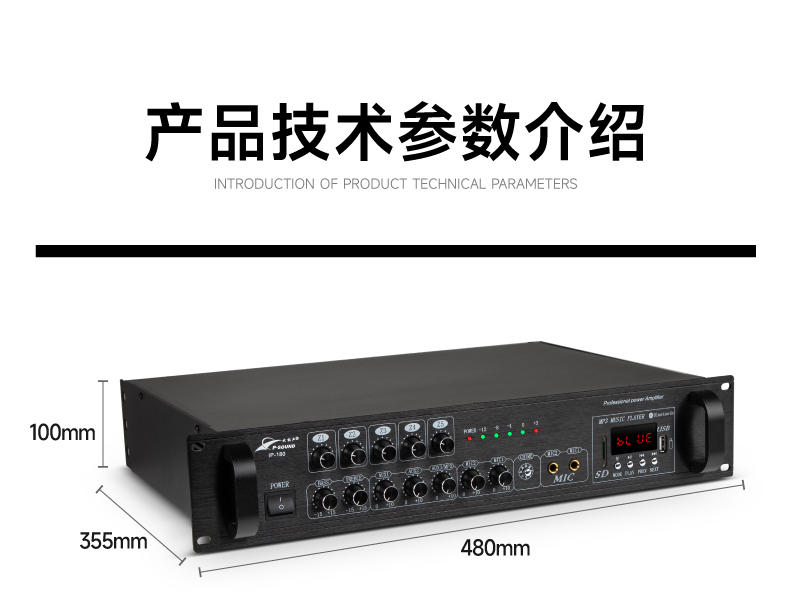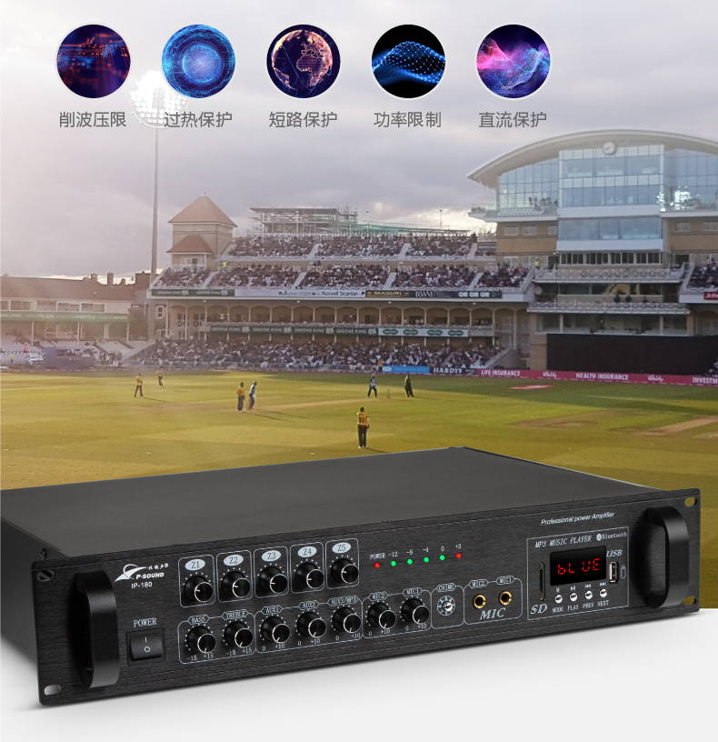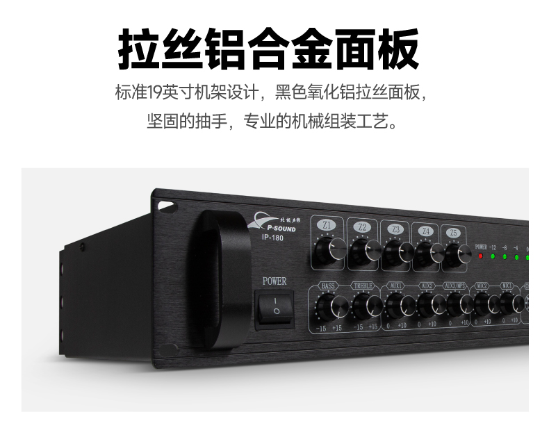 5.内置高保真专业模拟功放,有80W、120W、180W、260W、360W、500W、700W定阻(4-16Ω)及定压(70V、100V)功率输出;