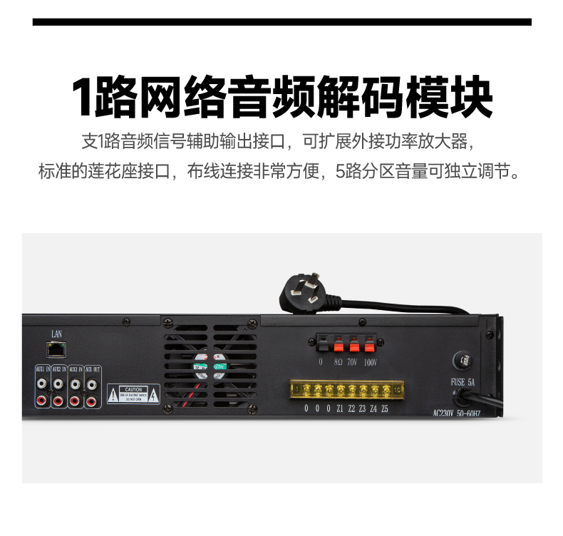 4.内置1路网络硬件音频解码模块,支持TCP/IP、UDP,实现网络化传输16位CD音质的音频信号;