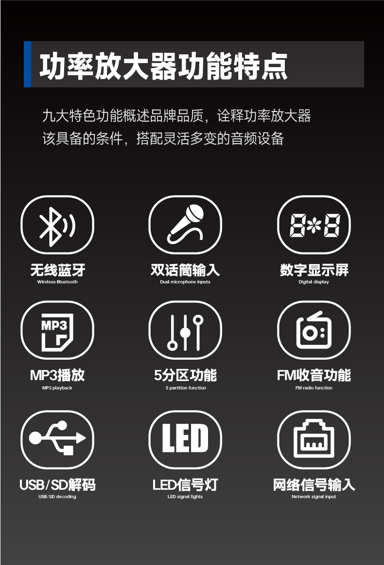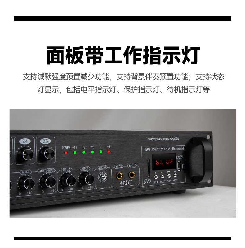 12.支持缄默强度预置减少功能,支持背景伴奏预置功能;支持状态灯显示,包括电平指示灯、保护指示灯、待机指示灯等;