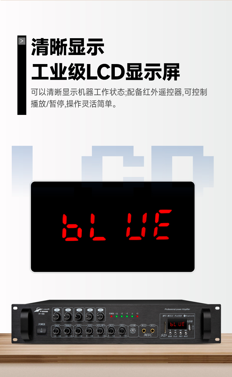 2.工业级LCD显示屏,可以清晰显示机器工作状态;配备红外遥控器,可控制播放/暂停,操作灵活简单;