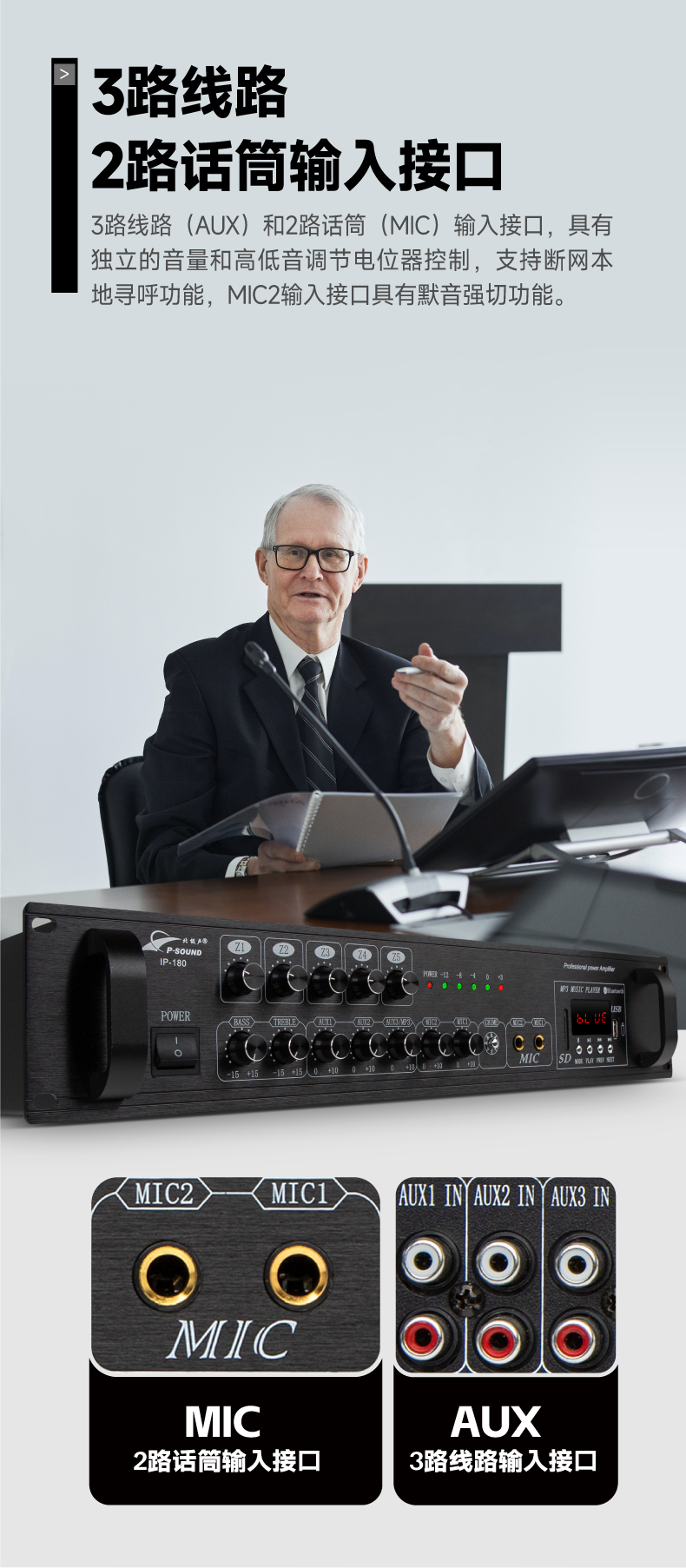 6.3路线路(AUX)和2路话筒(MIC)输入接口,具有独立的音量和高低音调节电位器控制,支持断网本地寻呼功能;