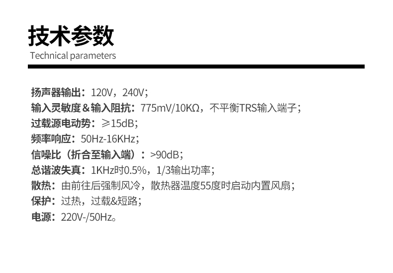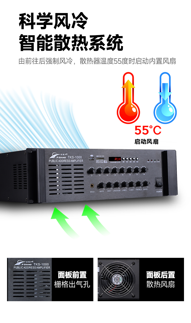 2.设备具有良好的短路、过载、过热等自我保护,散热风机温控启动及关闭,功放温度实时监控,温控增益智能调节,高温下增益自动下调,温度越高下调力度越大,使整机工作更加稳定;