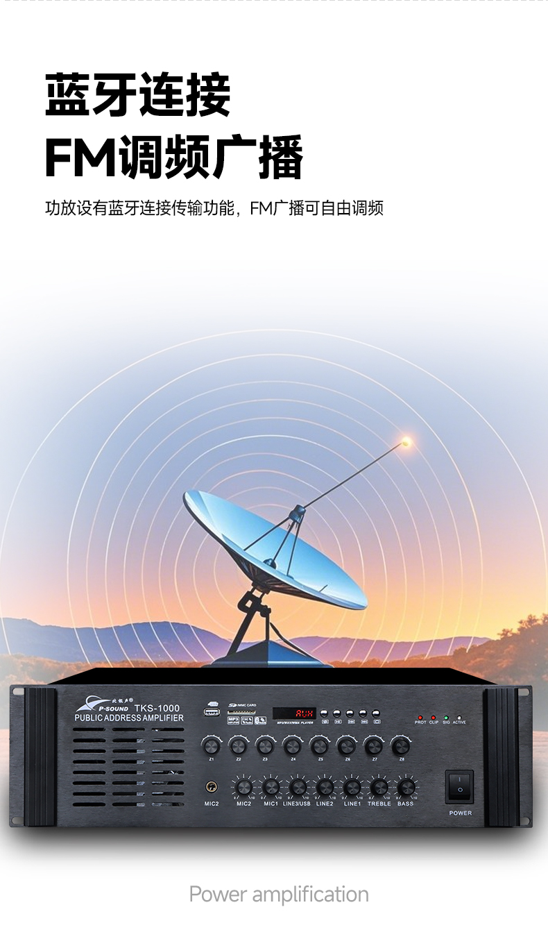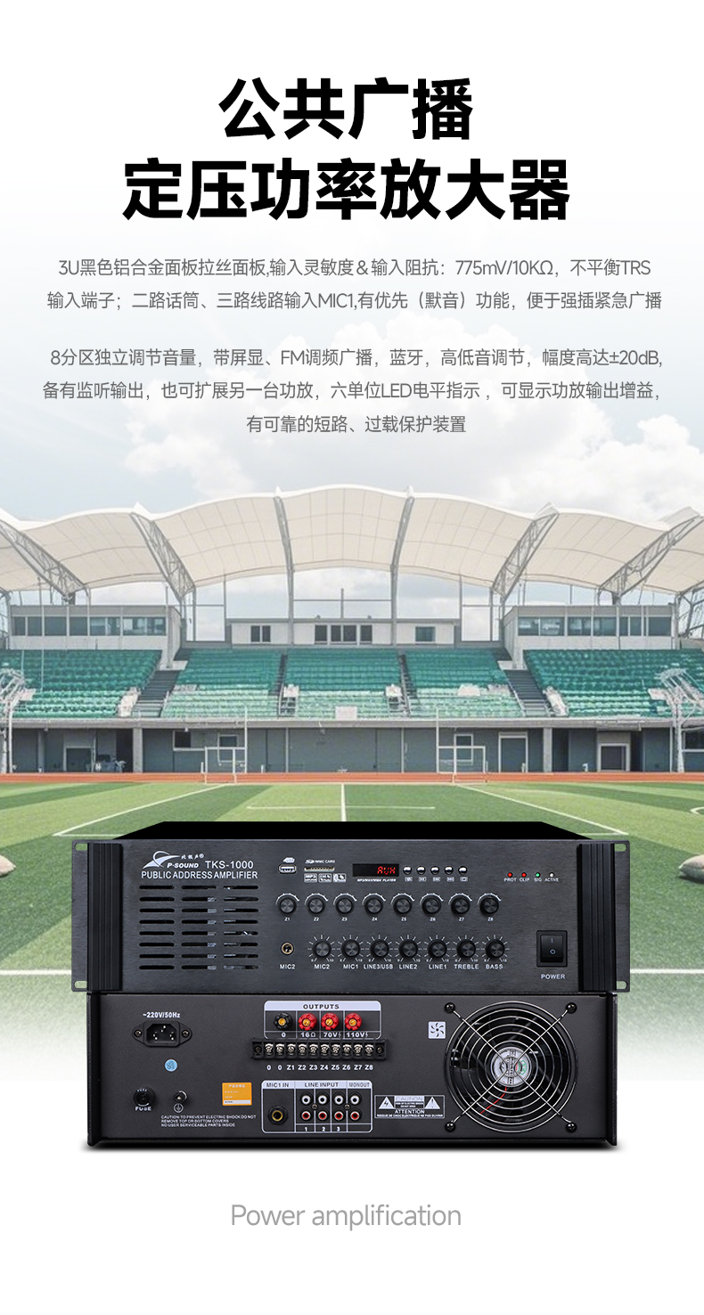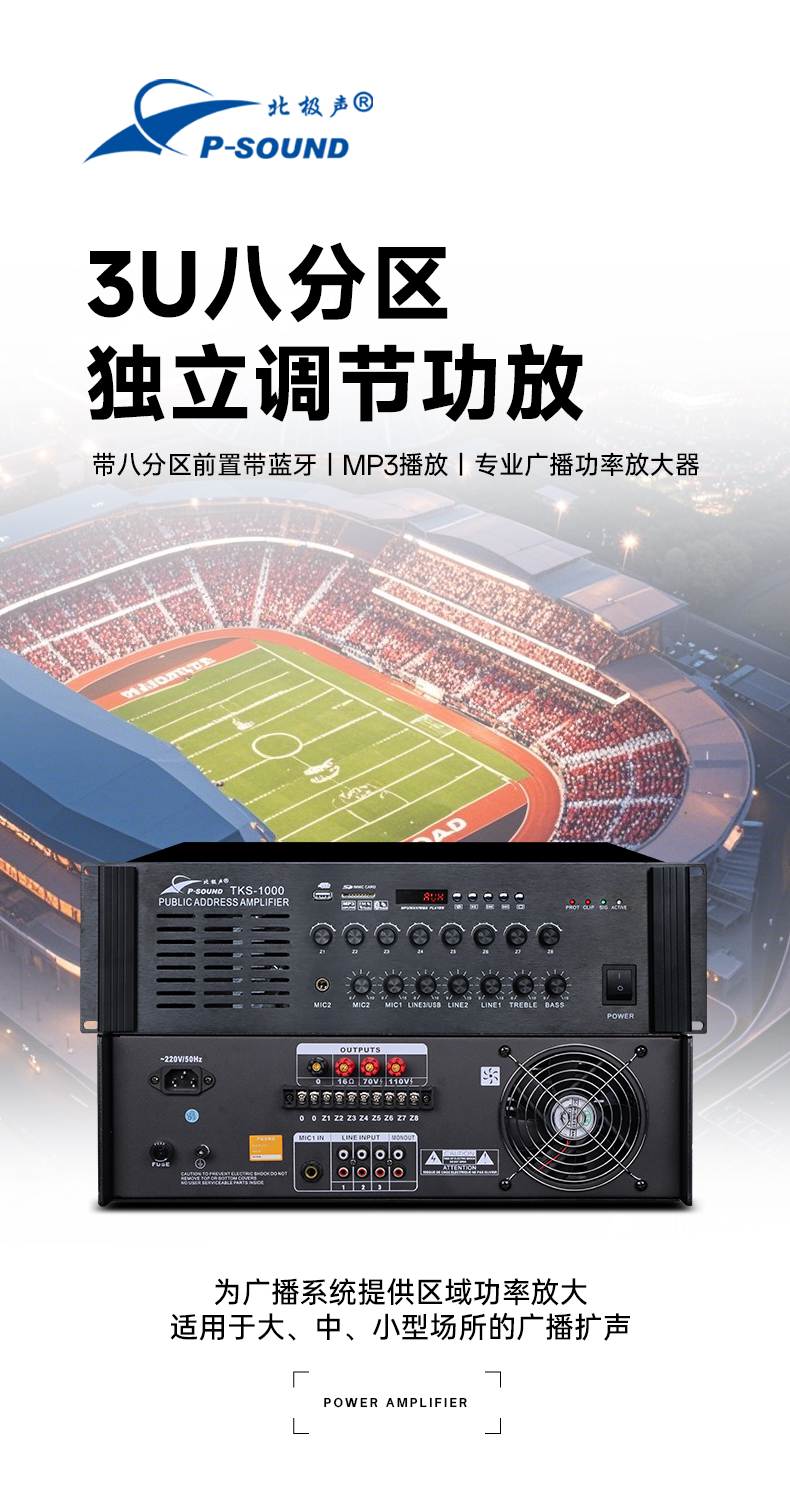 1.带八分区独立调节,带前置、蓝牙、MP3播放,专业广播功率放大器,为广播系统提供区域功率放大,适用于大、中、小型场所的广播扩声;