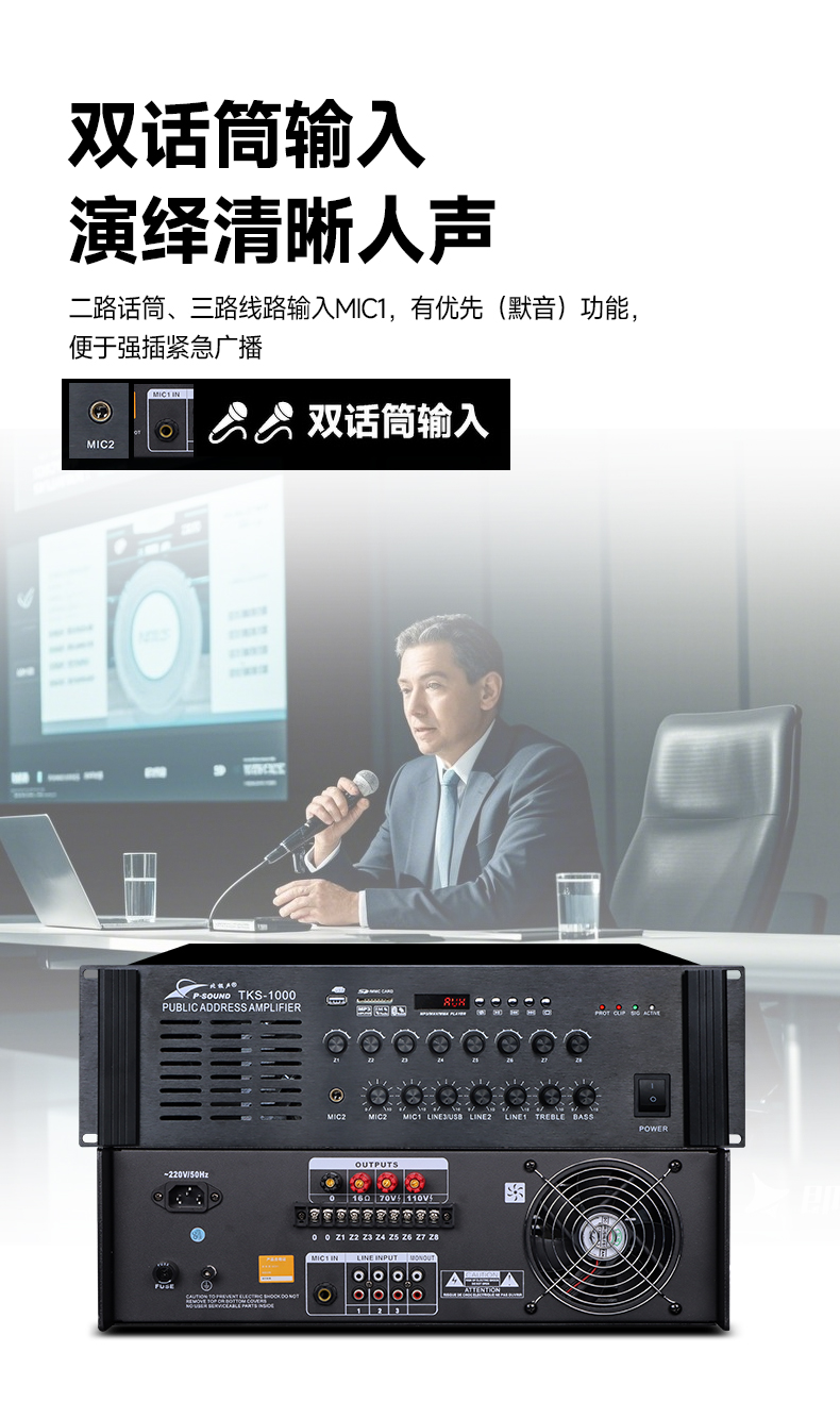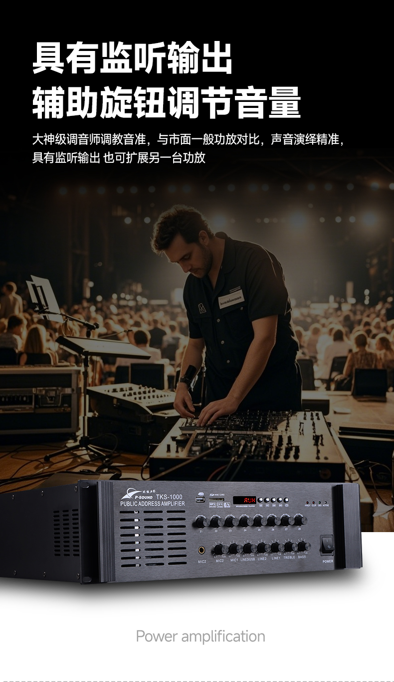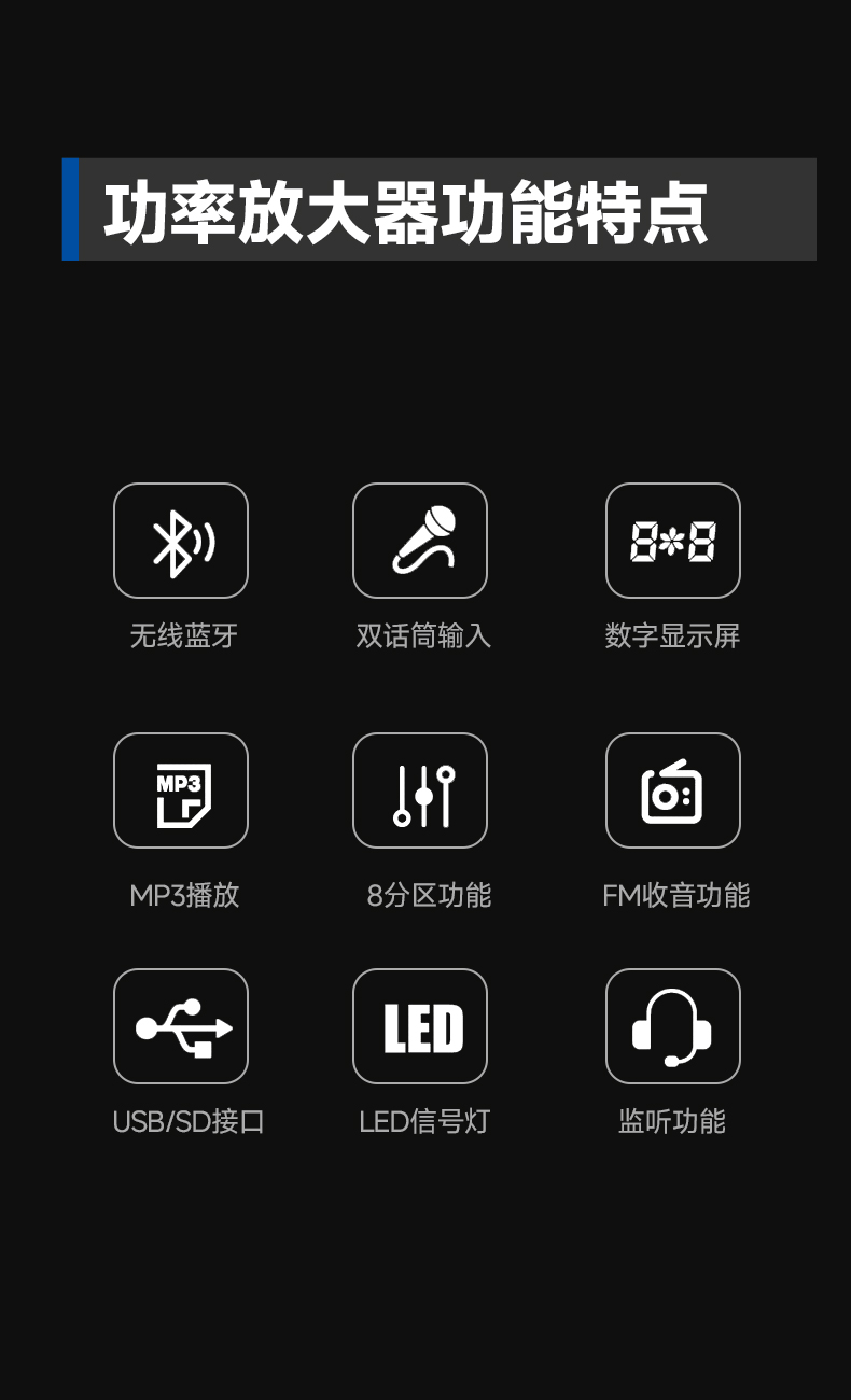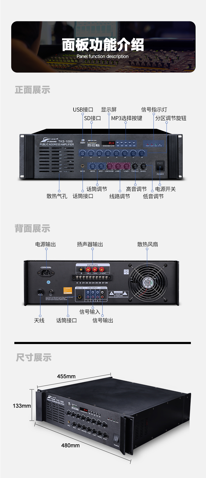 1.带八分区独立调节,带前置、蓝牙、MP3播放,专业广播功率放大器,为广播系统提供区域功率放大,适用于大、中、小型场所的广播扩声;