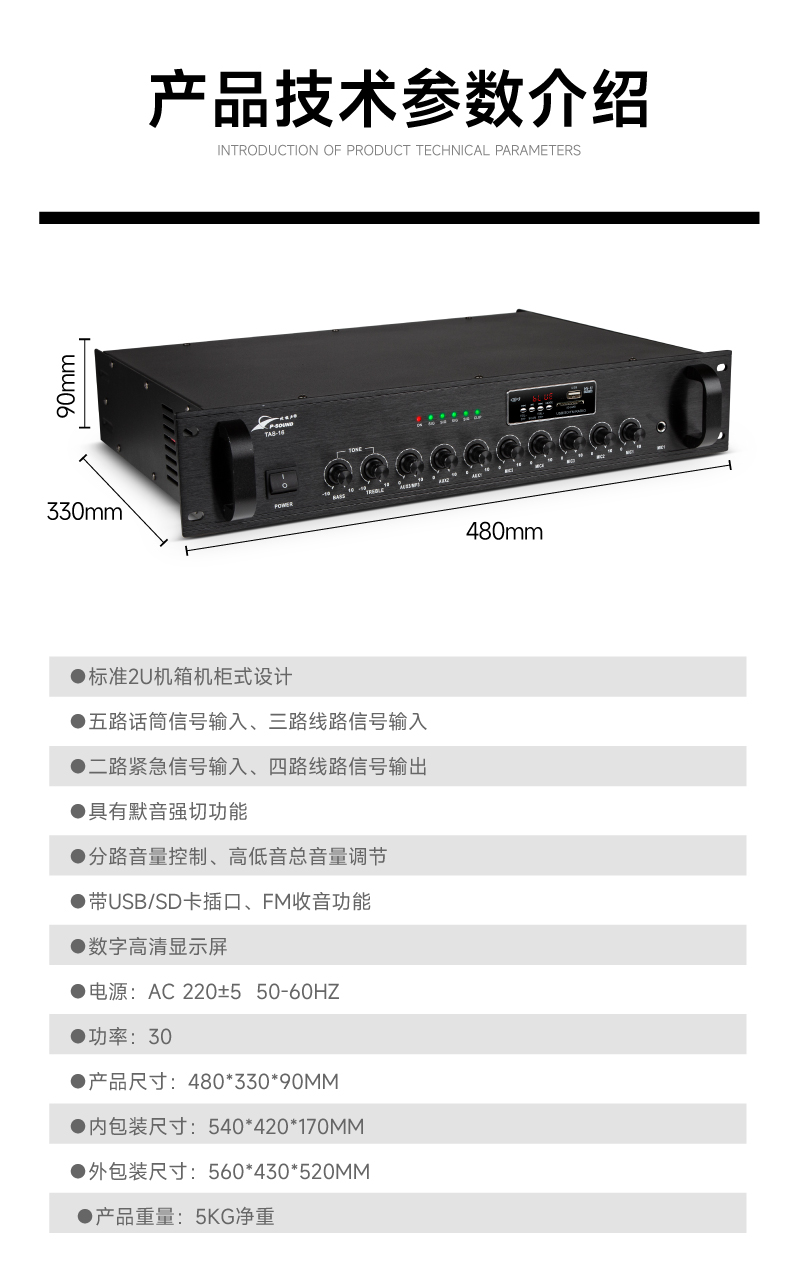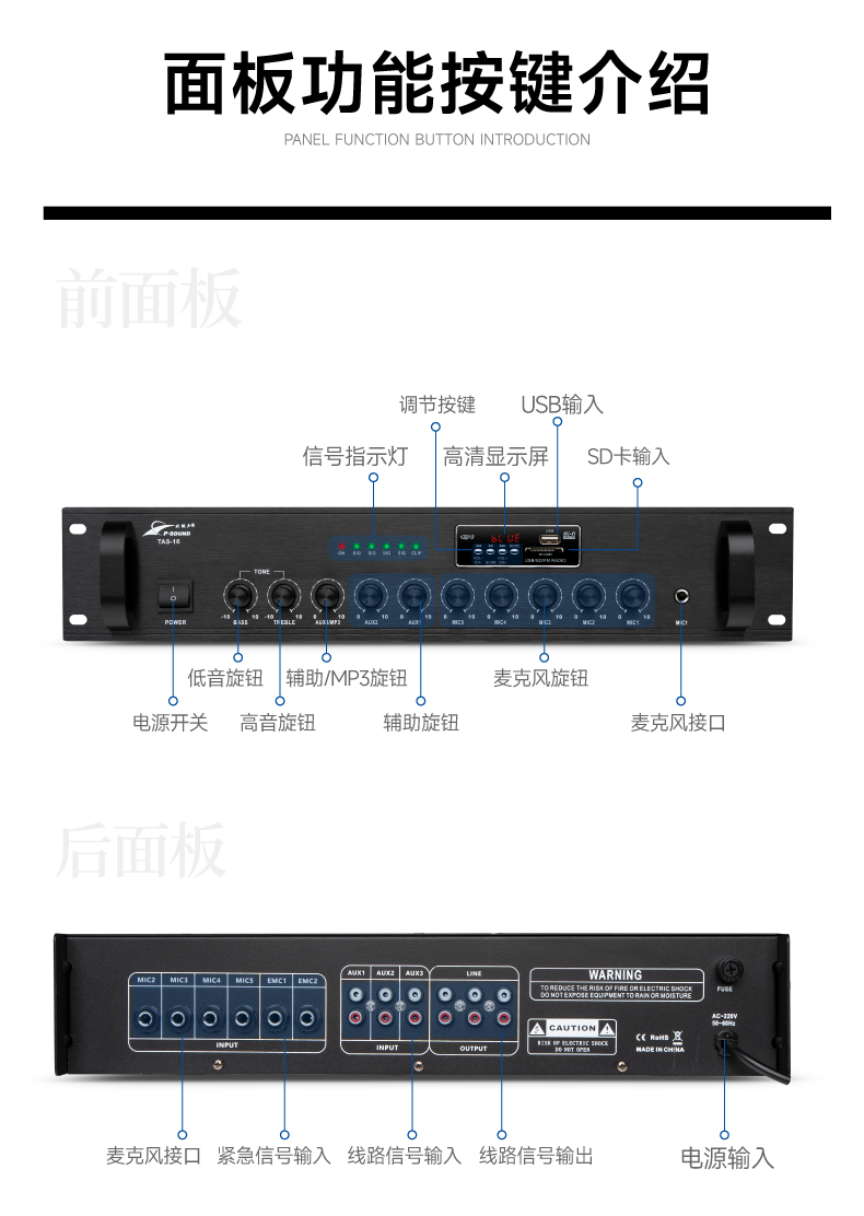 2.具有5路话筒(MIC)输入,3路标准信号线路(AUX)输入,2路紧急线路(EMC)输入;