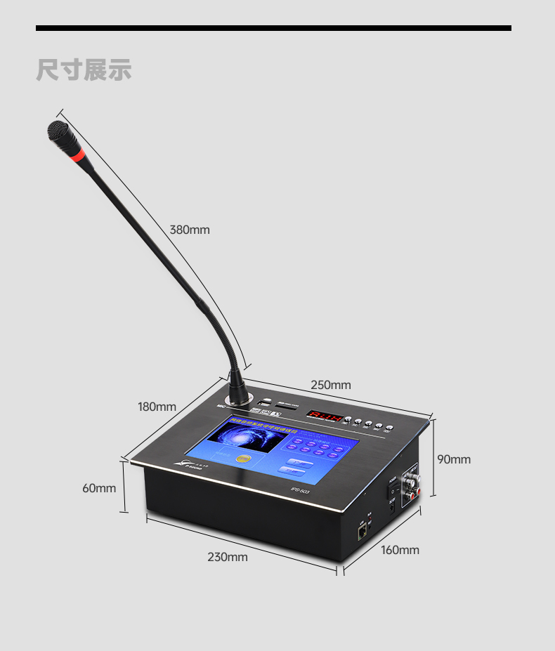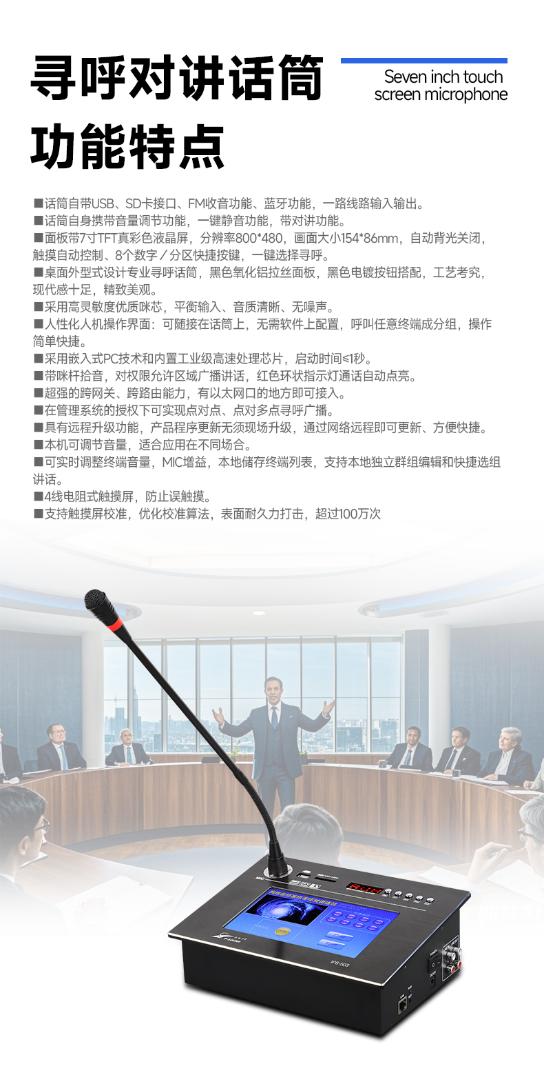■面板带7寸TFT真彩色液晶屏,分辨率800*480,画面大小154*86mm,自动背光关闭,触摸自动控制,8个数字/分区快捷按键,一键选择寻呼;