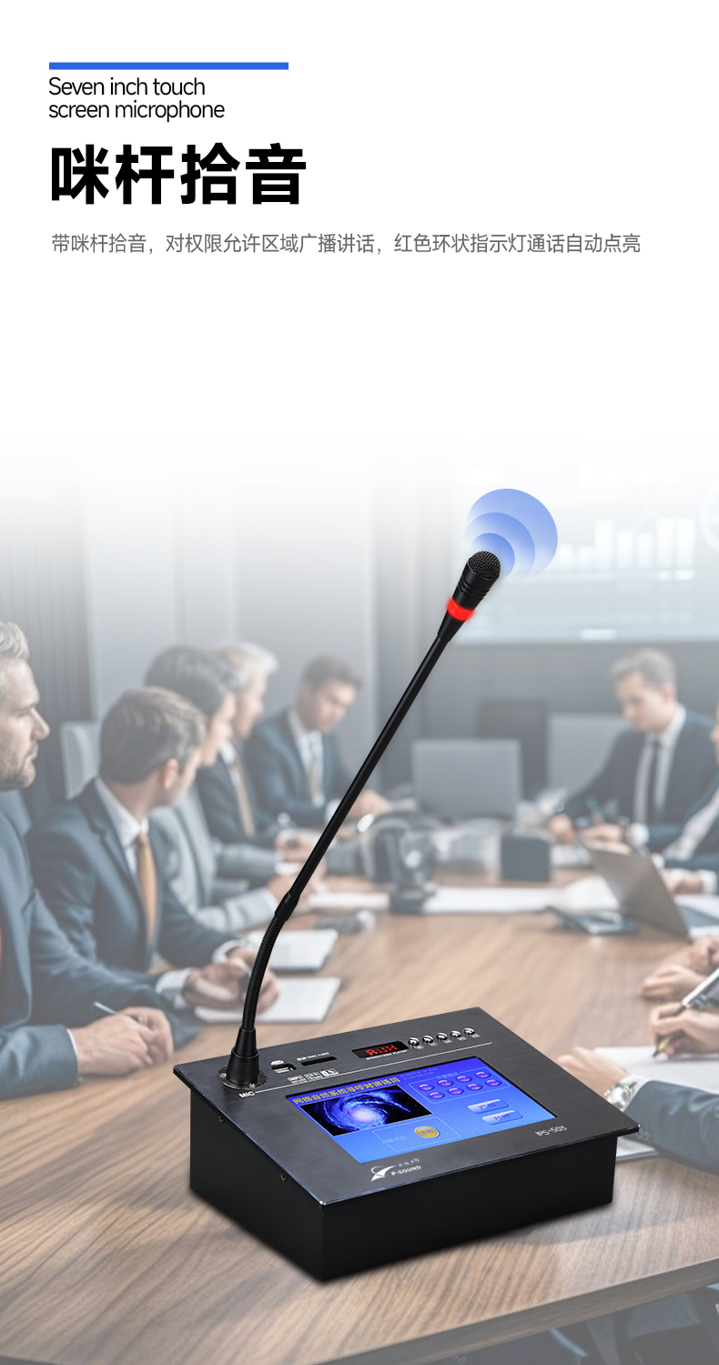 ■带咪杆拾音,对权限允许区域广播讲话,红色环状指示灯通话自动点亮;