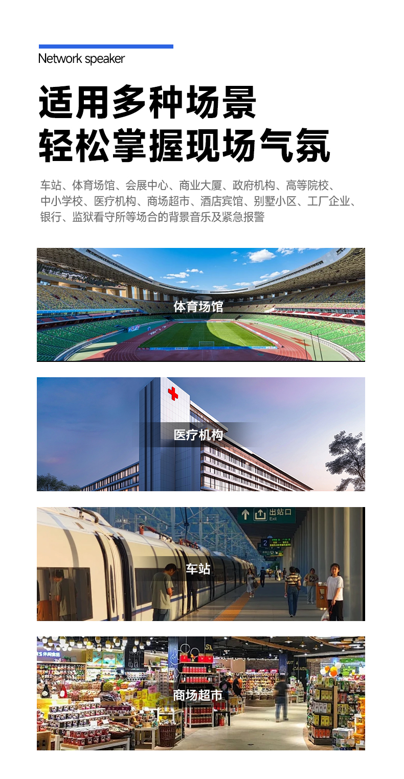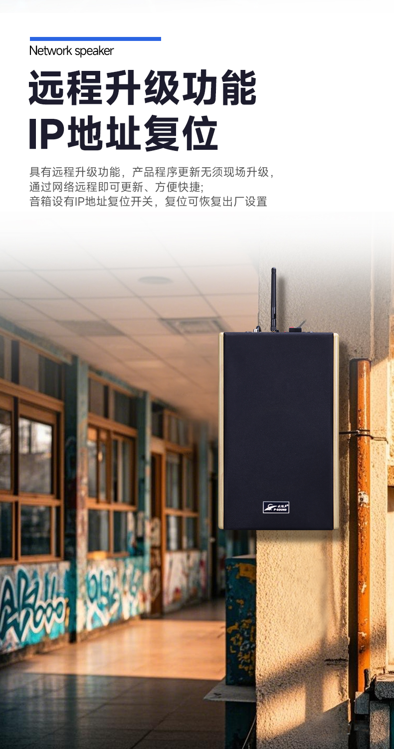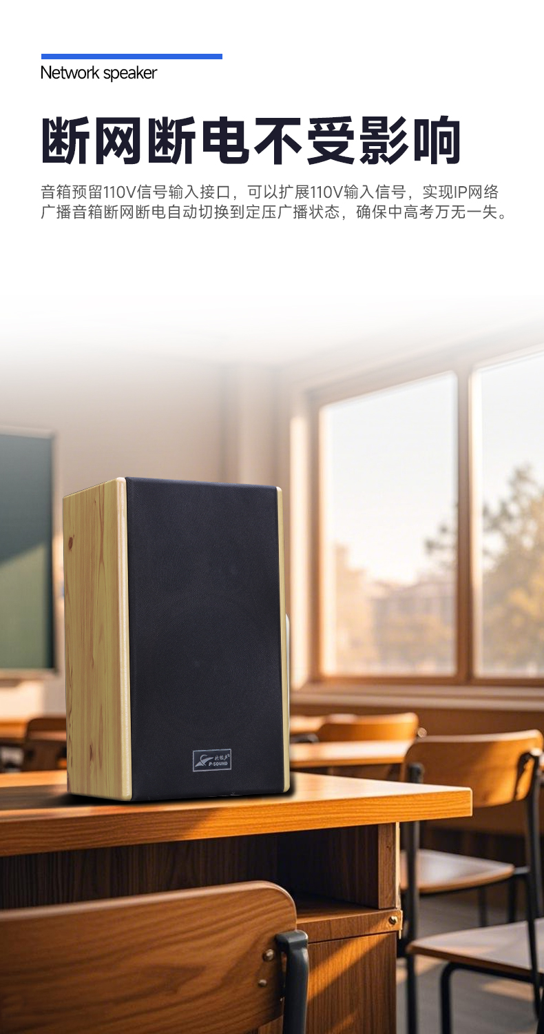 ■音箱预留110V信号输入接口,可以扩展110V输入信号,实现IP网络广播音箱断网断电自动切换到定压广播状态,确保中高考万无一失;