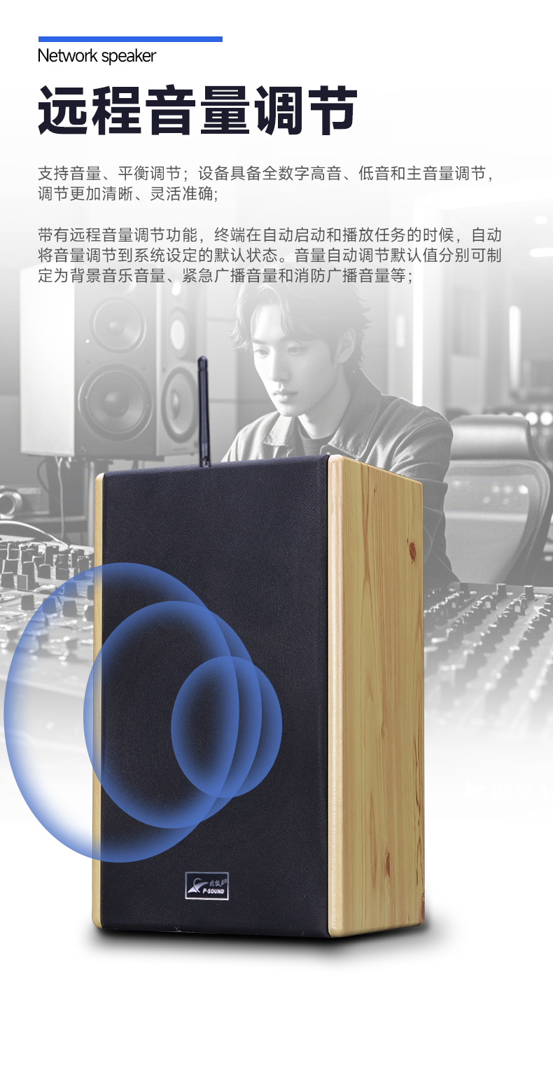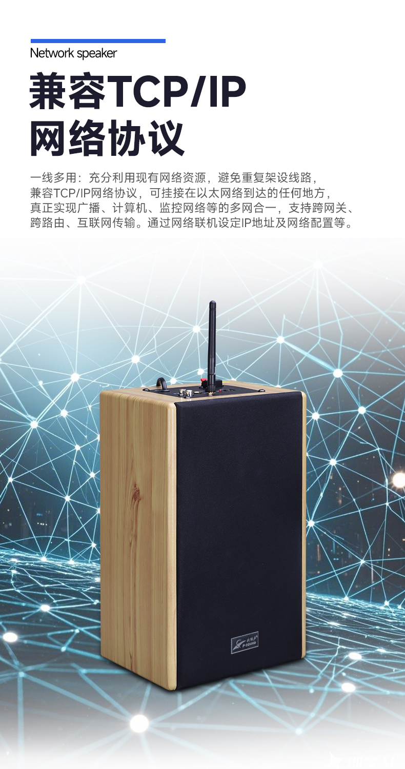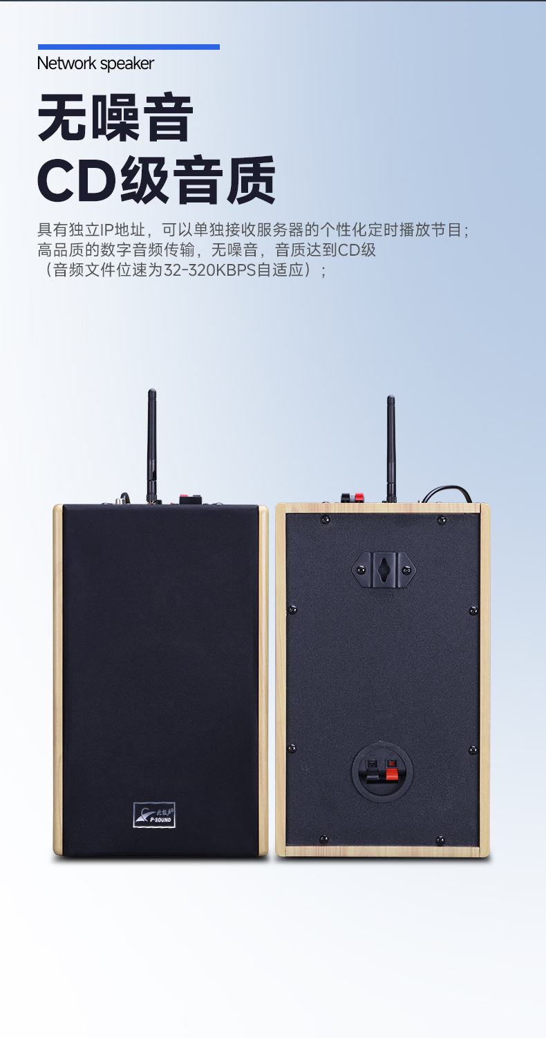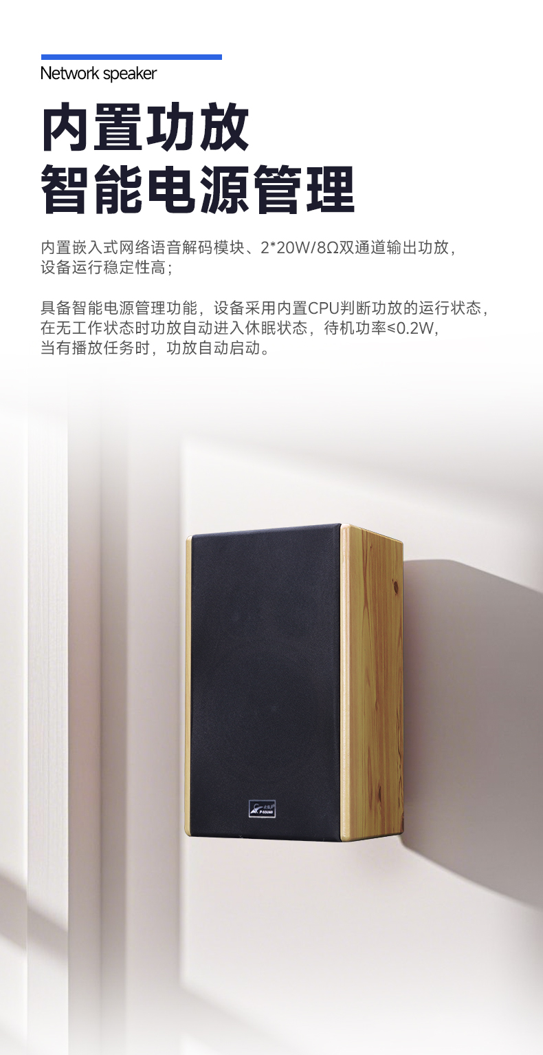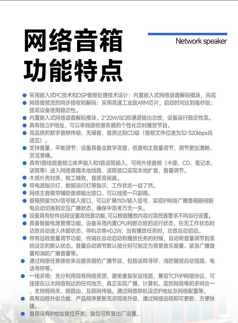 ■内置嵌入式网络语音解码模块、2*20W/8Ω双通道输出功放,设备运行稳定性高;